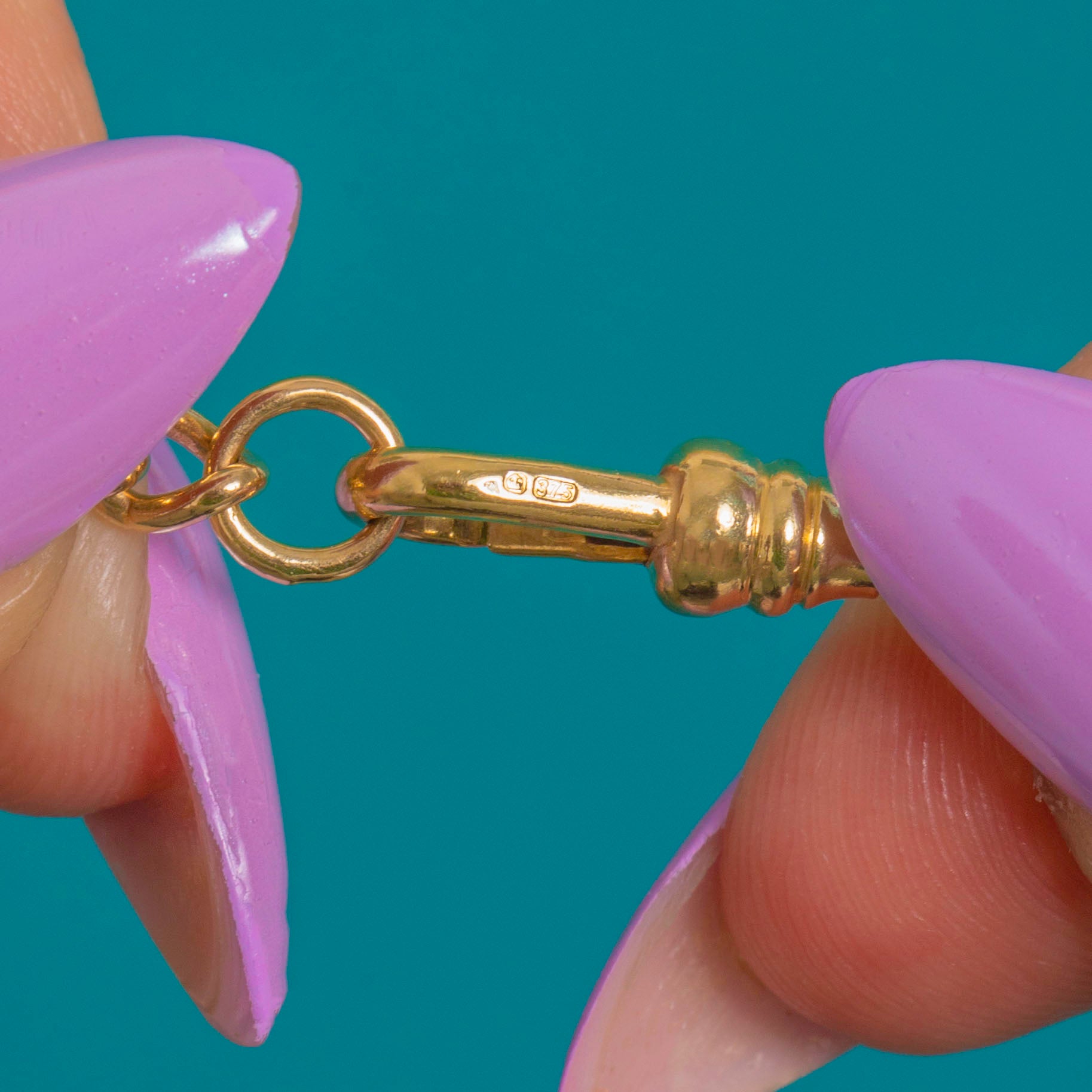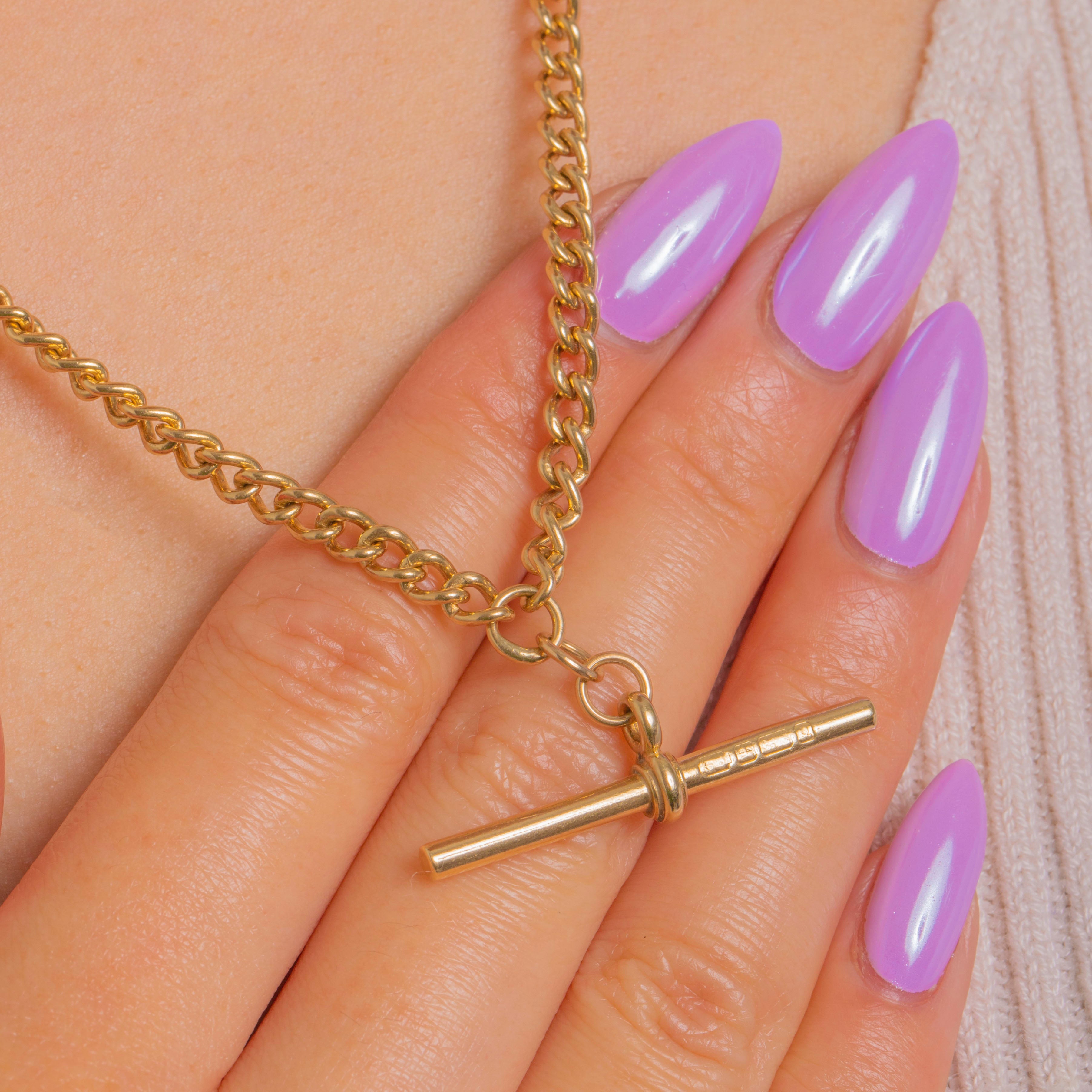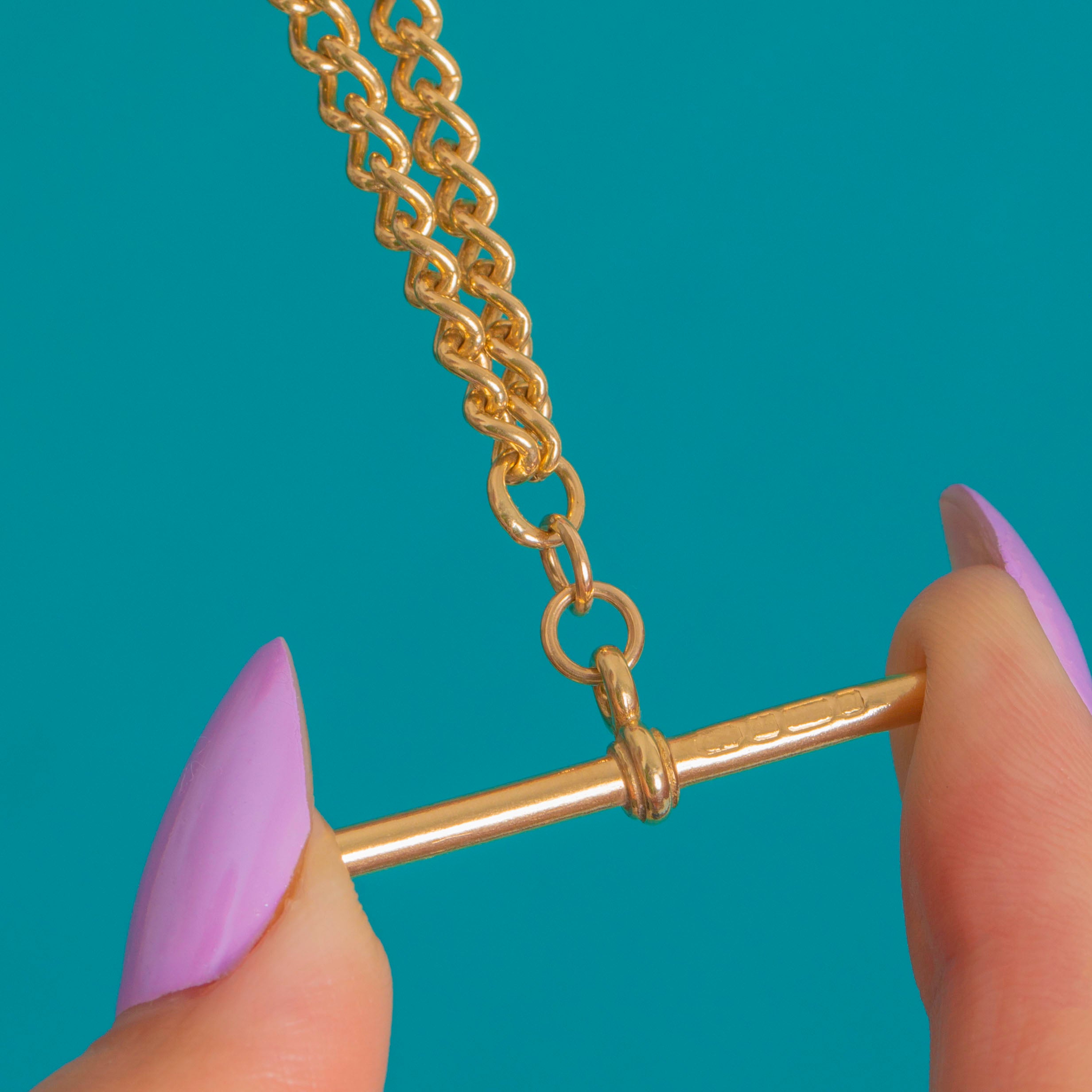 This vintage Albert chain is a wonderfully classic piece, crafted in bright 9ct Gold and fitted with both a dog-clip and T-bar. With its traditional curb links and substantial 18.1g weight, it has all the timeless appeal of a handsome antique watch chain, reimagined as a beautifully wearable necklace.