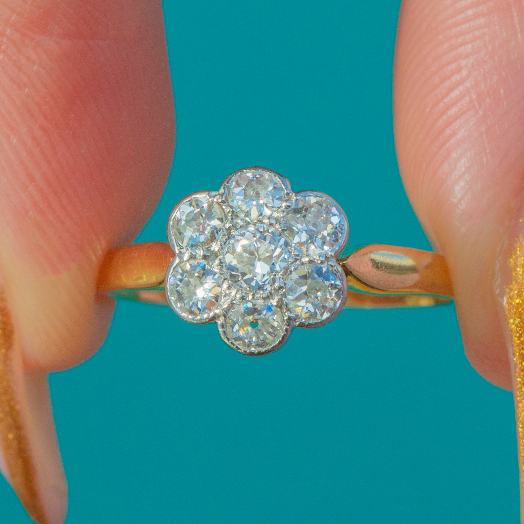 The classic seven-stone daisy design feels timeless and romantic, enhanced by the soft warmth of the 18ct Gold band and the refined Platinum settings. A wonderfully feminine Edwardian jewel—delicate, graceful and perfect as an engagement ring or elegant everyday piece.