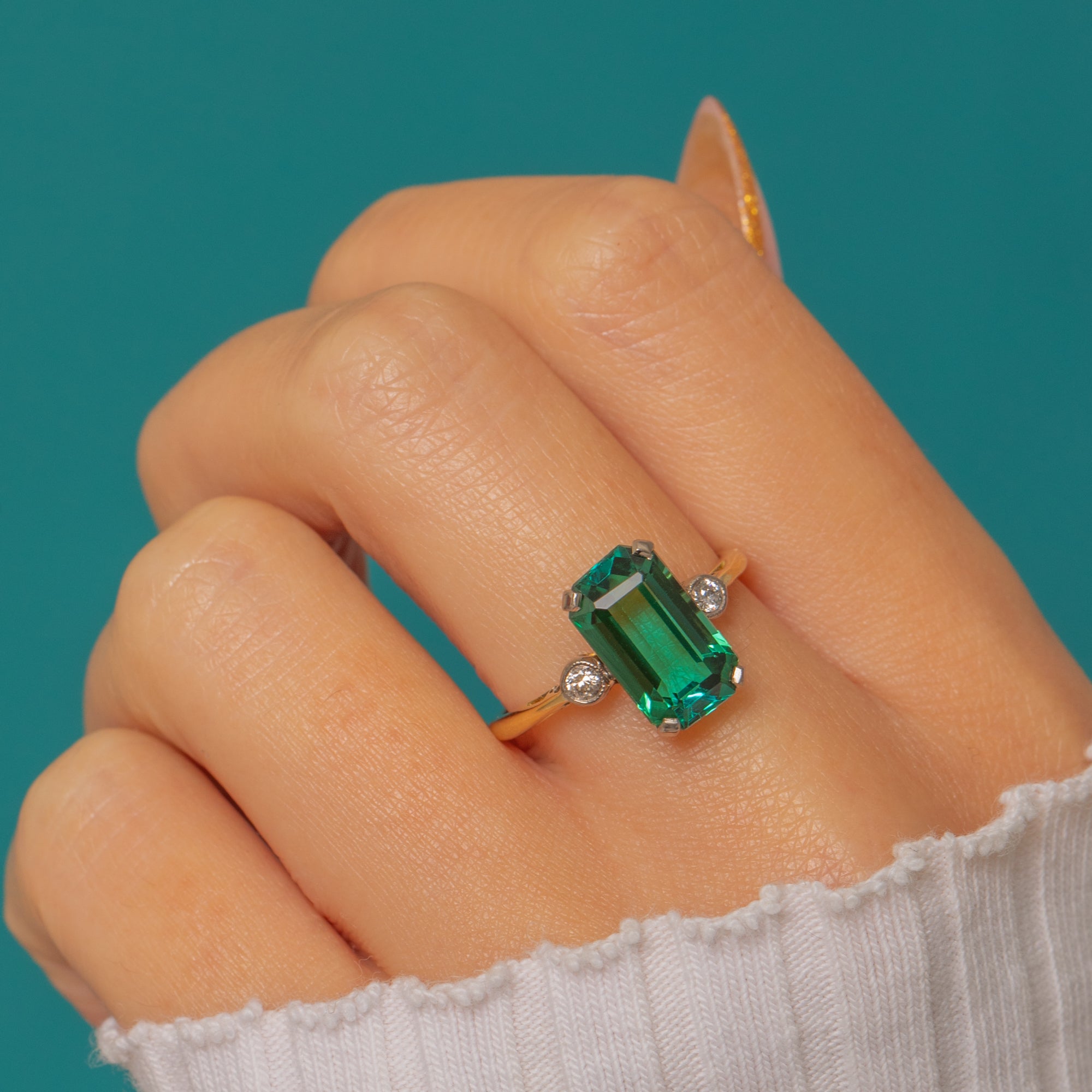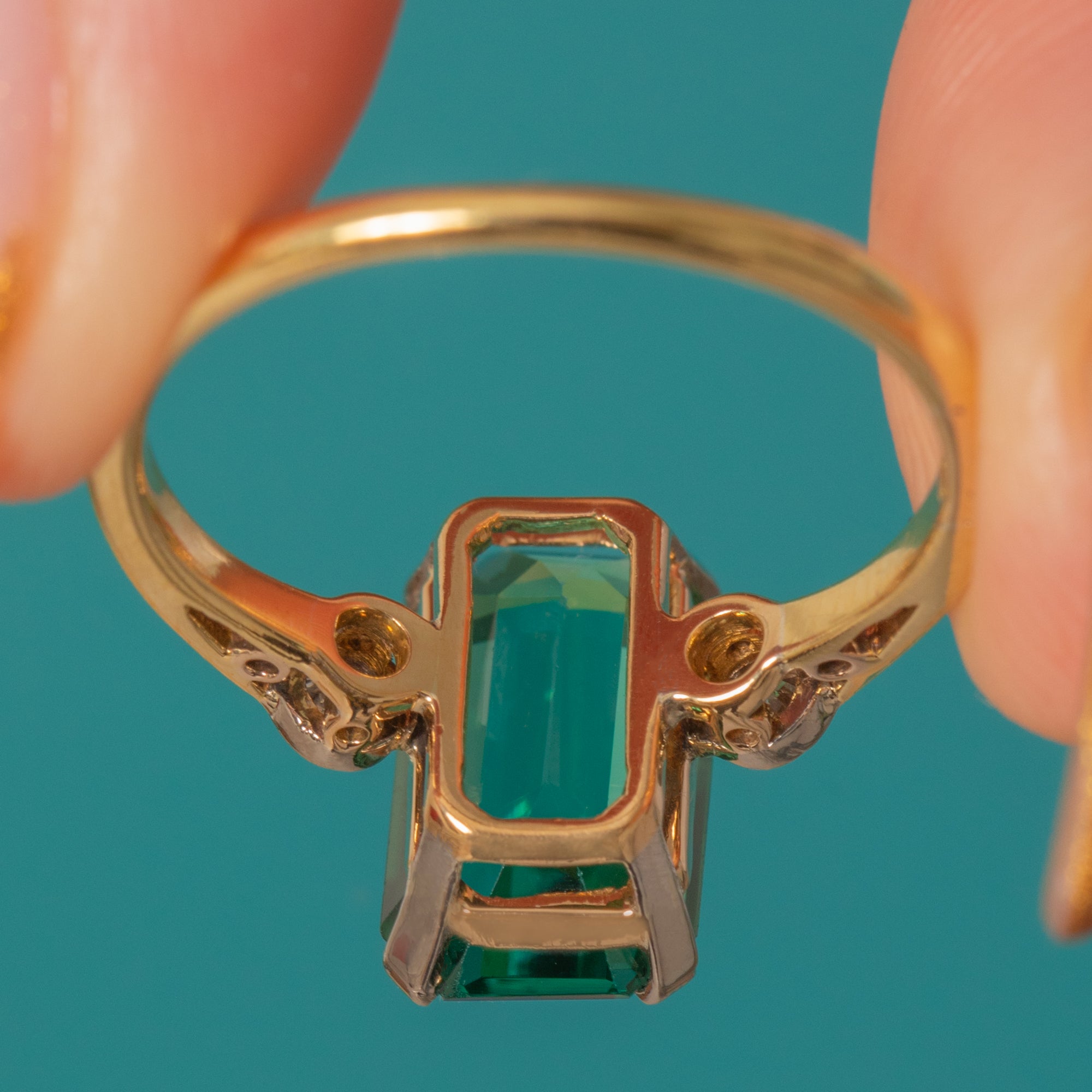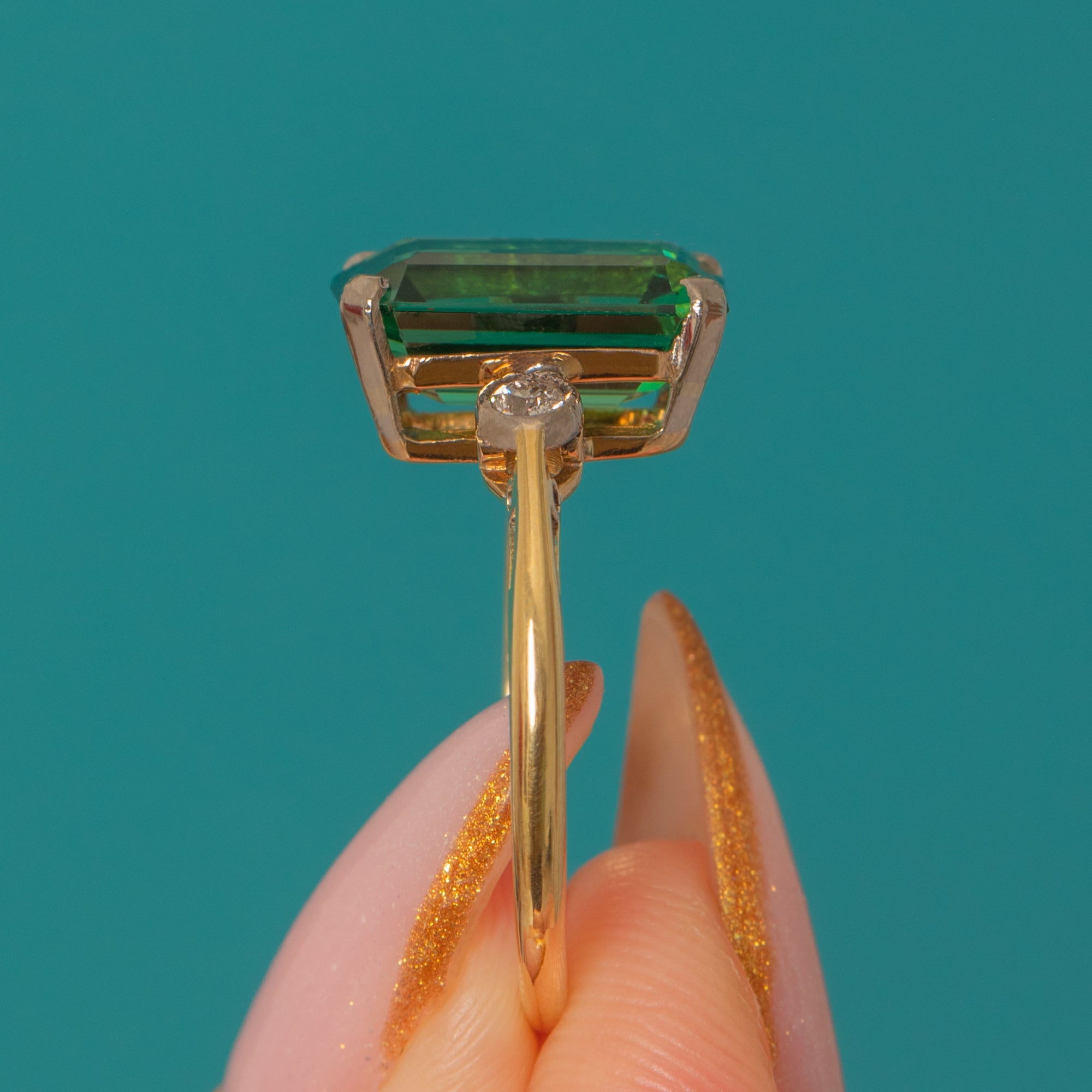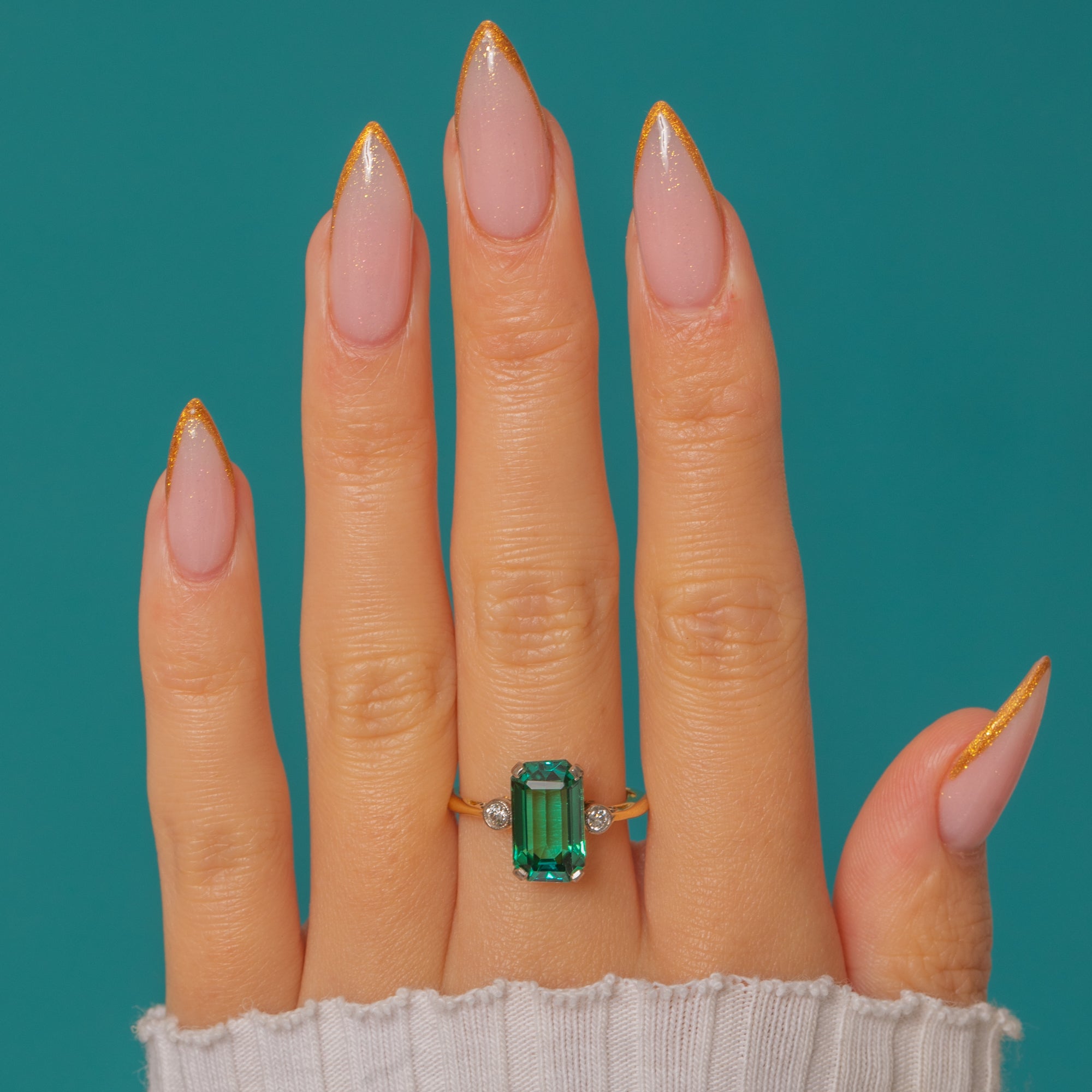 A stunning Art Deco cocktail ring featuring a beautifully saturated green 5.29ct Tourmaline flanked by twinkling antique Diamonds. The Tourmaline’s elongated emerald cut is both elegant and bold, catching the light with every movement.