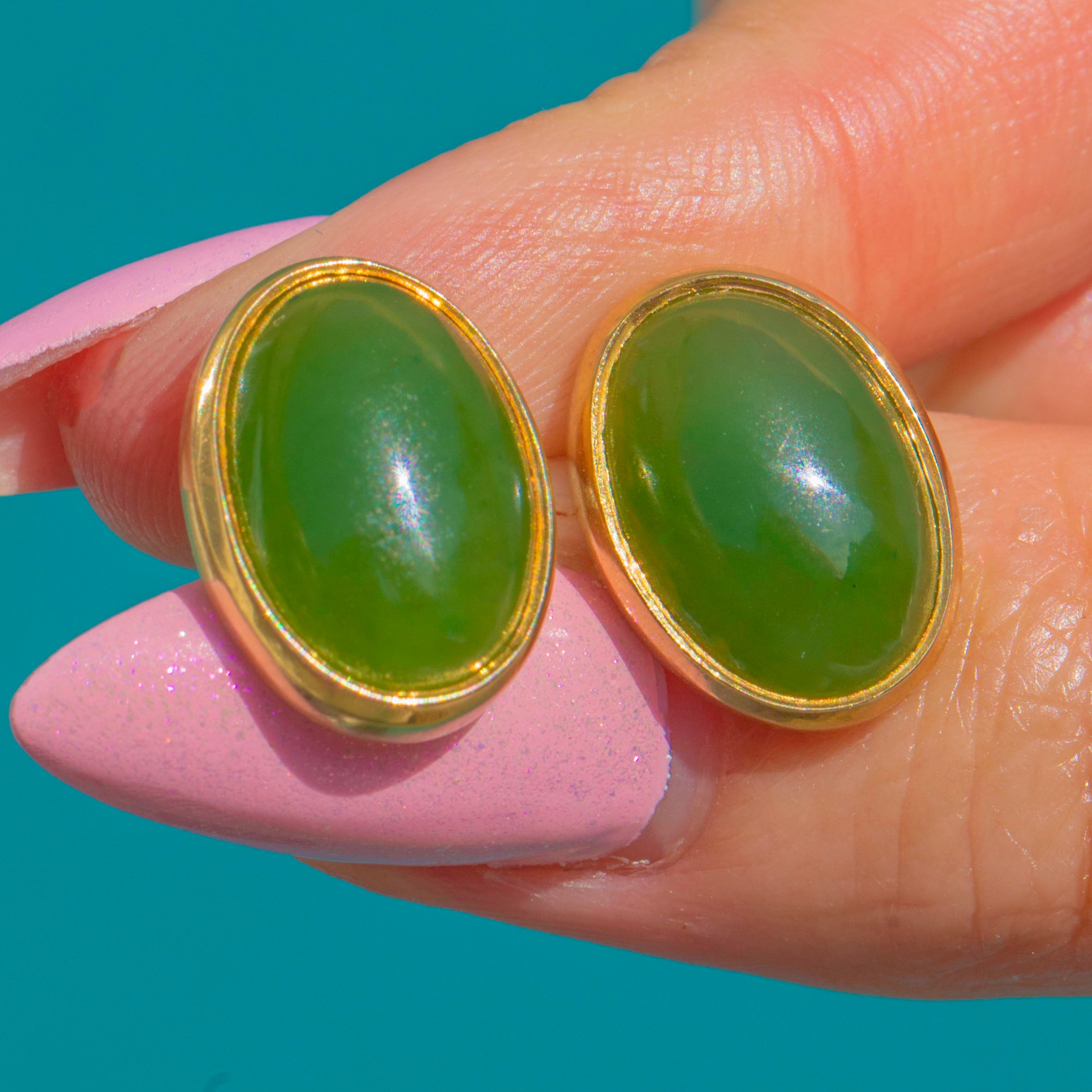 Jade cabochons measure 12.5mm long x 9mm wide x 4mm deep.