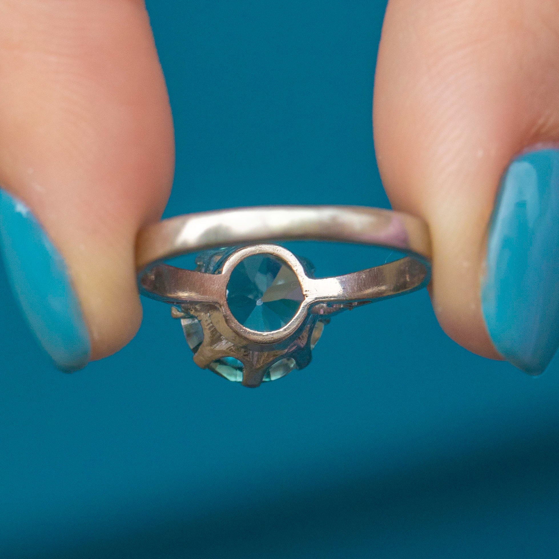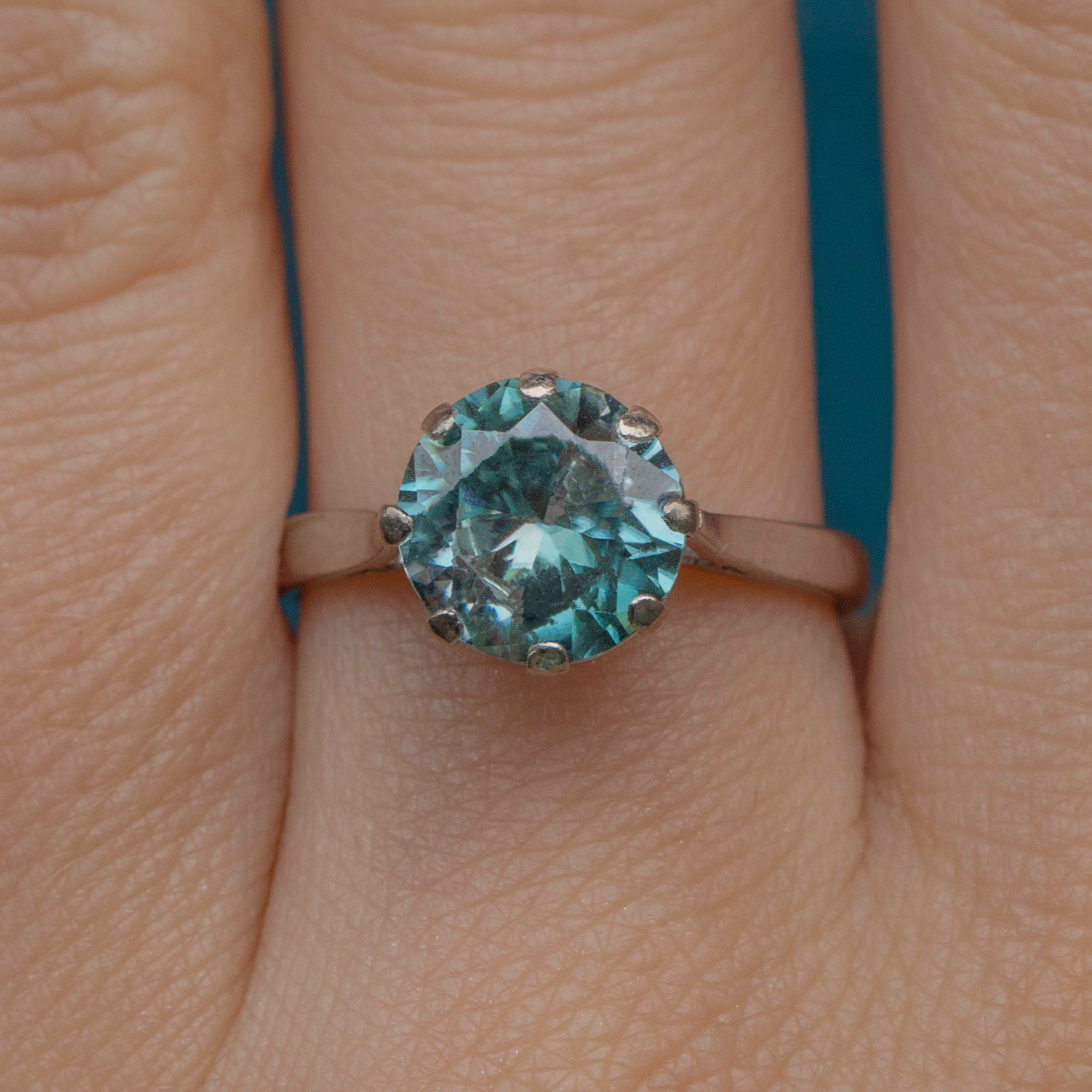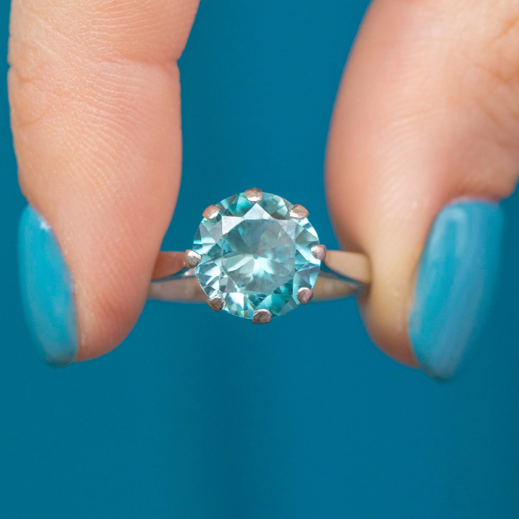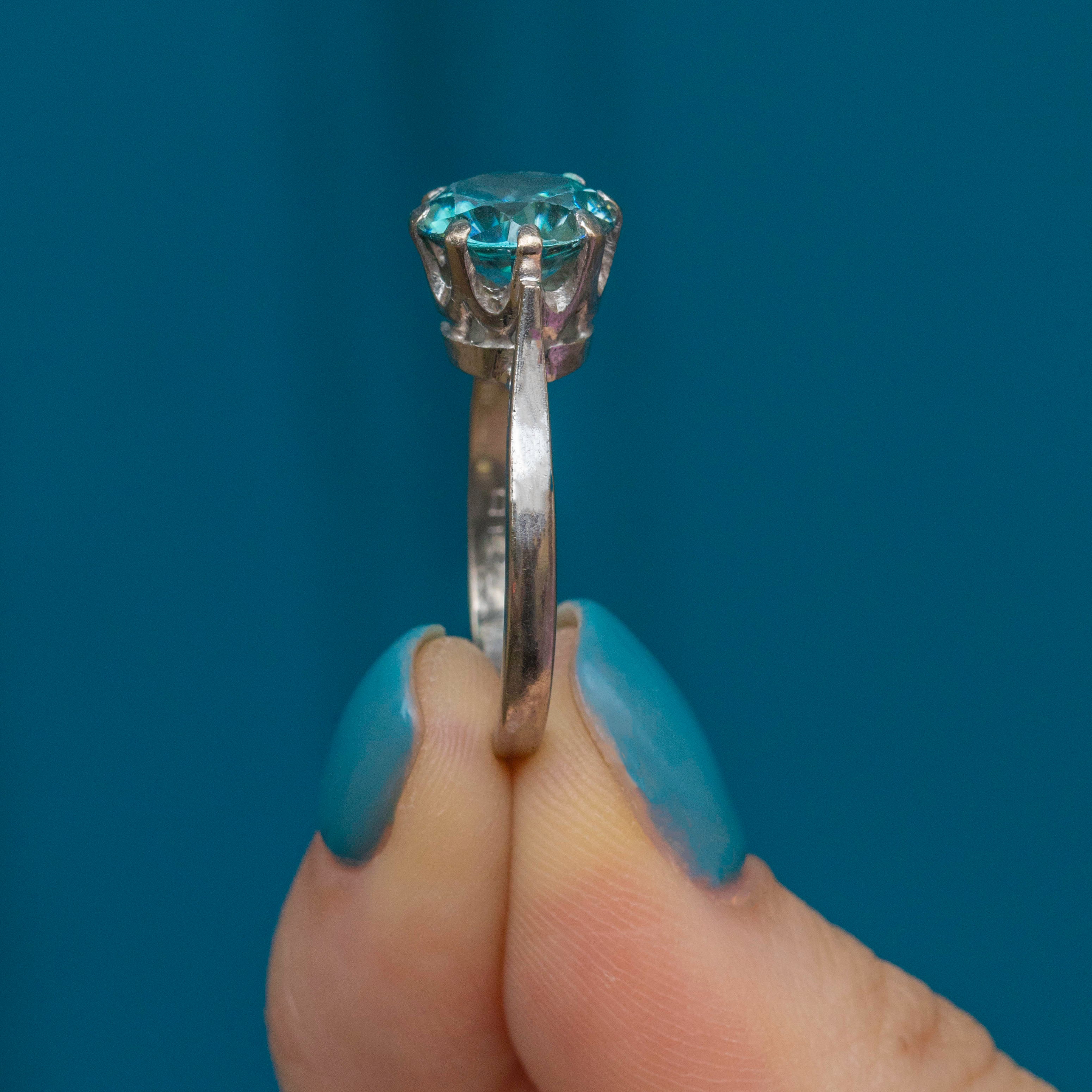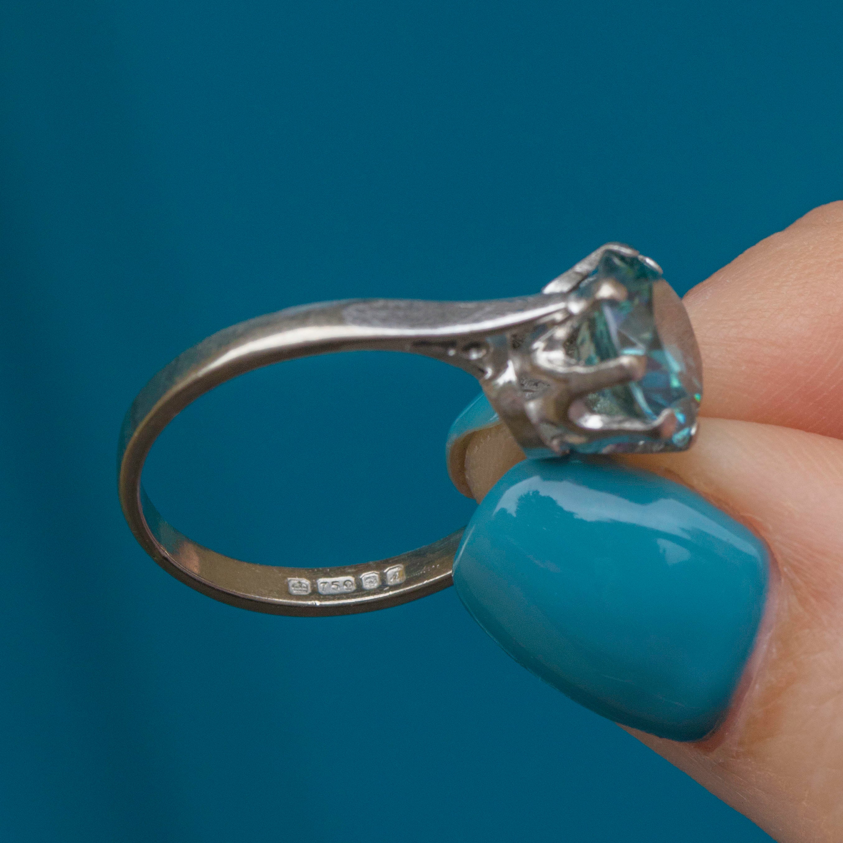 EXCELLENT. This 18ct Gold Blue Zircon ring is in excellent condition. This treasure houses a large blue Zircon gemstone, with only subtle wear to the edge of the facets, only visible under a jewellers loupe. The Zircon is held securely in place by white Gold claw settings and sits prettily on a White Gold band! With a full set of English hallmarks dating to 1975, this is a true vintage treasure that you will enjoy for years to come.