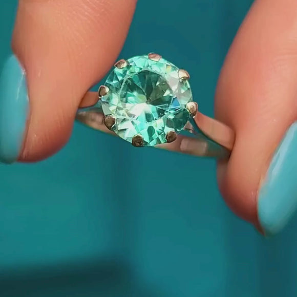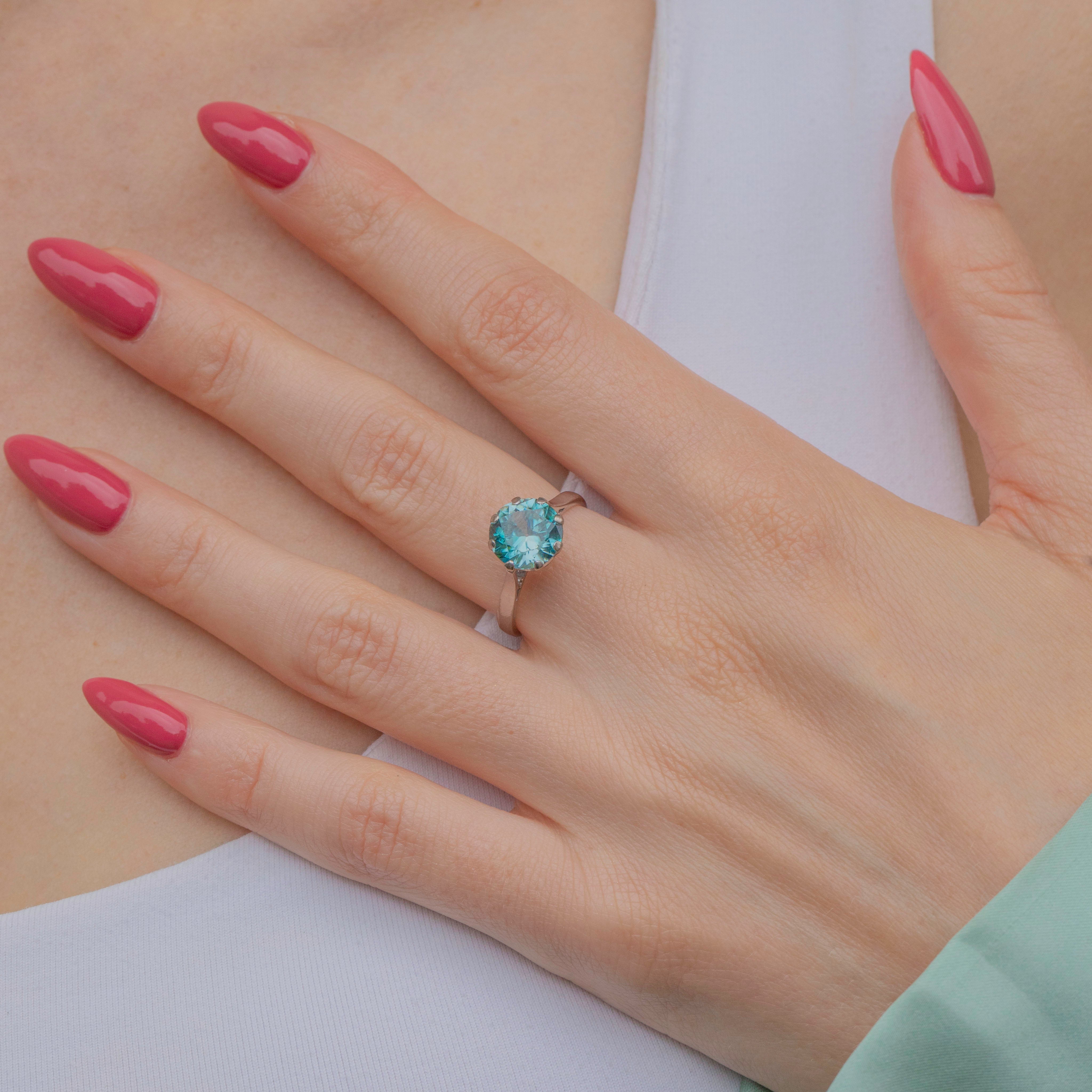 The ring has been crafted from 18ct White Gold, and the bright blue Zircon is held into place by robust claw settings. Blue Zircons are a wonderful stone for providing inner peace, and with one this large you are sure to find it! This Cerulean blue-hued beauty will take your breath away!