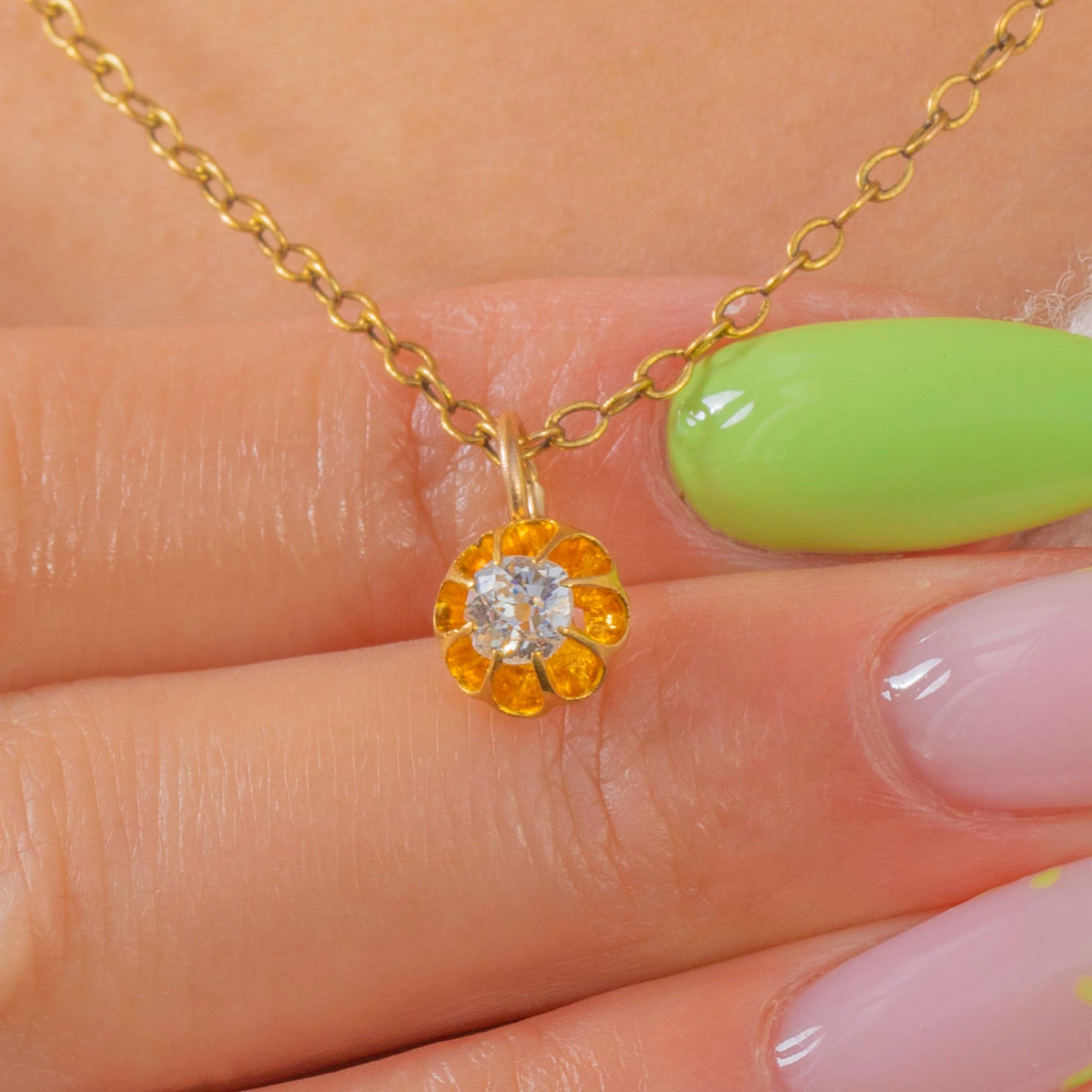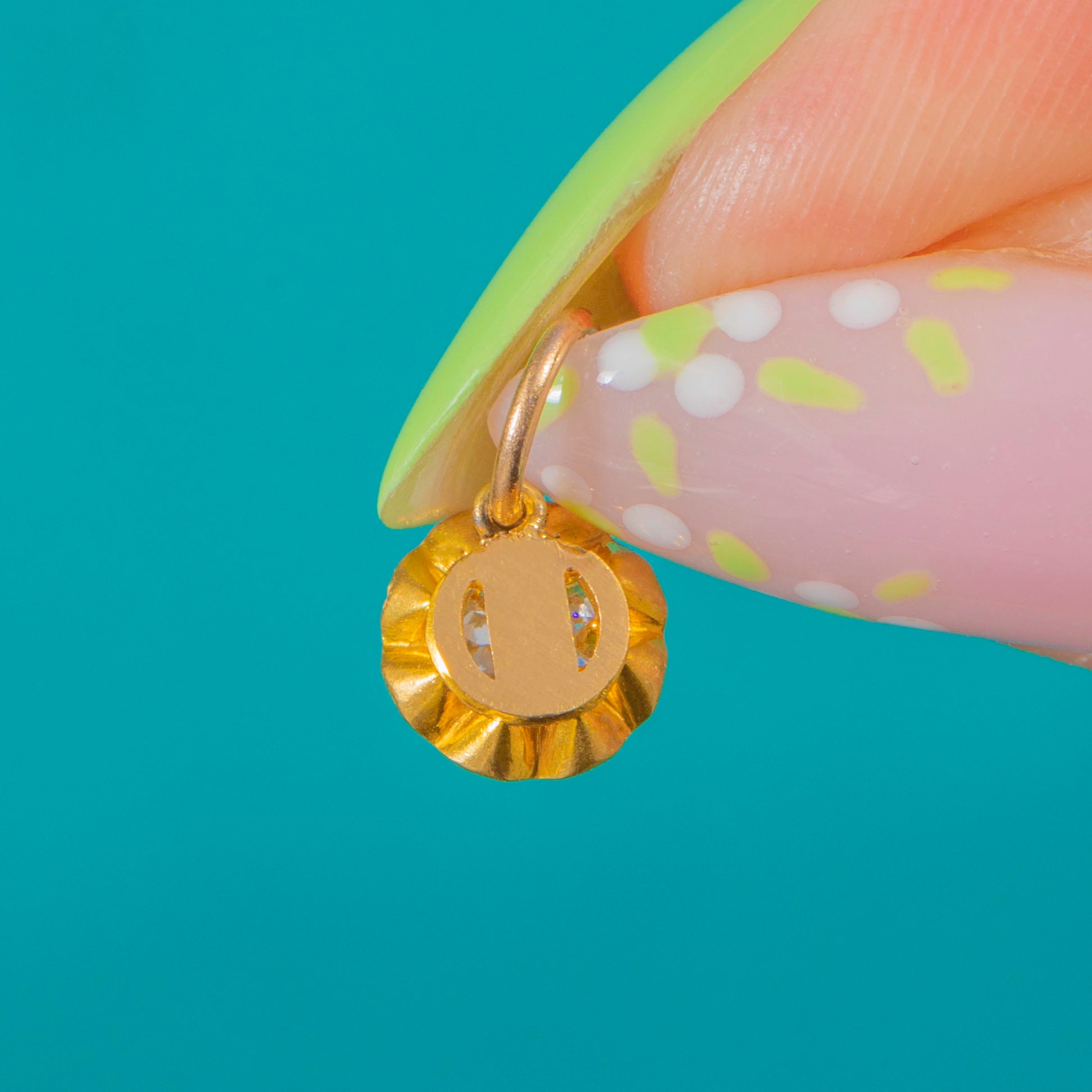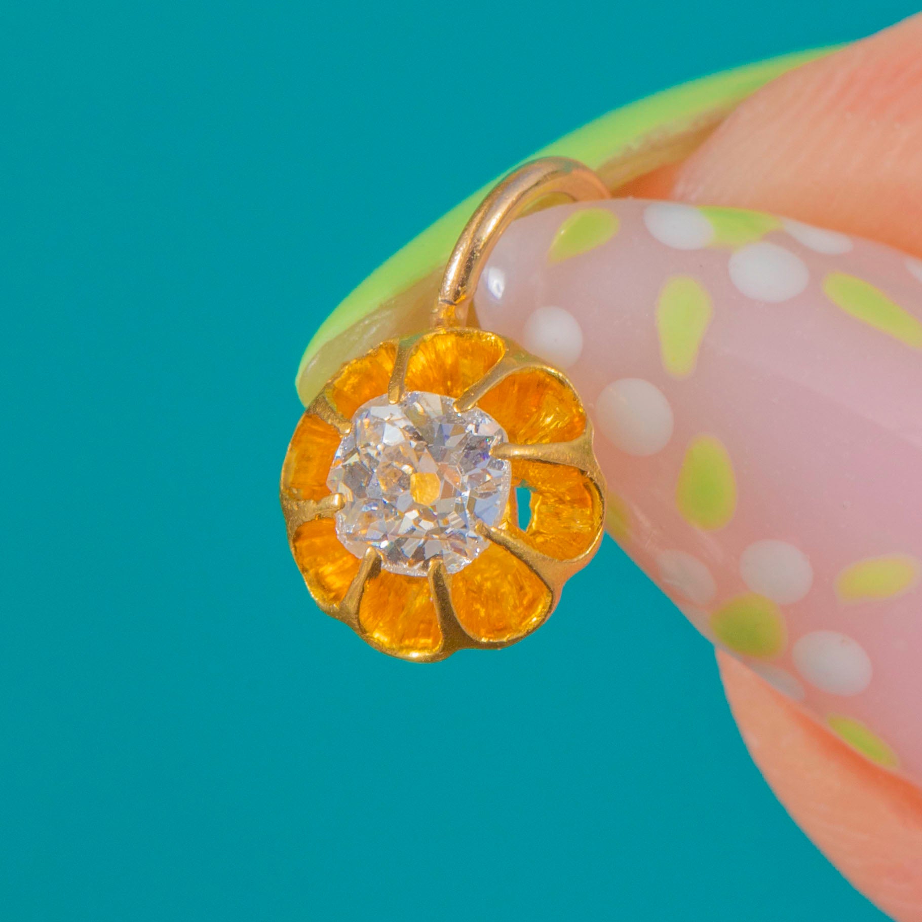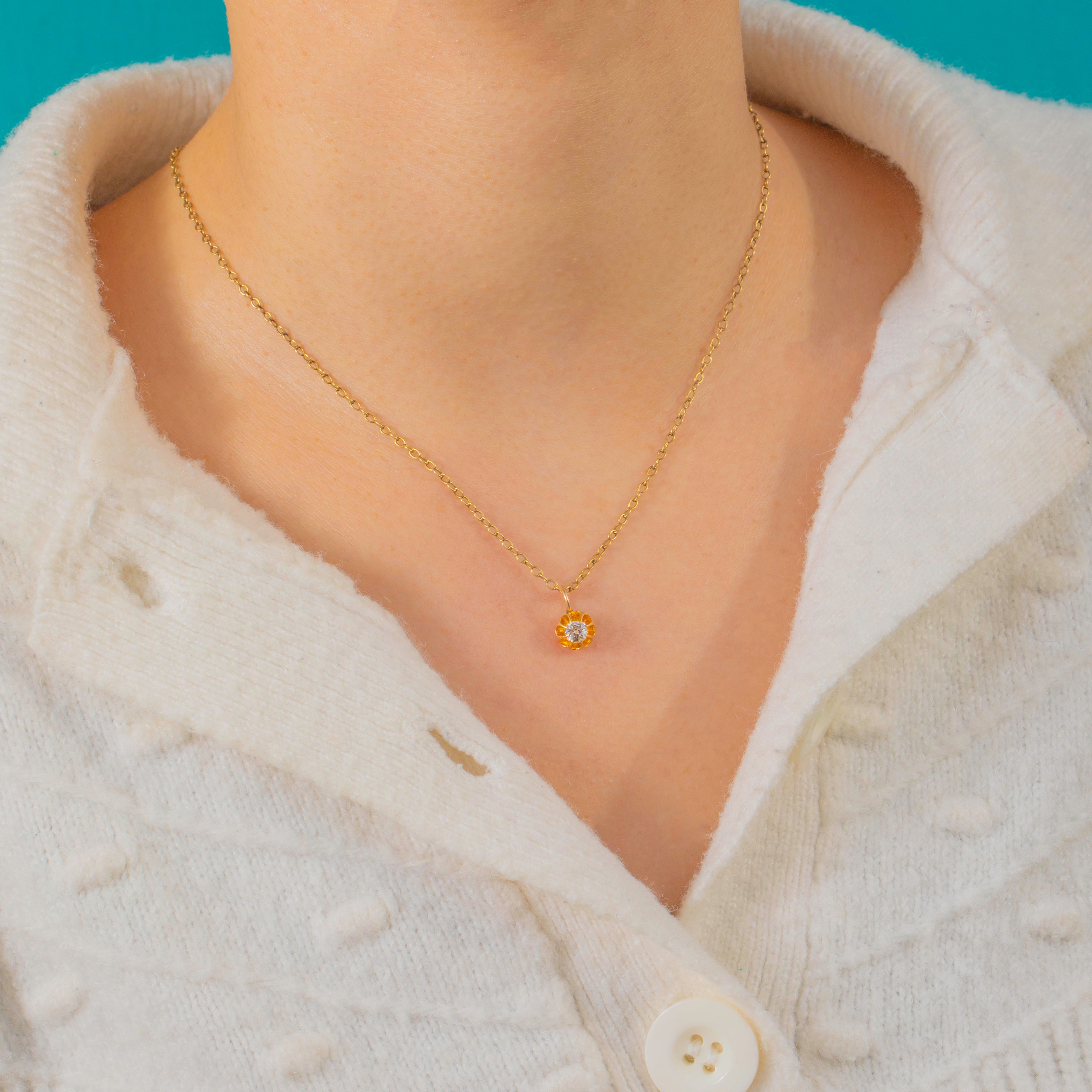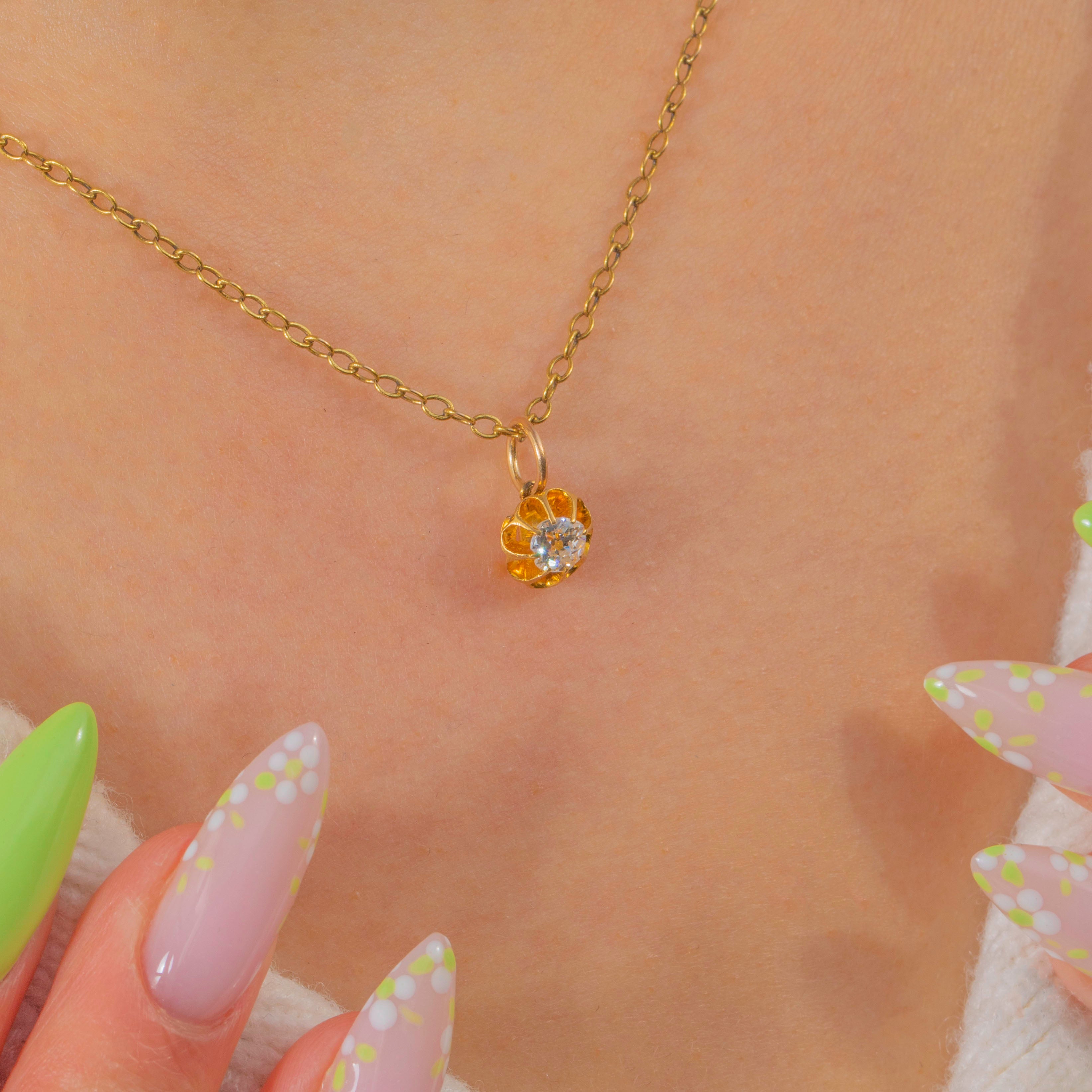 A petite Victorian buttercup charm in rich 18ct Gold, blooming with a 0.25ct Old Mine-Cut Diamond. The scalloped buttercup setting cradles the antique-cut stone, its lively sparkle beautifully set off by the warm glow of high-carat Gold.
