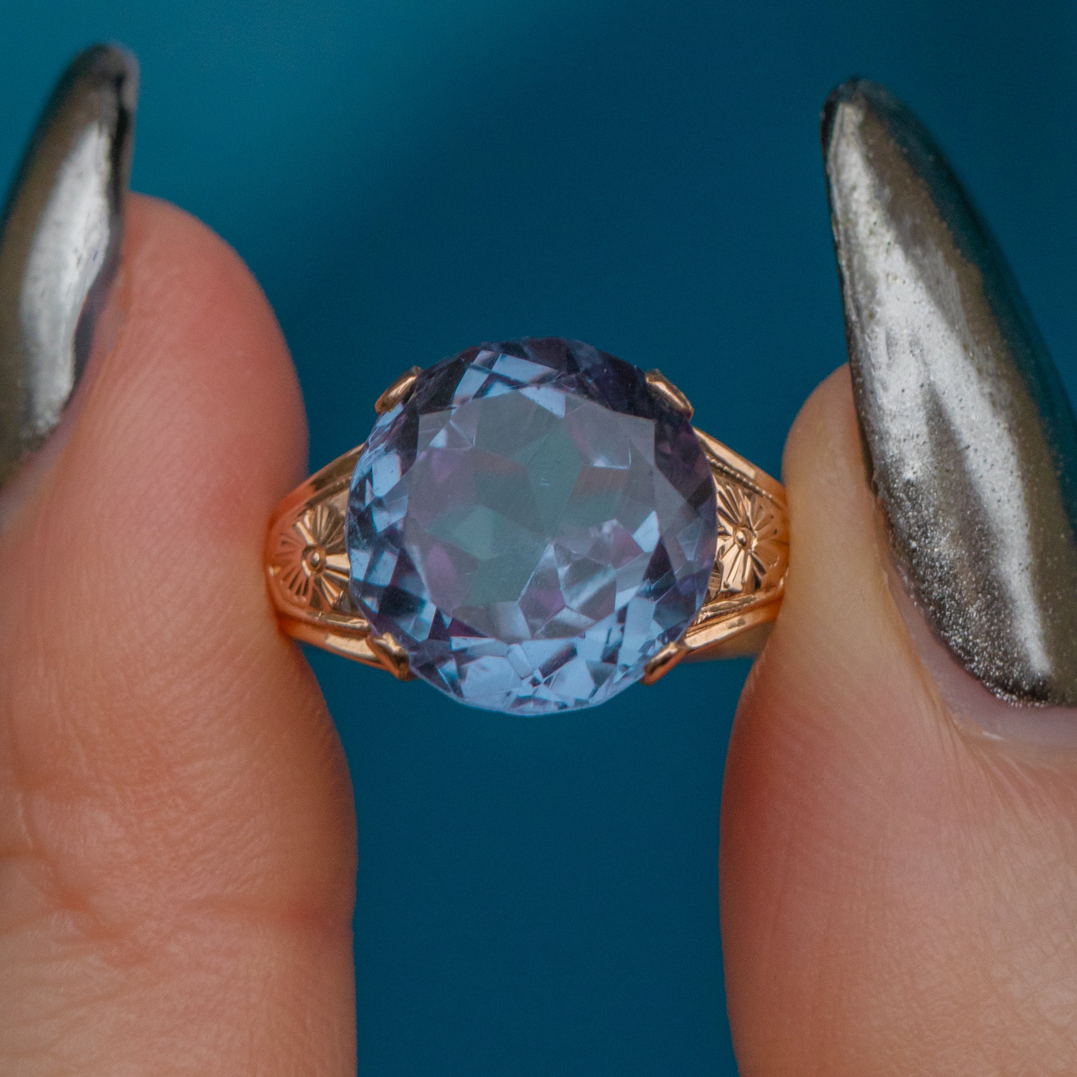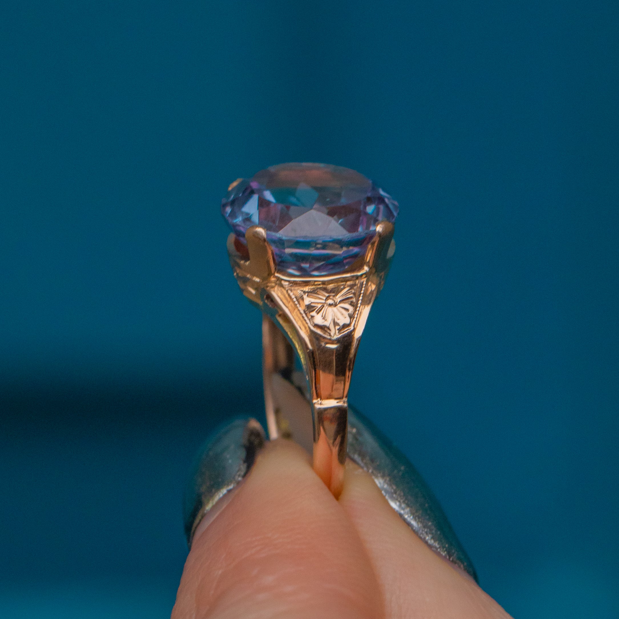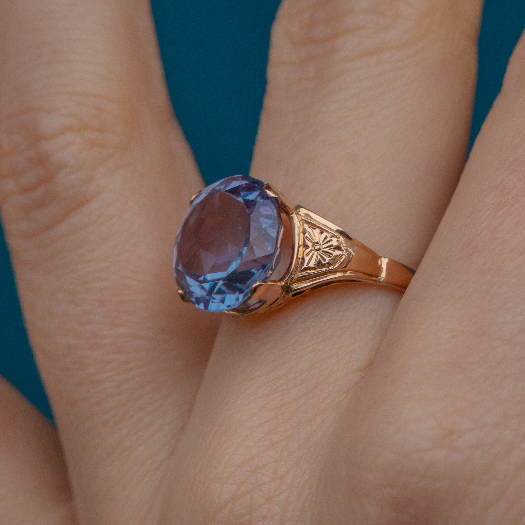 Crafted from solid 18ct Gold, this vintage ring boasts a 7.00ct synthetic colour-changing Sapphire as her focal point. Beautifully faceted, she radiates gorgeous lavender and lilac hues, with flecks of fuchsia and blue as she catches the light.