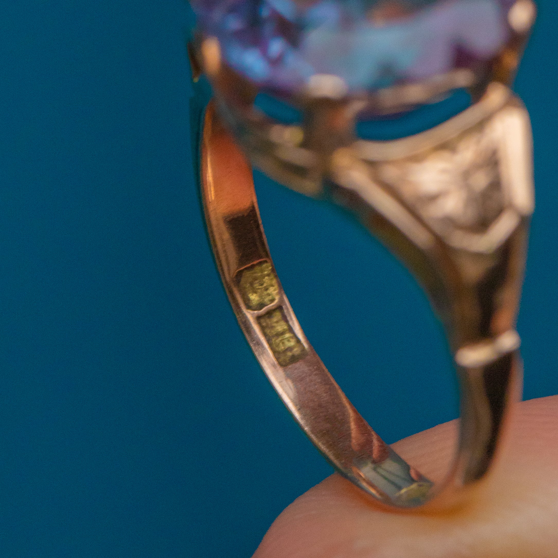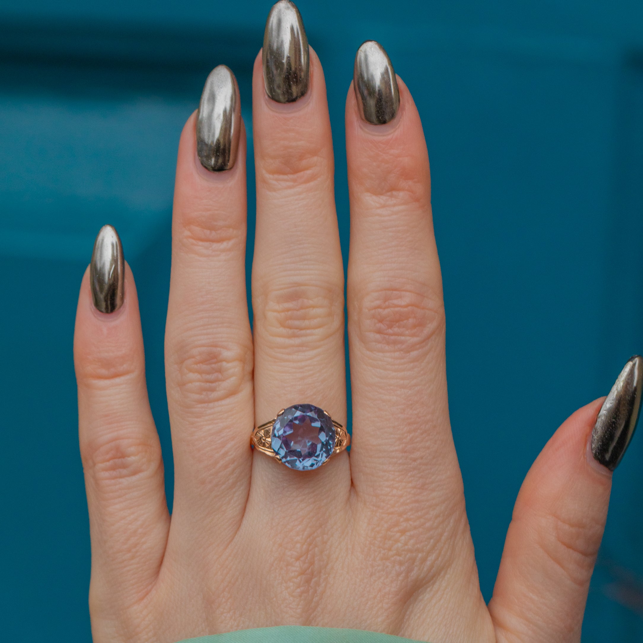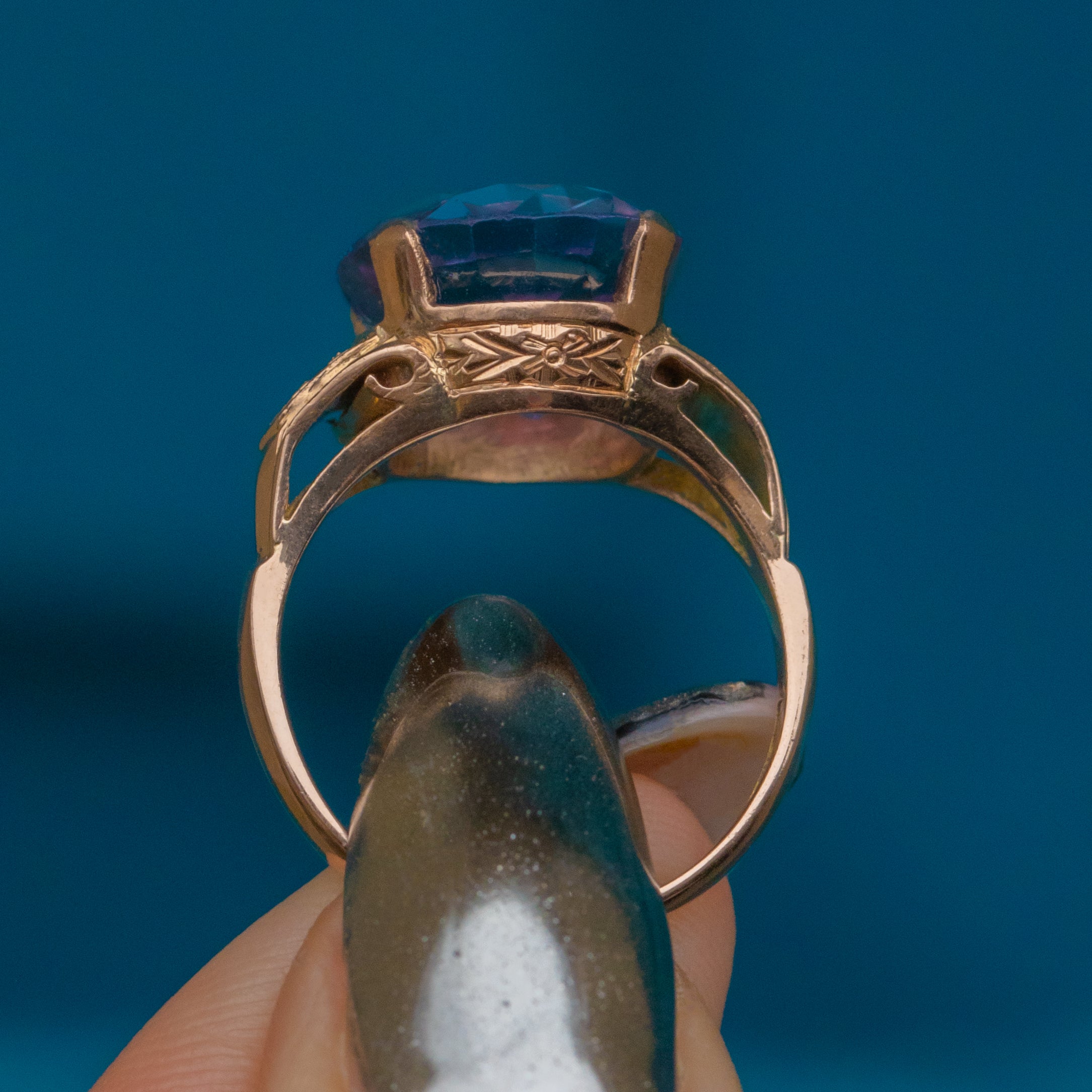Crafted from solid 18ct Gold, this vintage ring boasts a 7.00ct synthetic colour-changing Sapphire as her focal point. Beautifully faceted, she radiates gorgeous lavender and lilac hues, with flecks of fuchsia and blue as she catches the light.