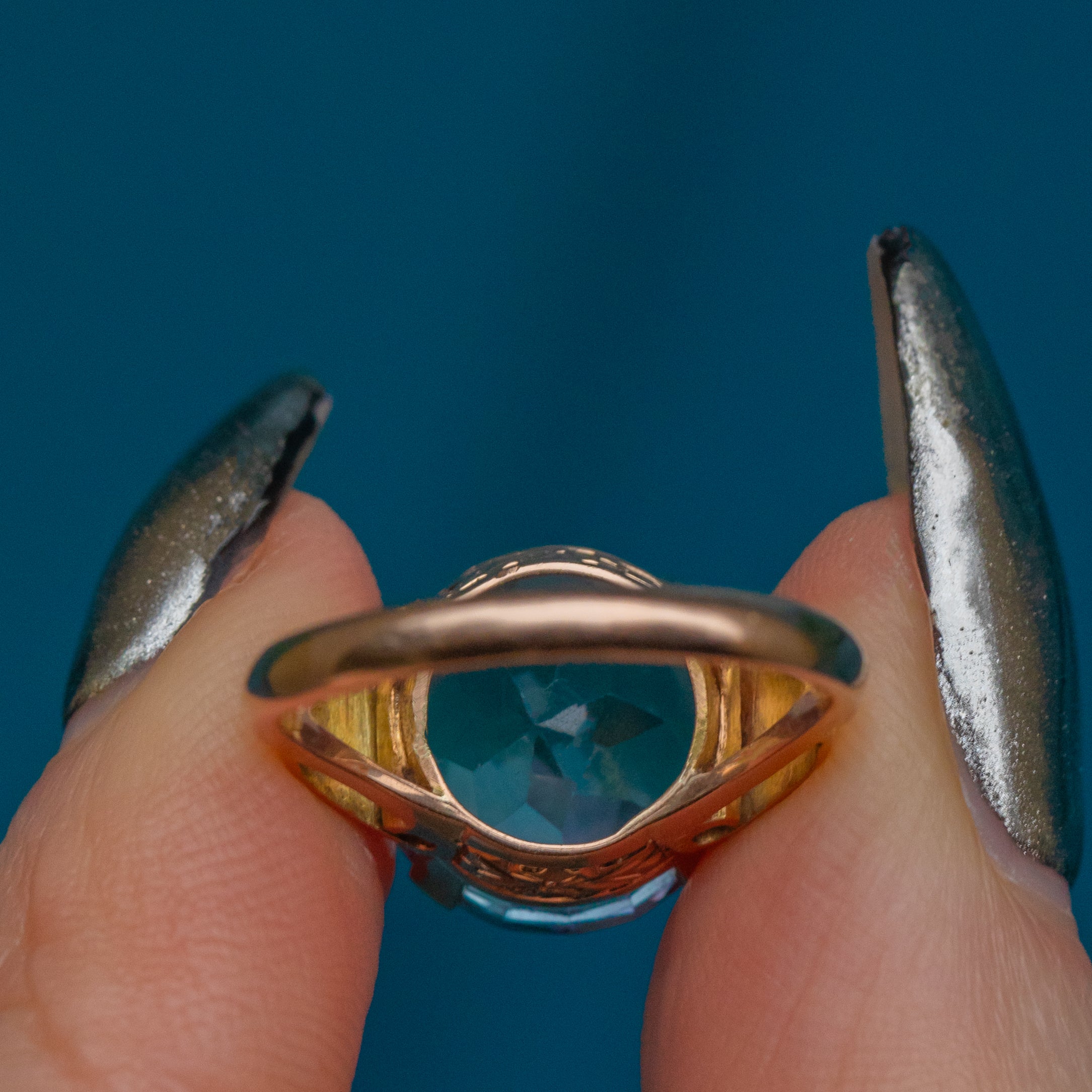 This vintage colour-change Sapphire rests snugly on her 18ct Gold band, hugged by claw settings and complimented by ornately detailed shoulders. With a wonderful profile, this vintage Gold Sapphire ring exudes all things glamour and is the perfect piece as we head into the party season!