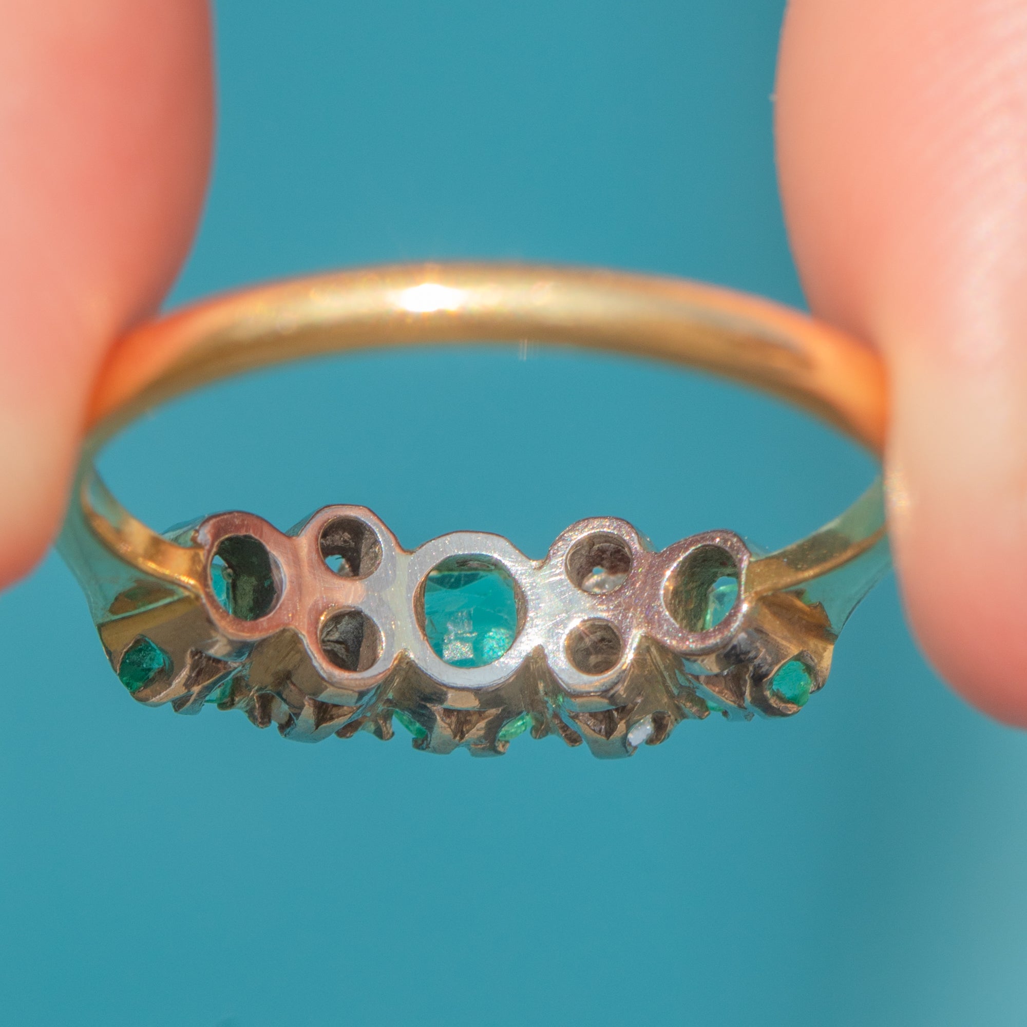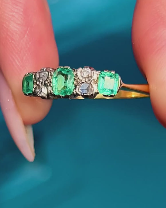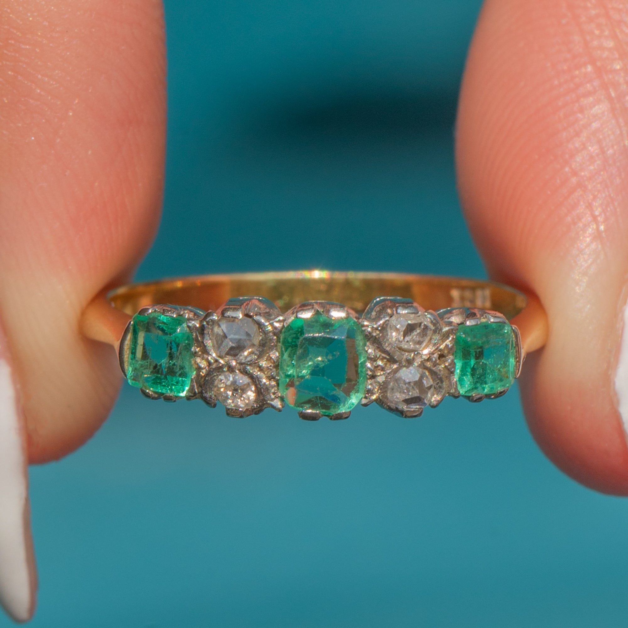 A classic Victorian seven-stone ring in rich 18ct Gold, featuring a vibrant trio of Emeralds accented by twinkling Diamonds. The centre Emerald is a graceful rectangular stone flanked by two square Emeralds, while the Diamonds lend a crisp sparkle that enhances the vivid green hue.