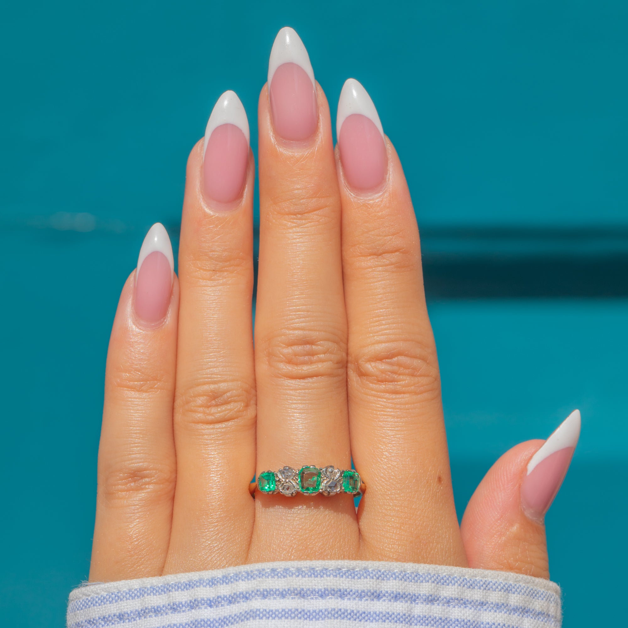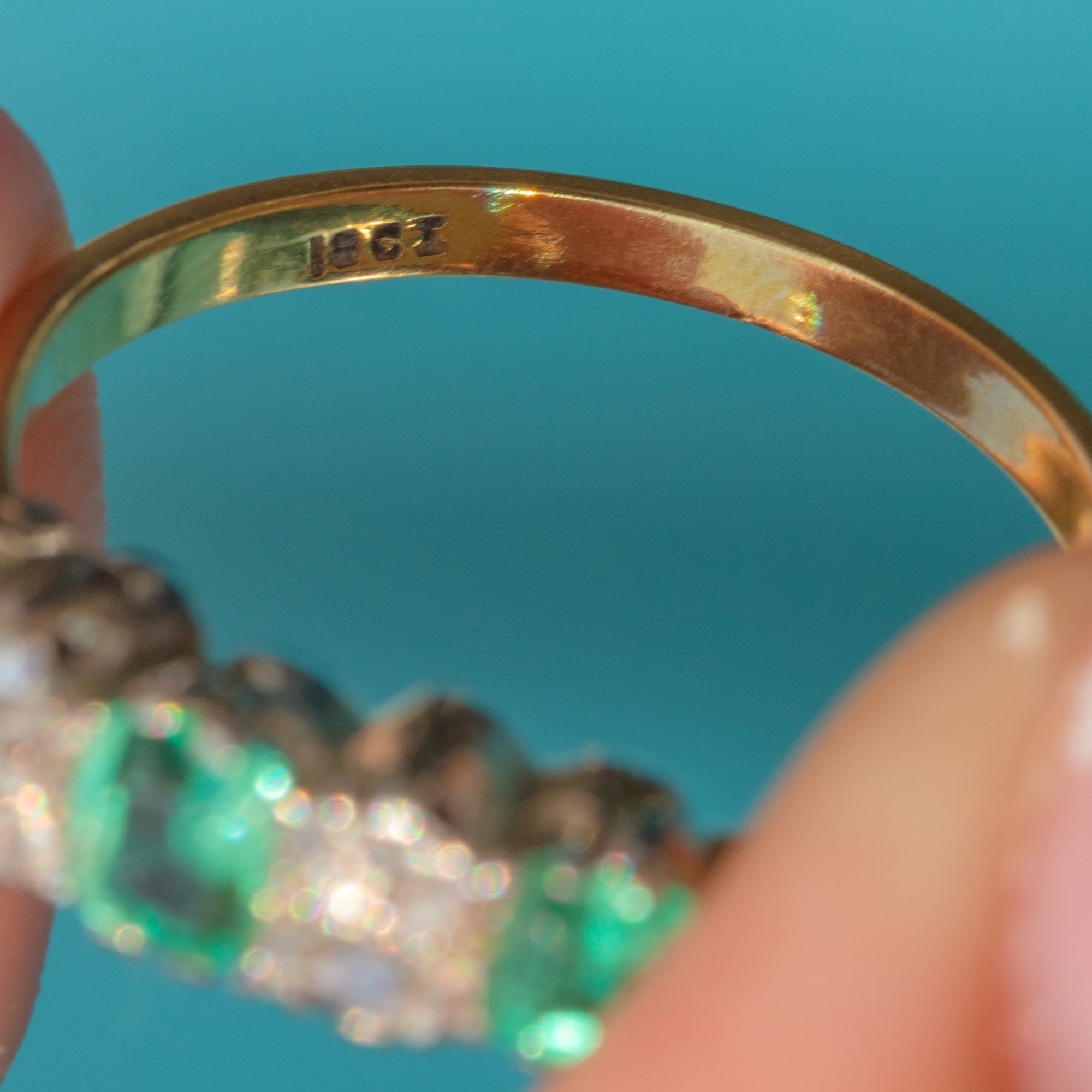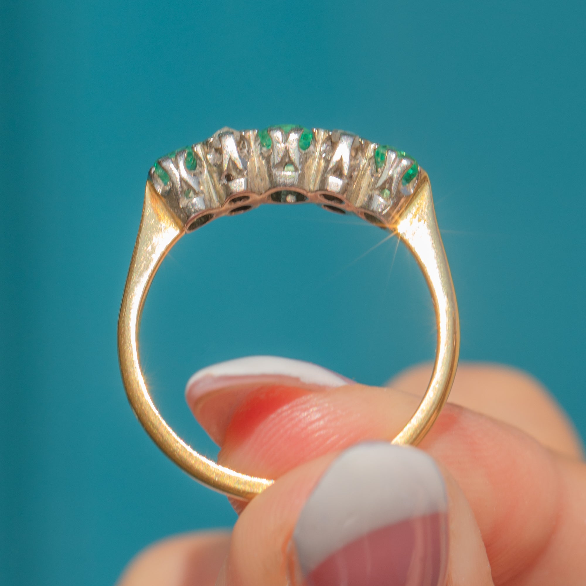 A classic Victorian seven-stone ring in rich 18ct Gold, featuring a vibrant trio of Emeralds accented by twinkling Diamonds. The centre Emerald is a graceful rectangular stone flanked by two square Emeralds, while the Diamonds lend a crisp sparkle that enhances the vivid green hue.