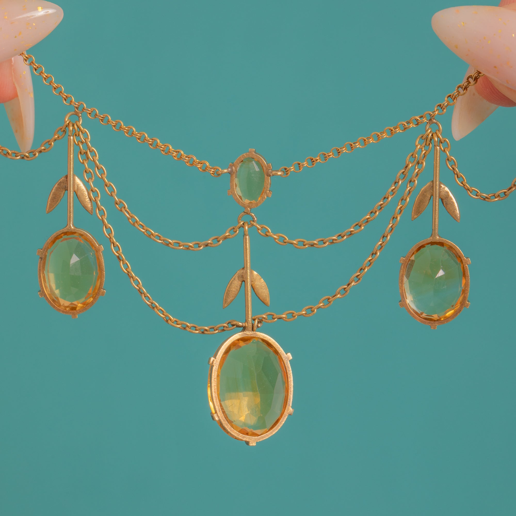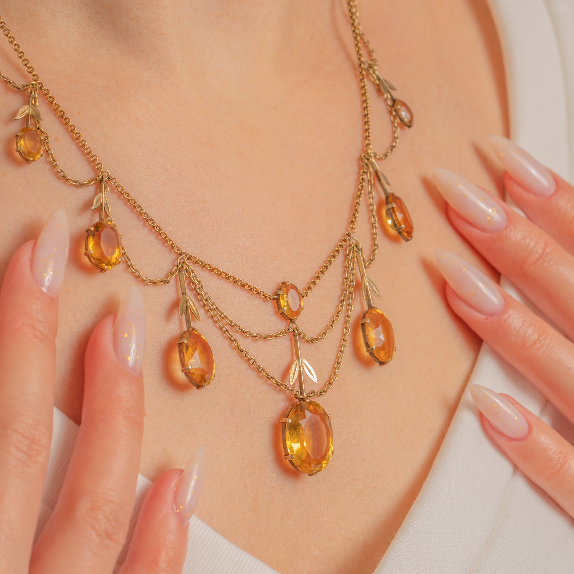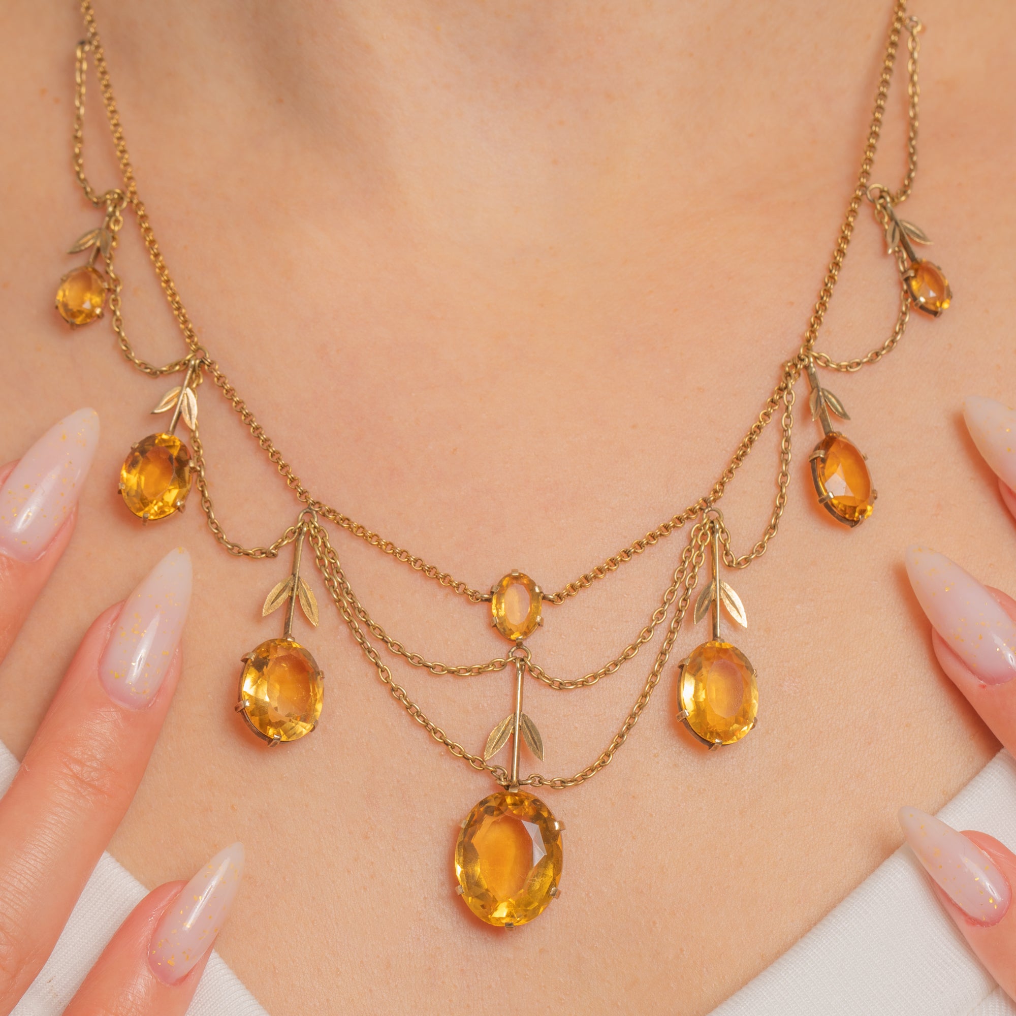 A graceful French Victorian festoon, this 18ct Gold necklace drapes in seven refined swags punctuated by articulated drops, slender bars and delicate foliate sprigs. The open, airy garland silhouette flatters the neckline while honey-yellow Citrines glow with sunshine warmth.