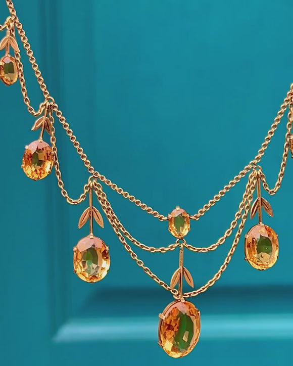 18ct Gold French Citrine Flower Festoon Necklace, with Antique Box