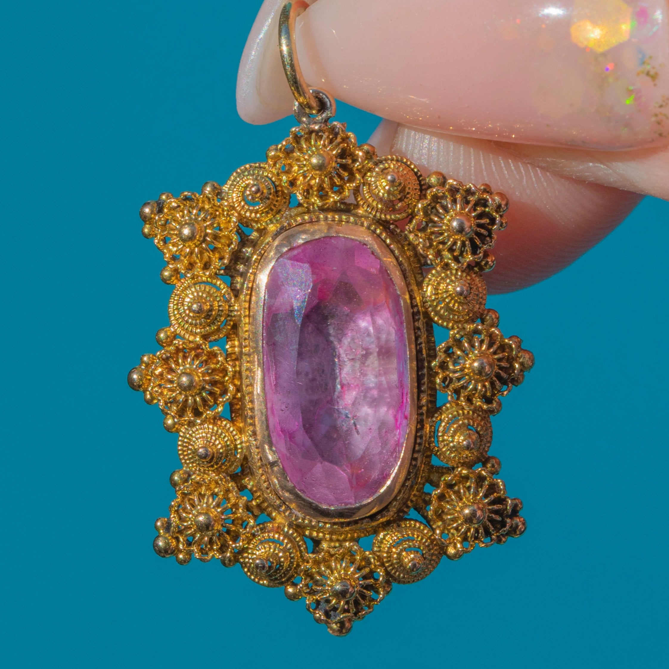 EXCELLENT: The pretty Georgian Pink Topaz is the most sought-after, luscious baby pink, and shows some natural inclusions. The foiling is intact and the charm has only the lightest surface wear, consistent with her great age. At over 200 years old we think she looks pretty exceptional!! The 18ct Gold cannetille work is bright yellow and well preserved with only minor softening of detail. Overall, the pendant has been well cared for and remains in beautiful antique condition.
