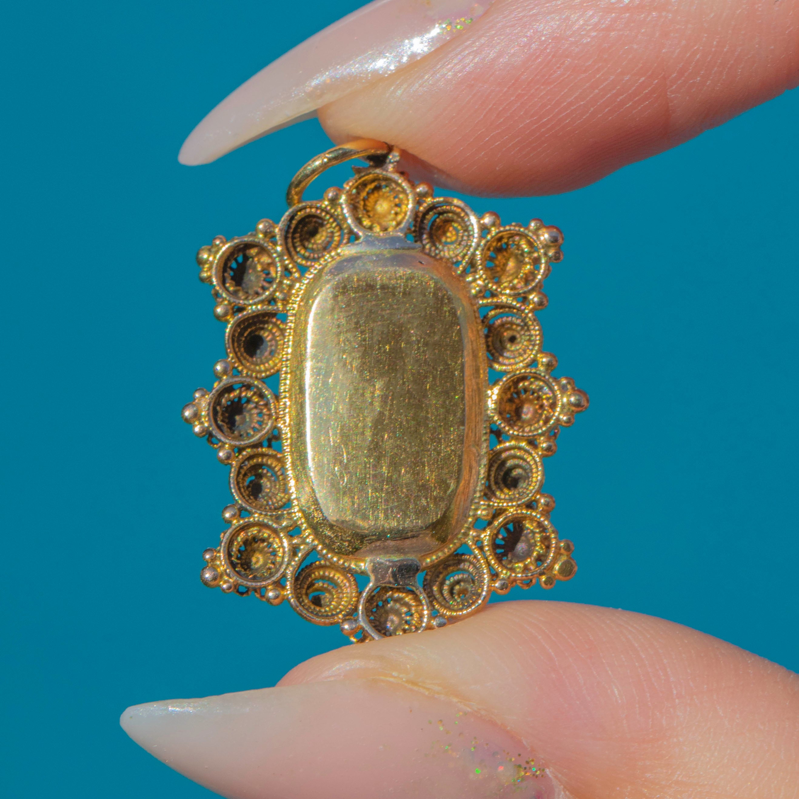 The prized gem is framed by a spectacular 18ct Gold cannetille surround, with intricate Gold coils and granulation forming a decorative starburst border. This detailed craftsmanship is characteristic of the early 19th century, when cannetille work was at the height of fashion. Its ornate, lace-like texture gives the piece both delicacy and impact.