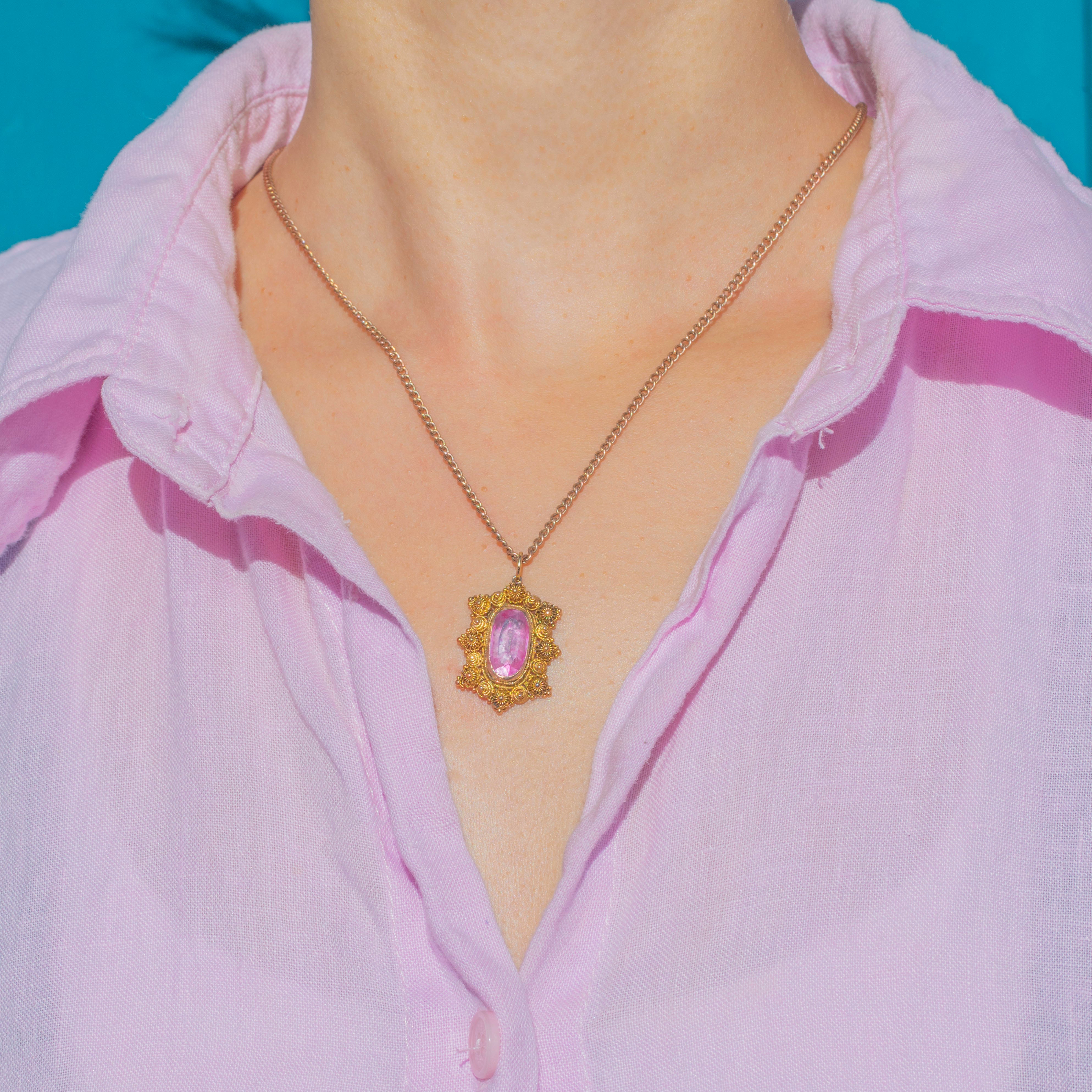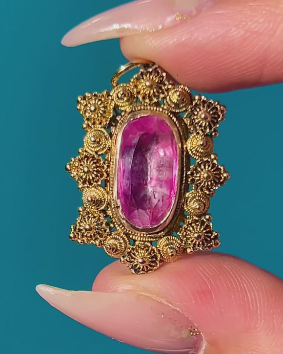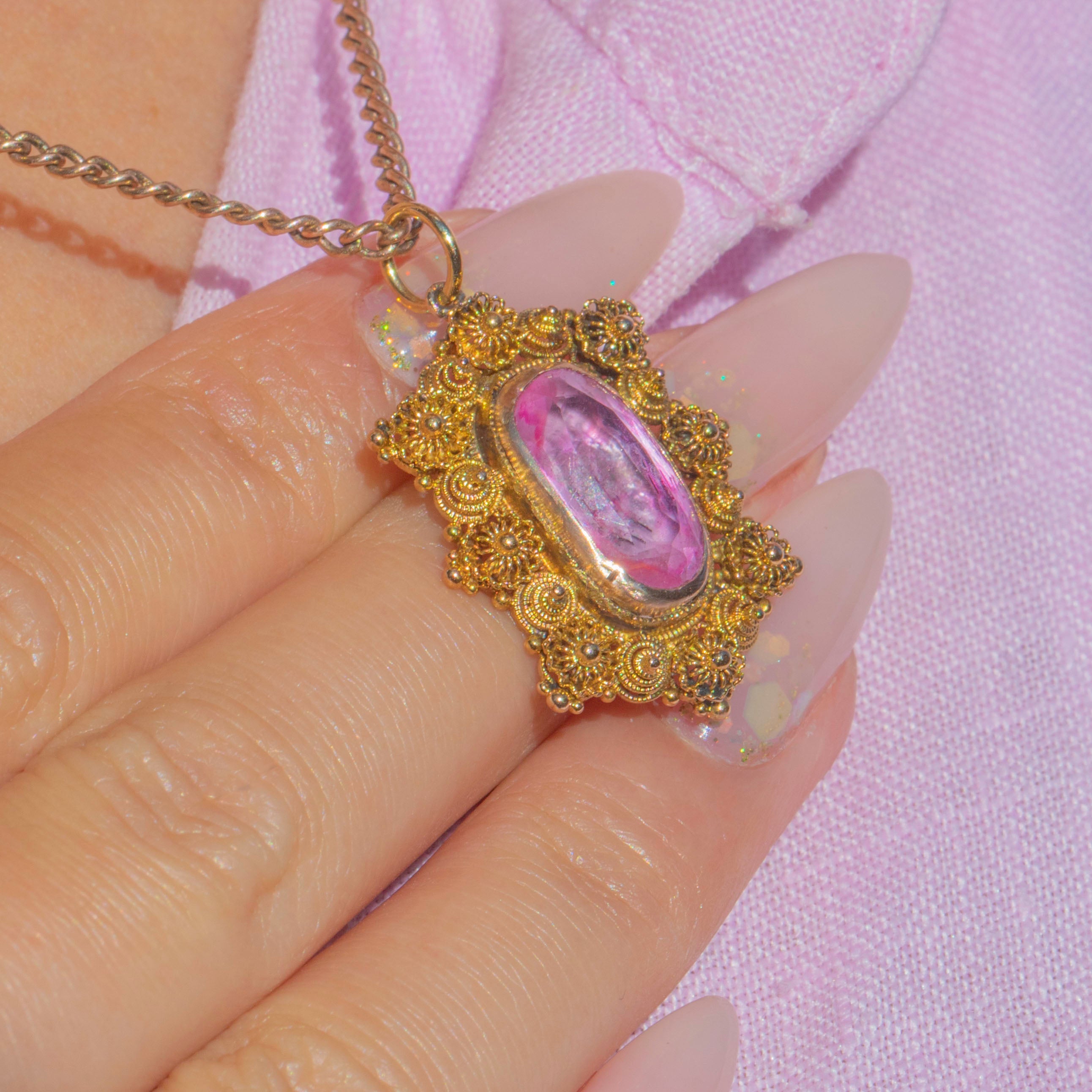 This exquisite Georgian pendant is crafted in rich 18ct Gold and displays a vibrant foiled natural Pink Topaz at its heart. The glowing, rosy hue of the gemstone is accentuated by the foiling beneath, a quintessential Georgian technique used to enhance brilliance and colour.