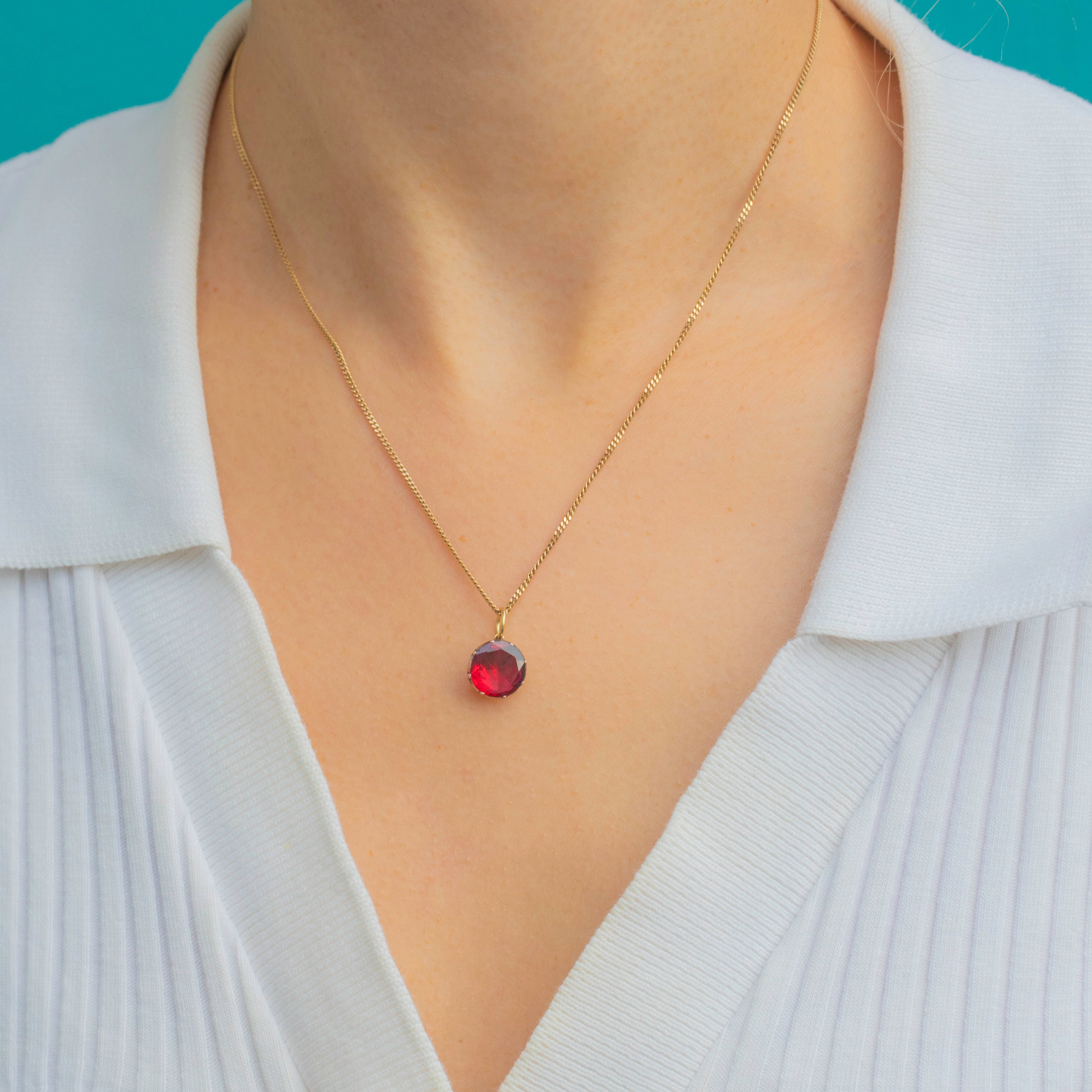 EXCELLENT: The red Paste is bright and lively with minimal facet wear, retaining its rich Georgian sparkle. The 18ct Gold collet and jump ring are well preserved with gentle age-related patina.