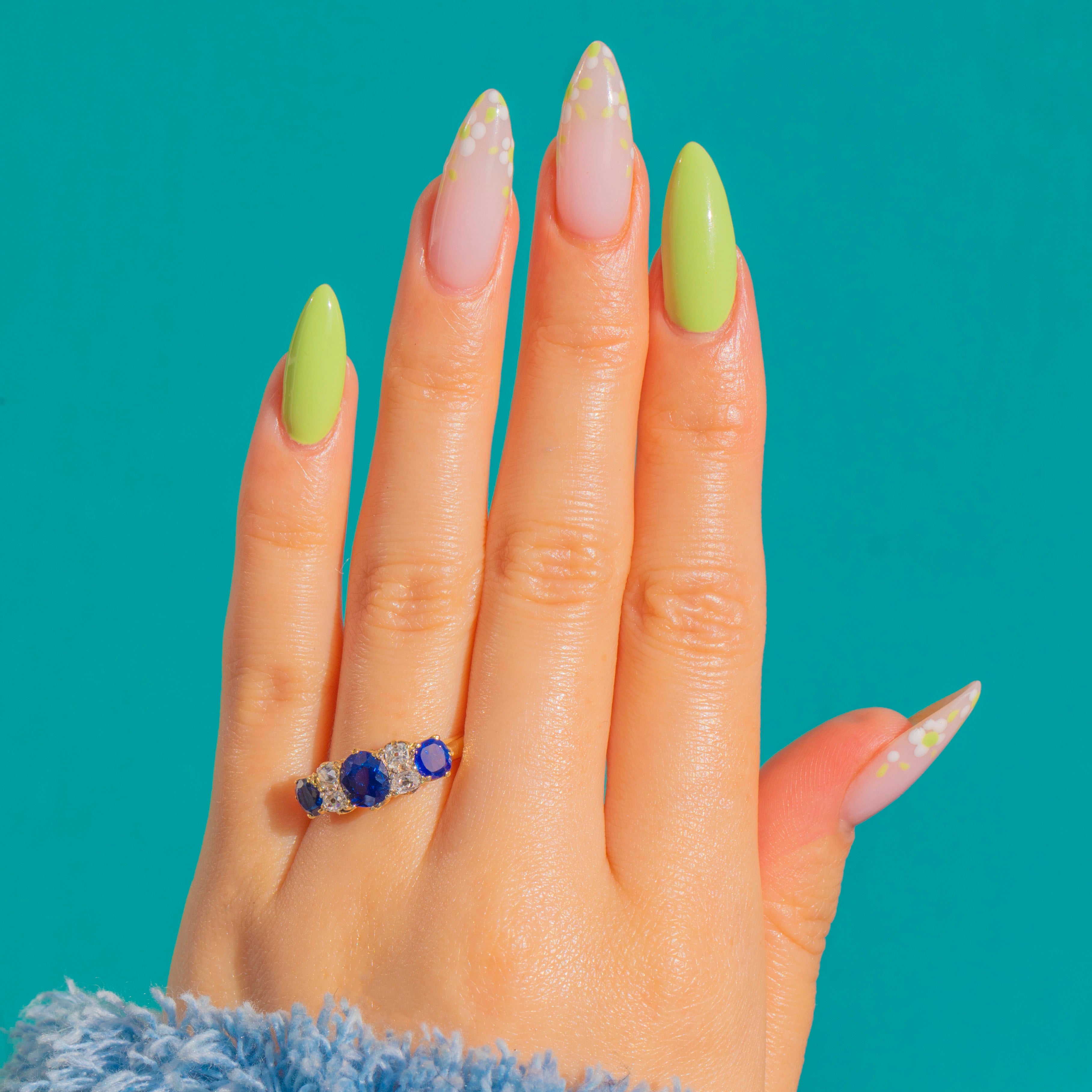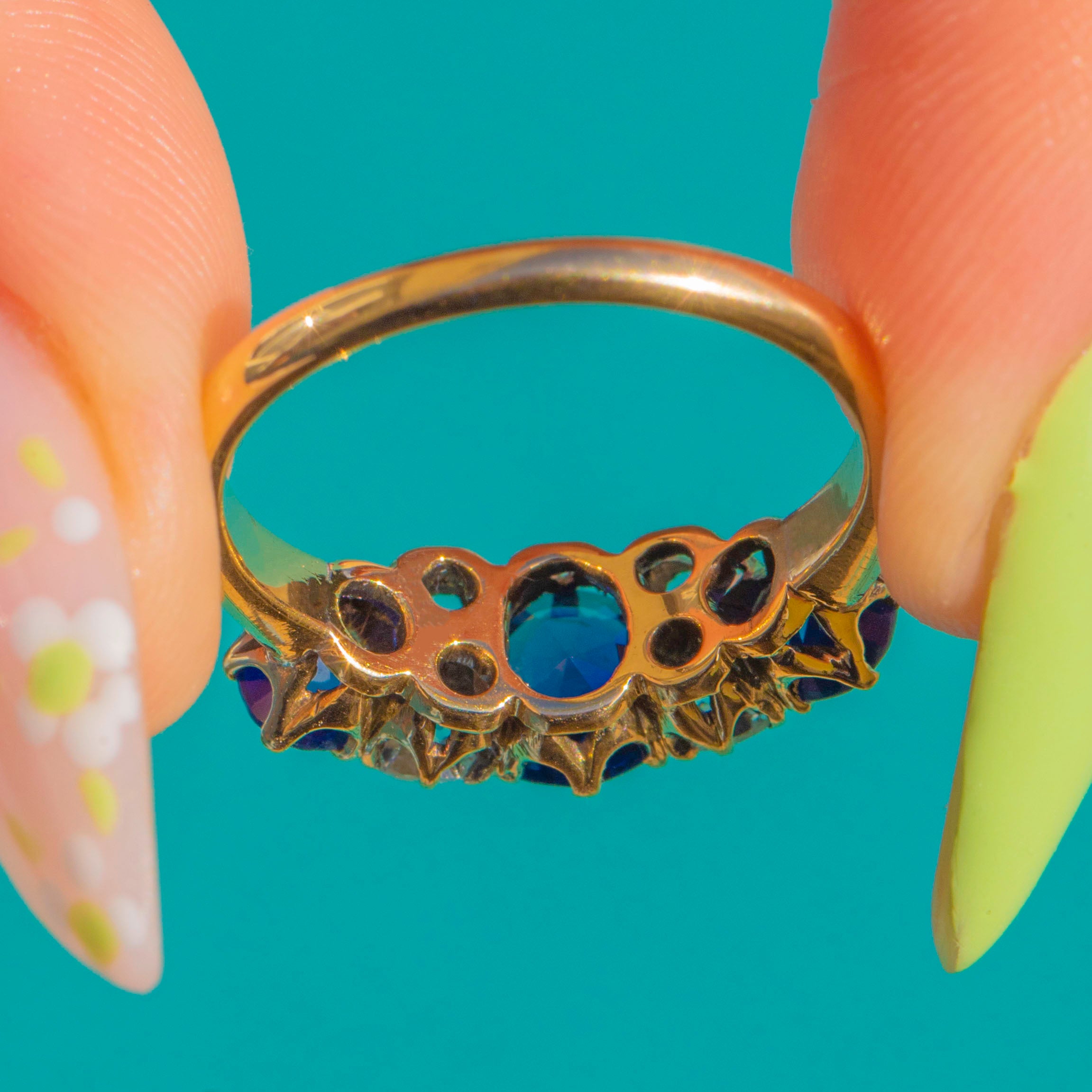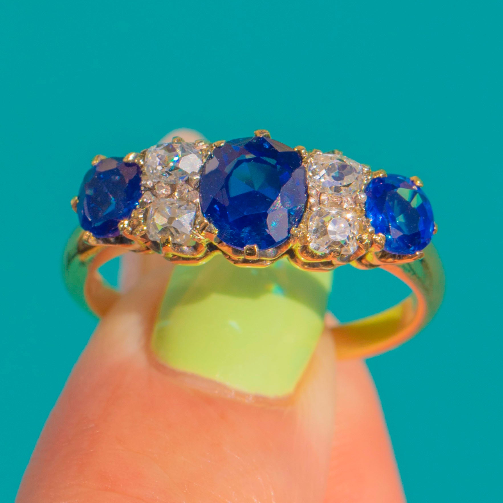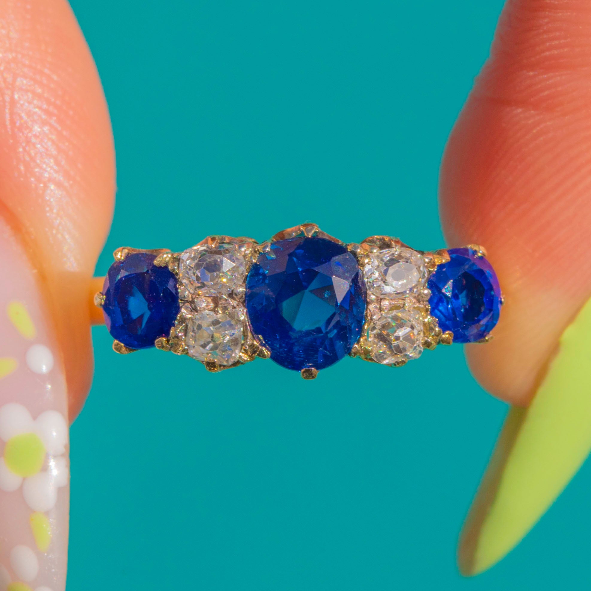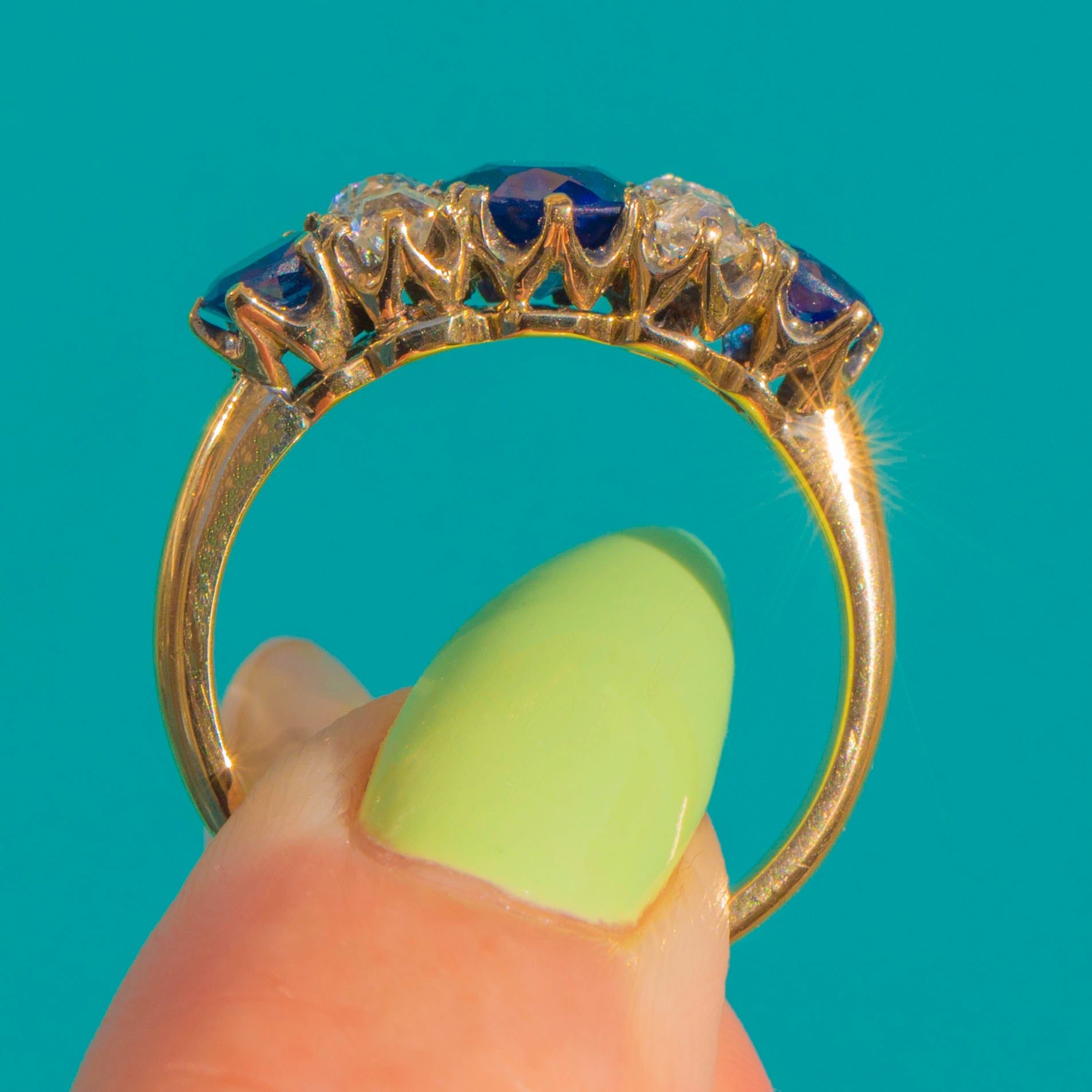Gloriously Victorian and beautifully refined, this five-stone ring is crafted in rich 18ct Gold with a graceful, raised crown and pierced gallery. A sumptuous royal-blue Sapphire sits centre stage, flanked by four bright Diamonds and two further blue Sapphires, each in individually scalloped claw settings for a delicate, heritage silhouette.