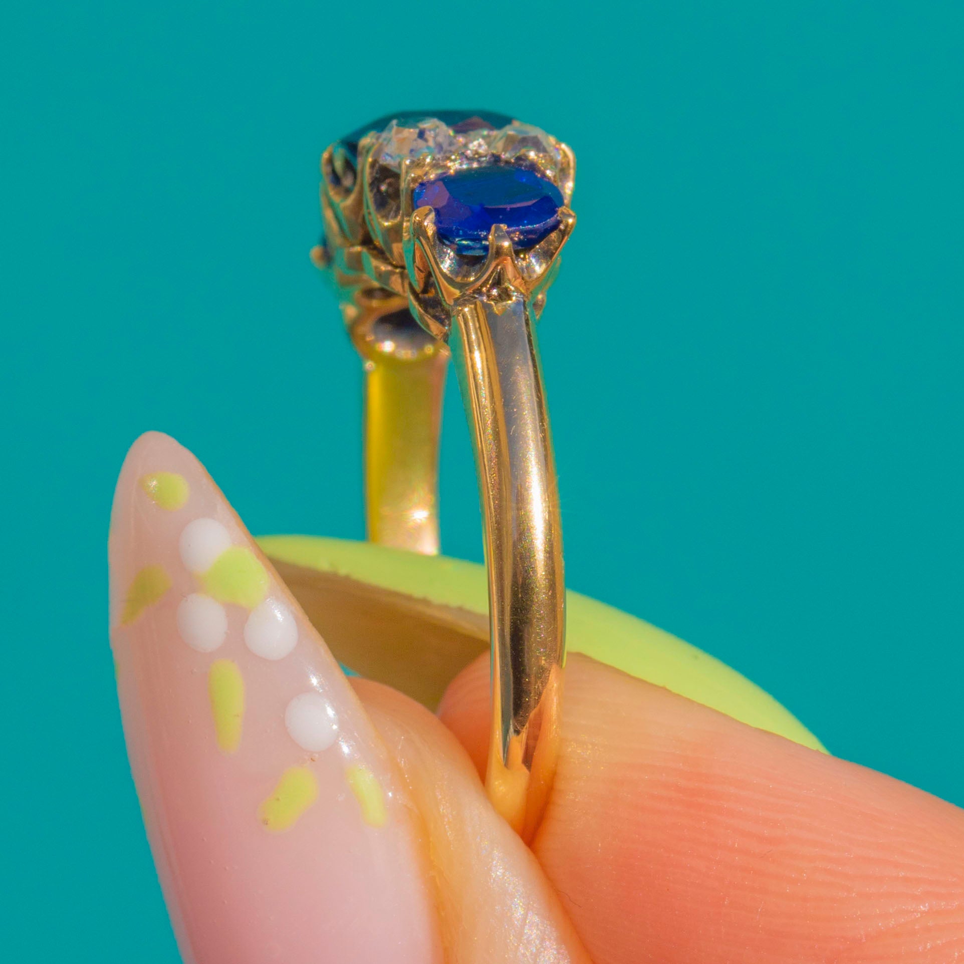 EXCELLENT: The Sapphires and Diamonds are bright with no obvious chips or abrasions visible, retaining lovely sparkle and colour. The prongs and pierced settings are intact and secure, with crisp detail. The shank shows only light surface scratches and gentle patina commensurate with age, with no visible resizing marks.