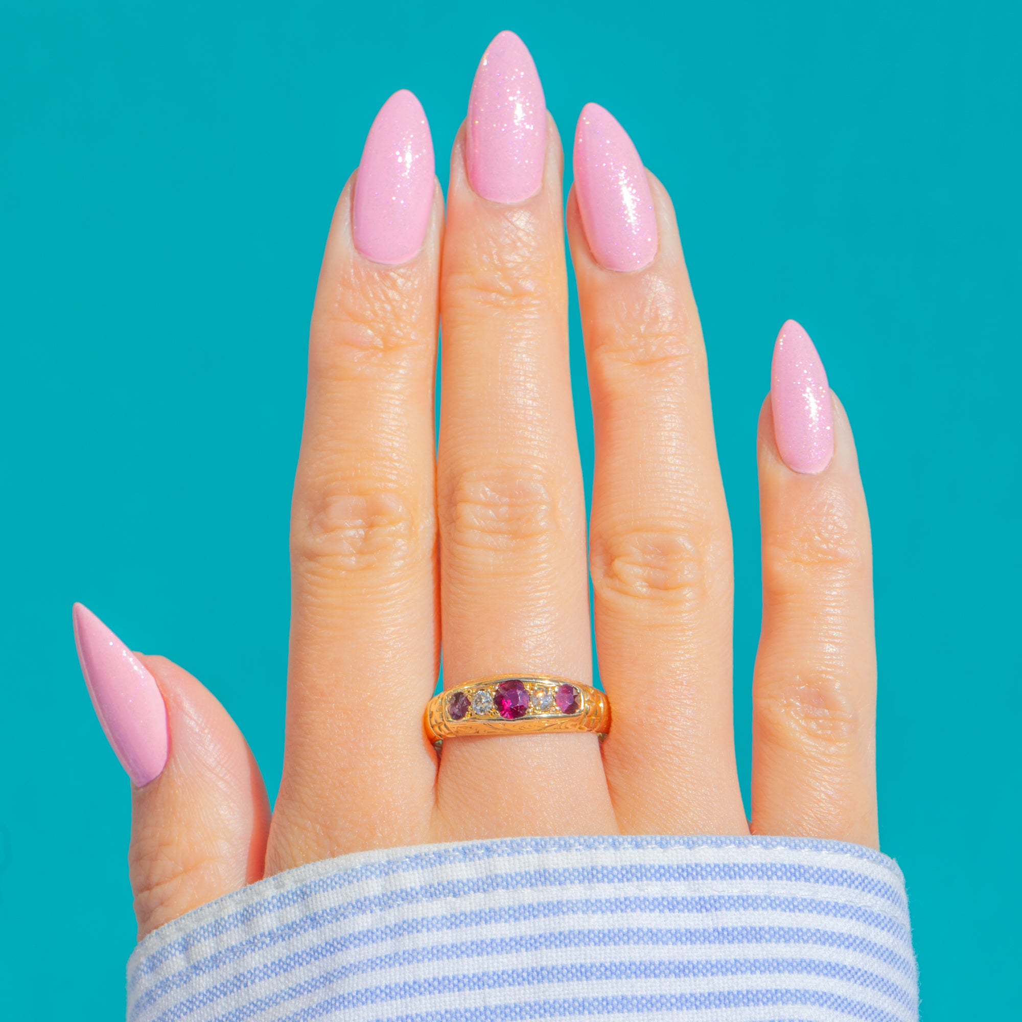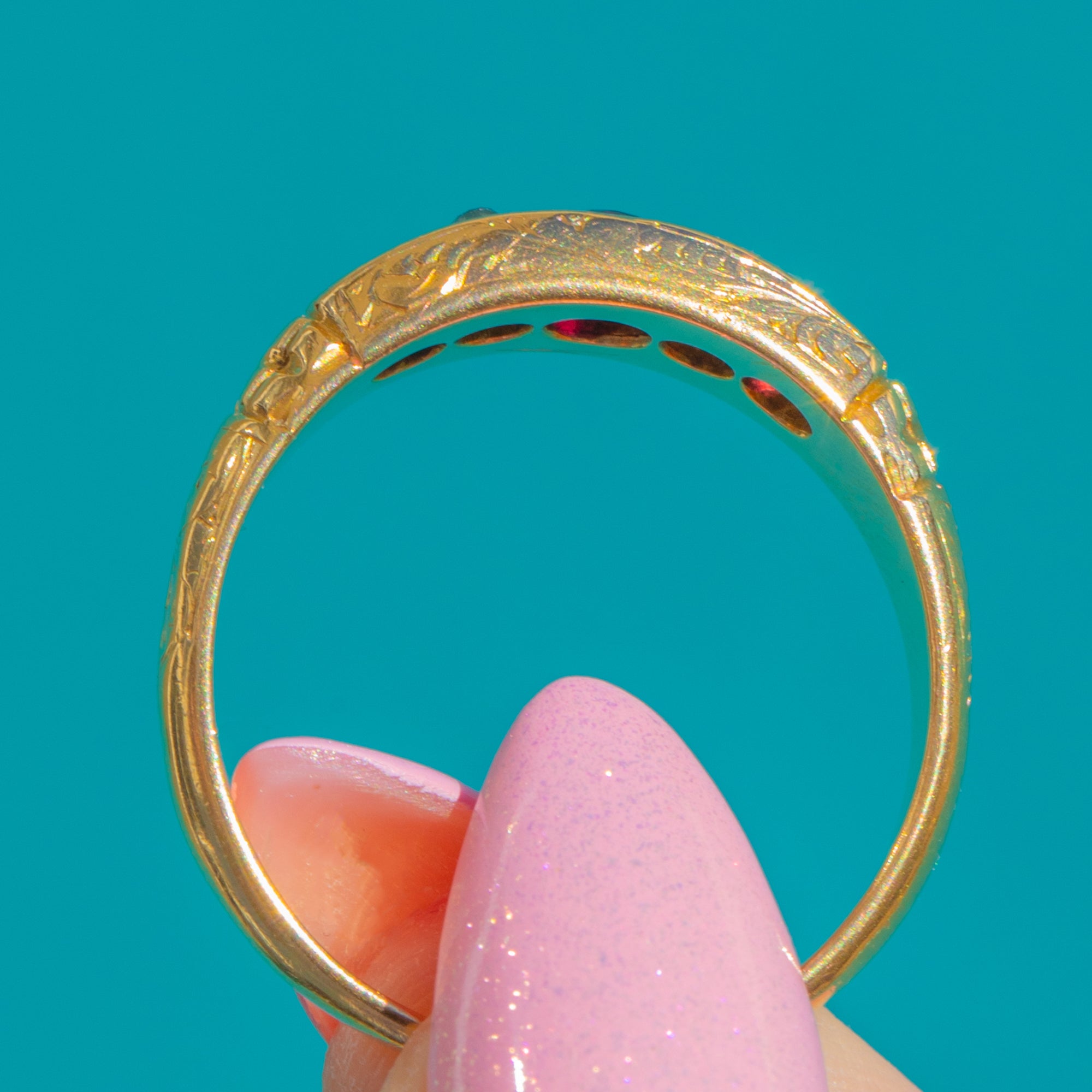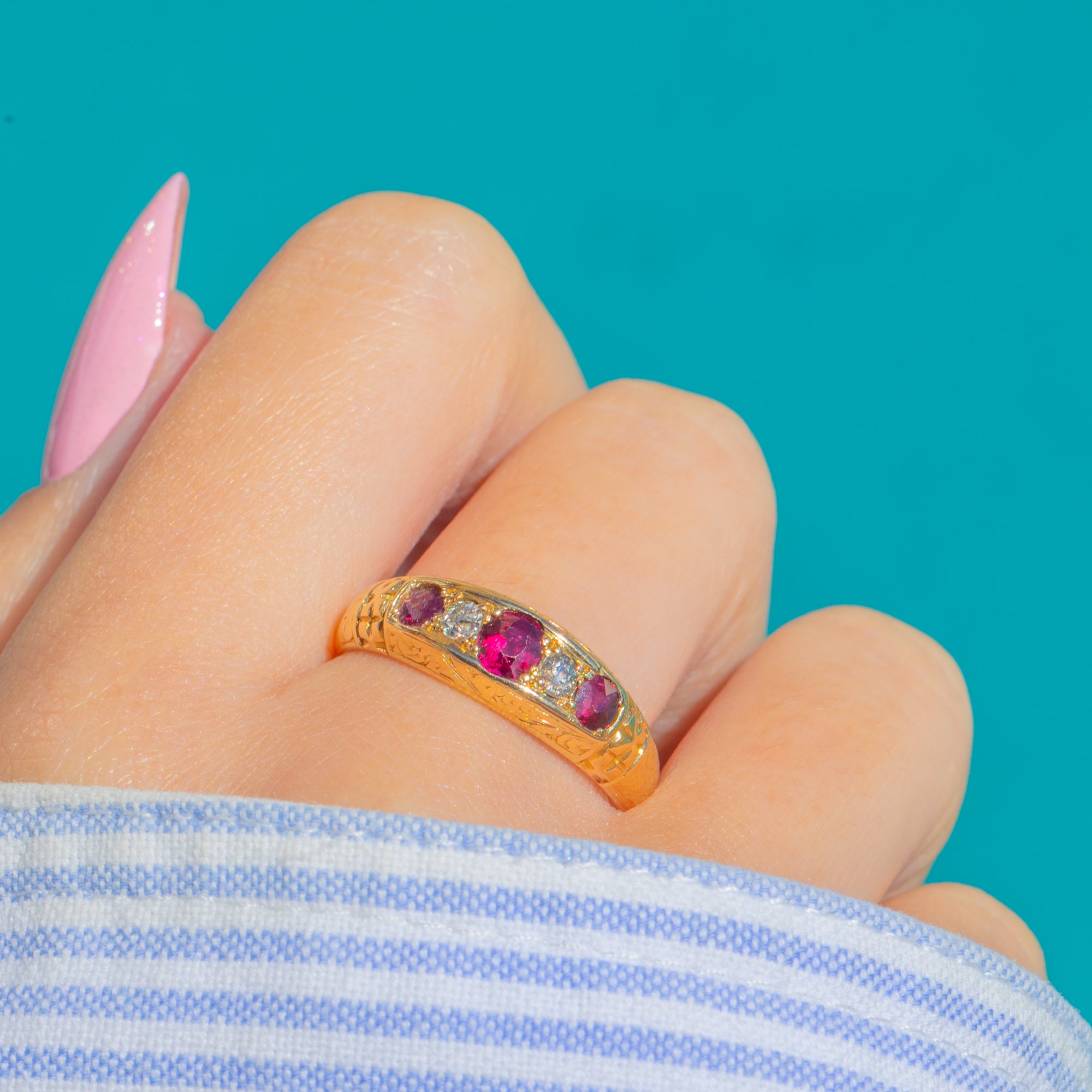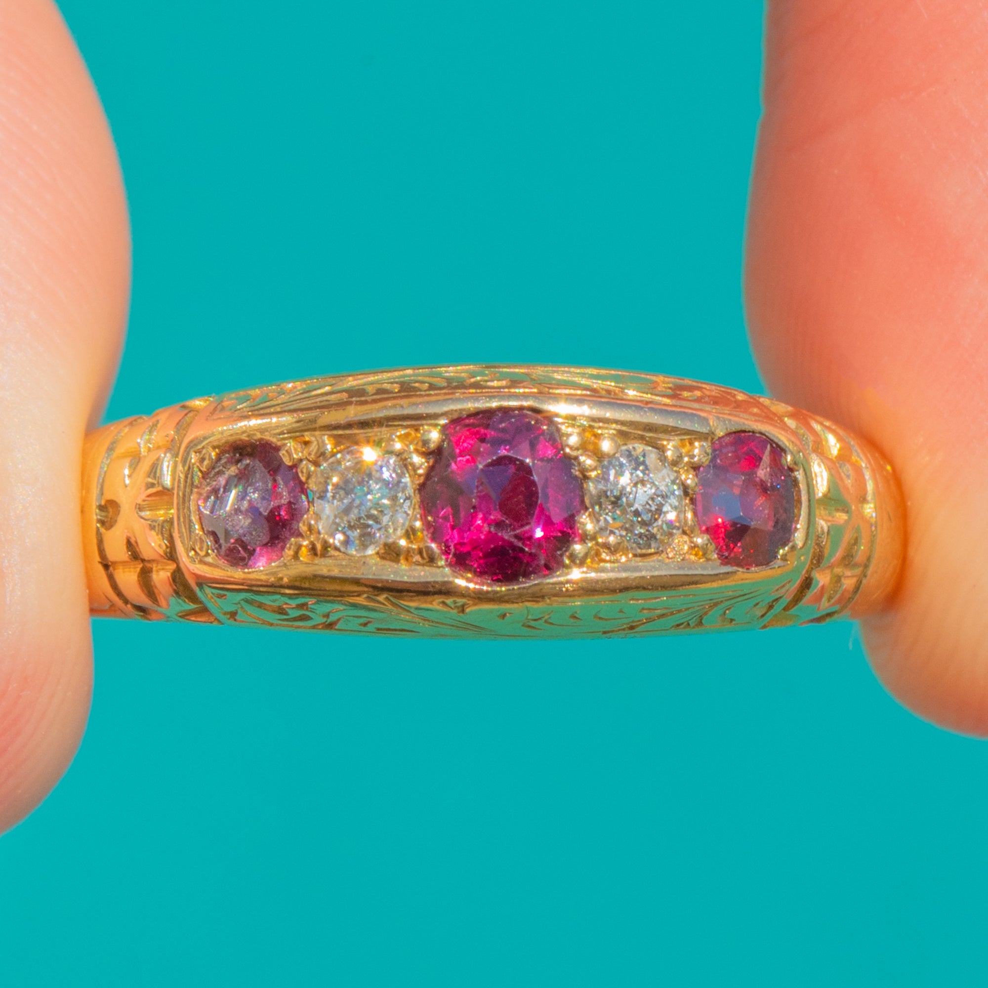 Delicate foliate engraving graces the gallery and shoulders, adding texture and old-world charm to the smooth, elongated “boat” head. Hallmarked for Chester 1898, it’s a refined, wearable antique with lovely colour and sparkle: approximately 0.50ct of Rubies and 0.12ct of Diamonds arranged in a timeless five-stone line that sits close to the finger with effortless elegance.