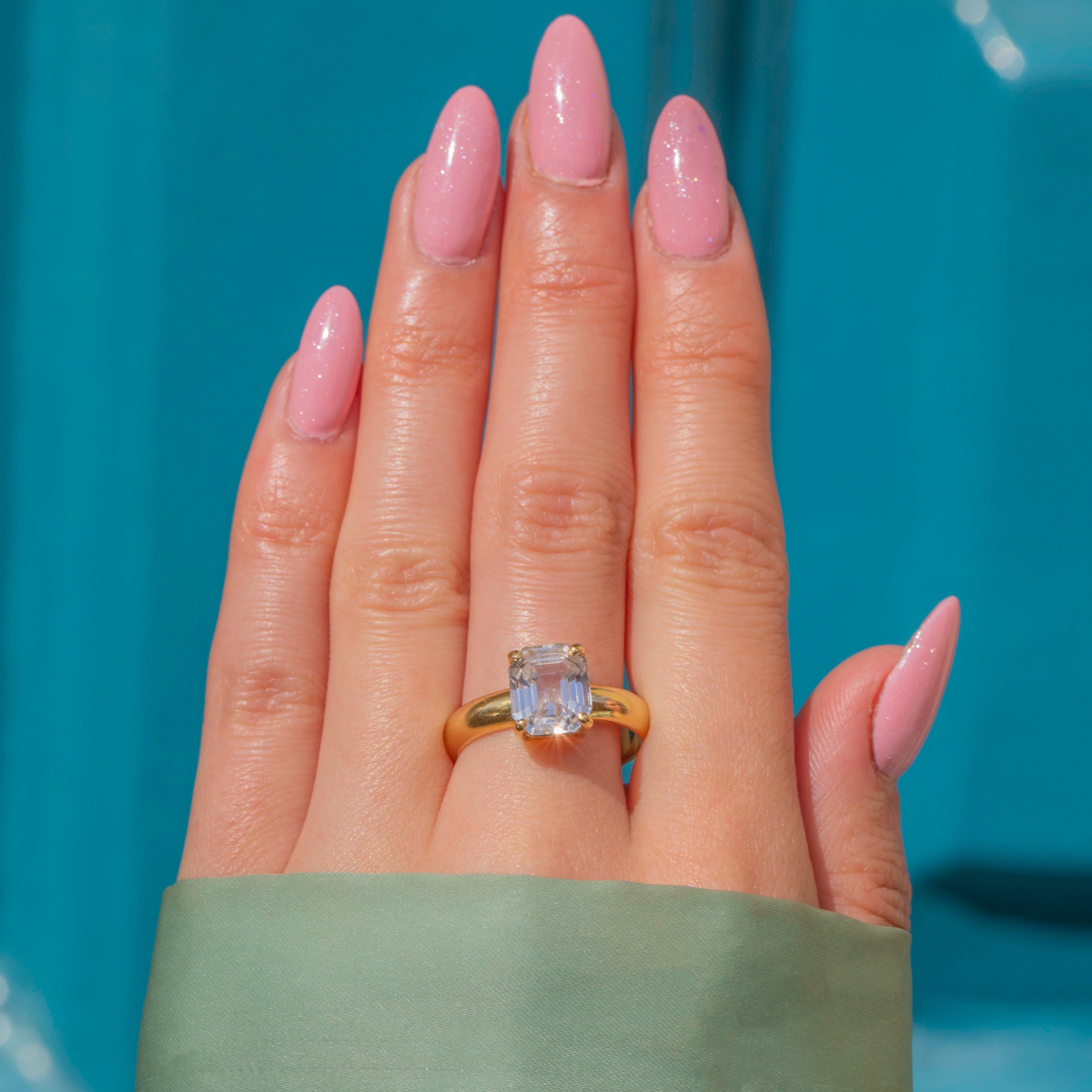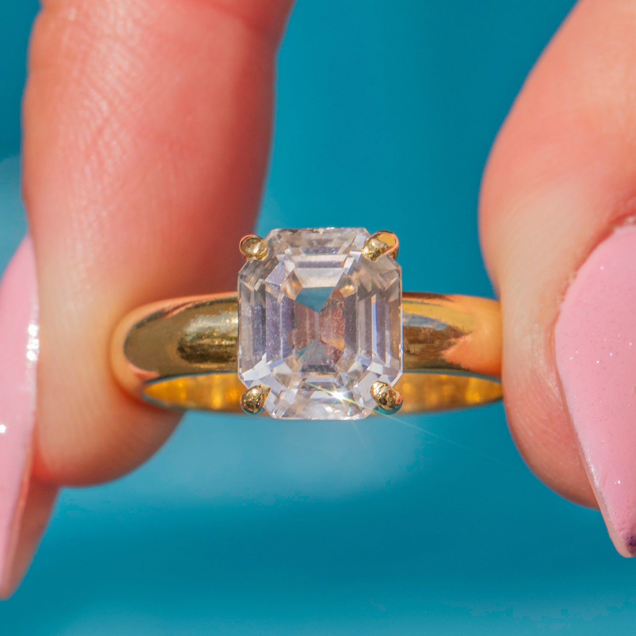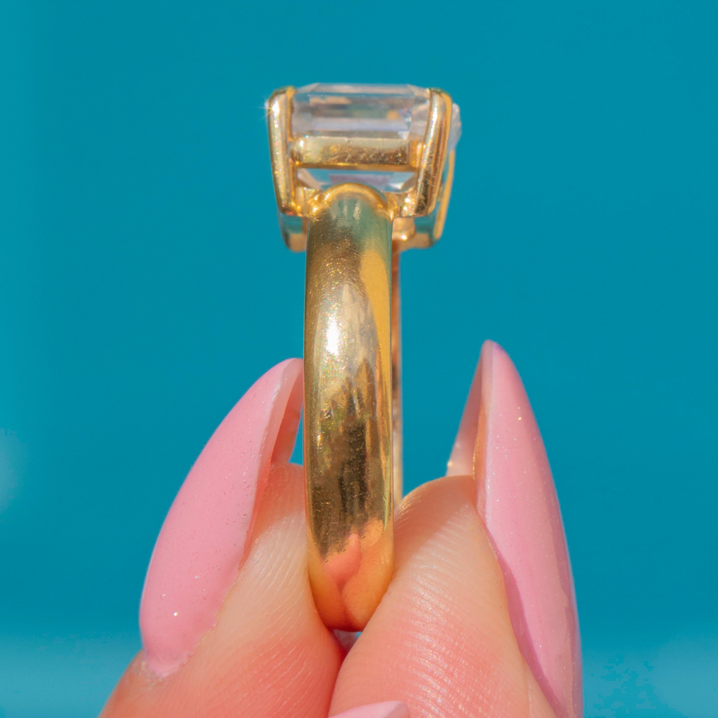 In her centre sits a stunning Moissanite (equivalent to a 3.00ct Diamond in weight) which is beautifully faceted in an Emerald-cut to catch the light wonderfully. The scintillating Moissanite is set within glossy 18ct Gold claw settings, with a gorgeous gallery and chunky band, allowing for ample finger coverage.