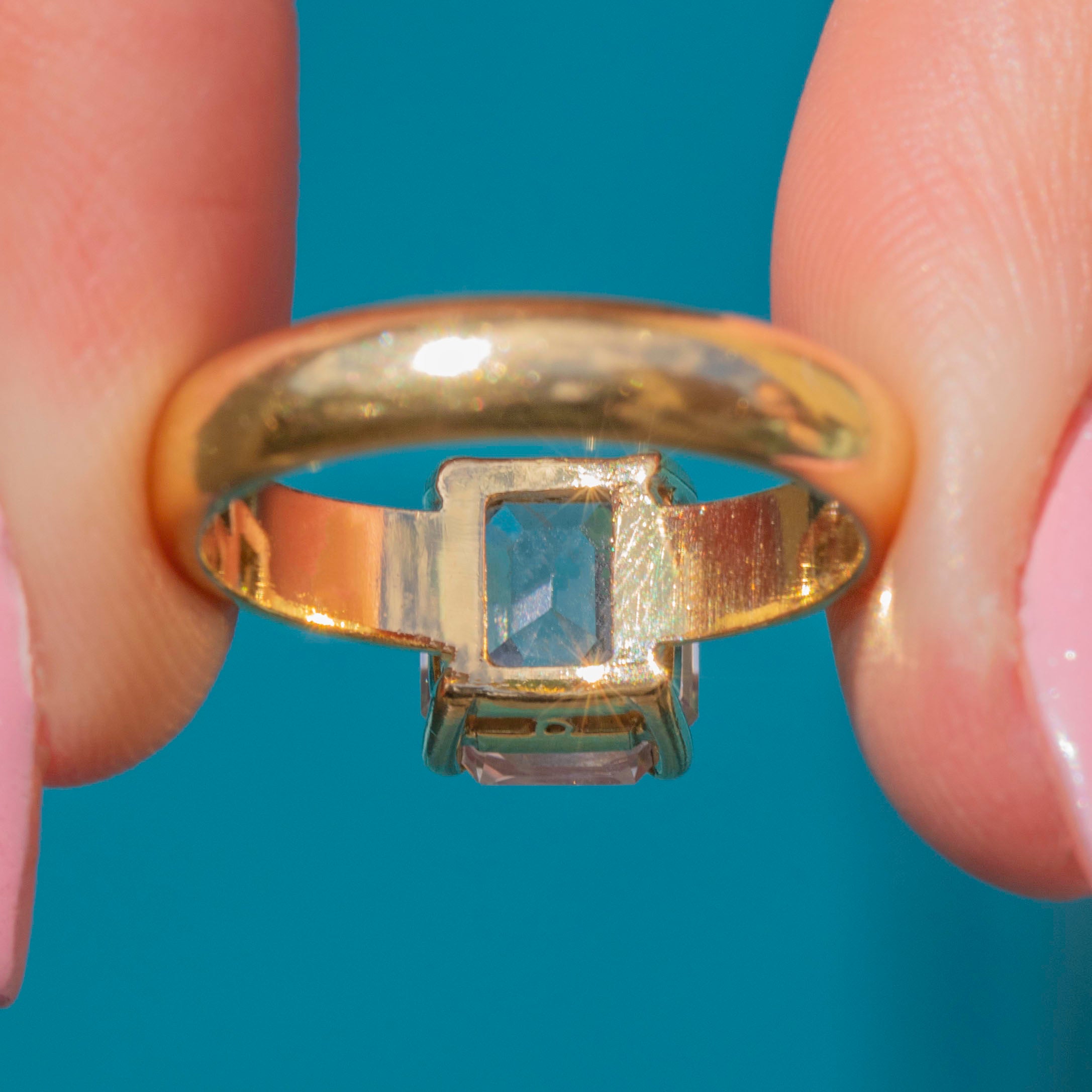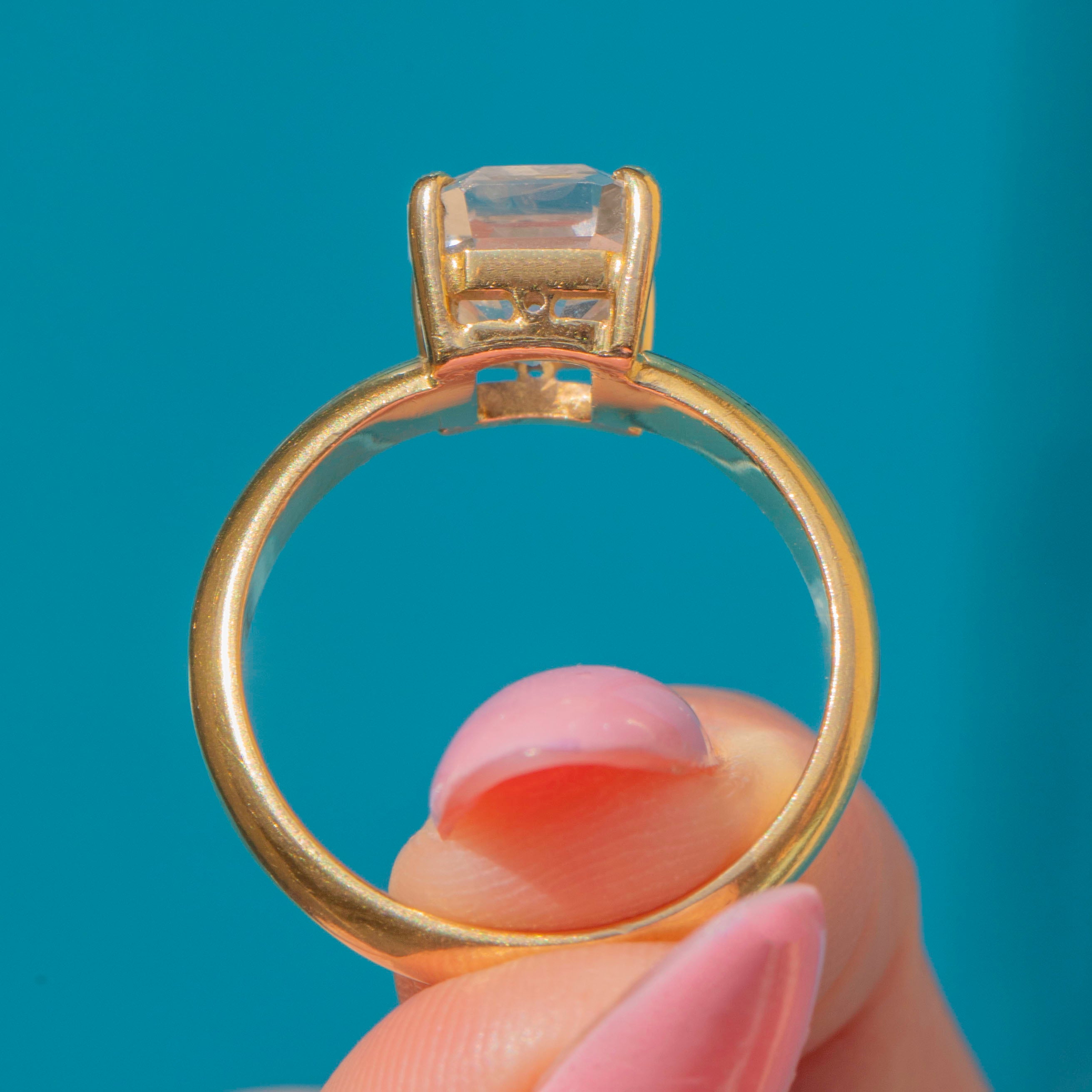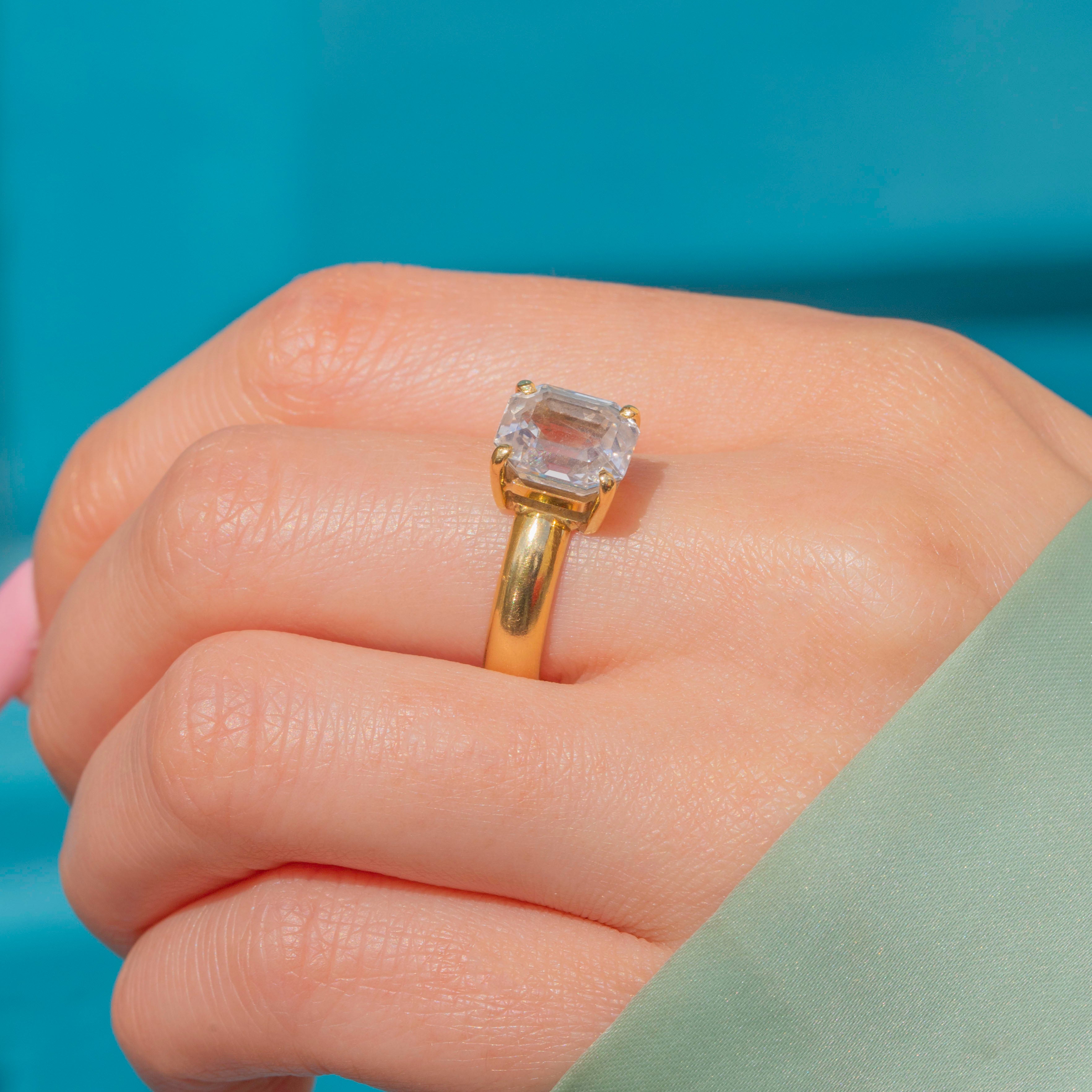 In her centre sits a stunning Moissanite (equivalent to a 3.00ct Diamond in weight) which is beautifully faceted in an Emerald-cut to catch the light wonderfully. The scintillating Moissanite is set within glossy 18ct Gold claw settings, with a gorgeous gallery and chunky band, allowing for ample finger coverage.