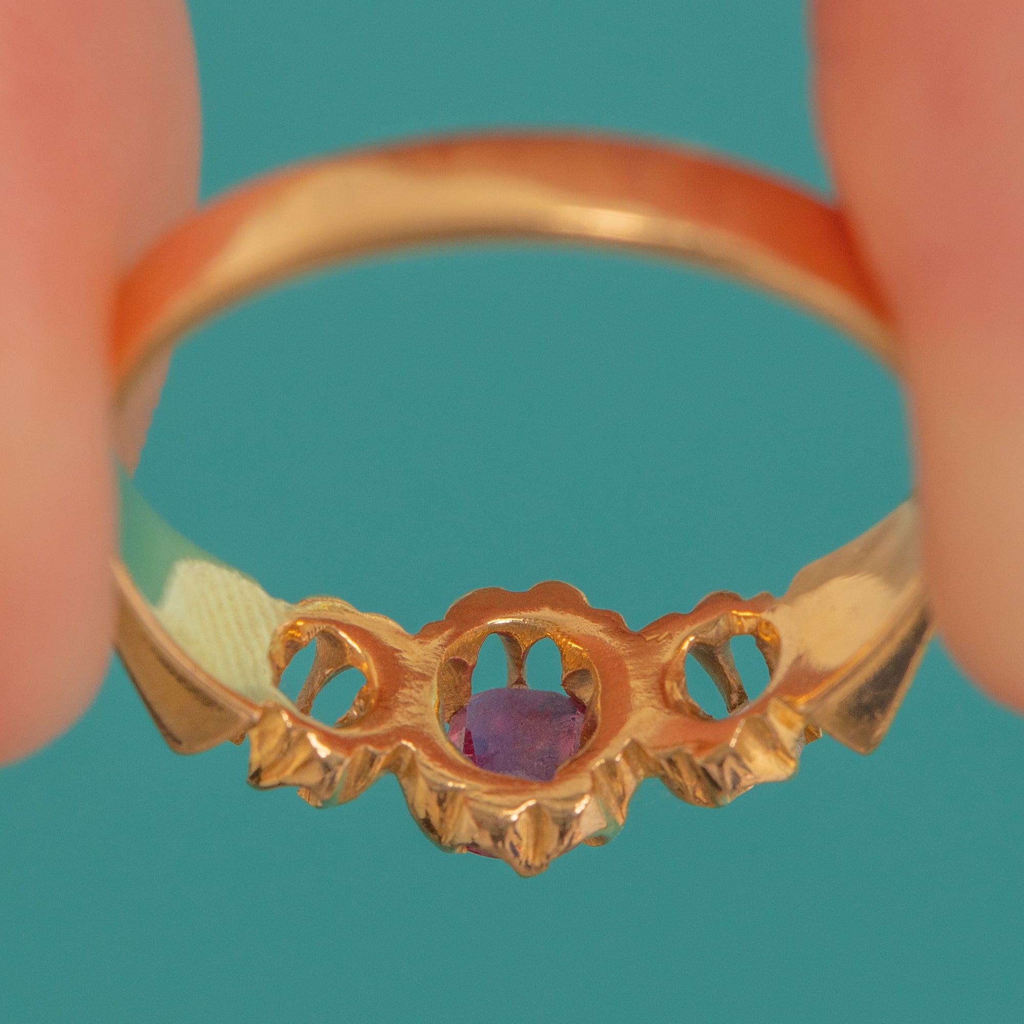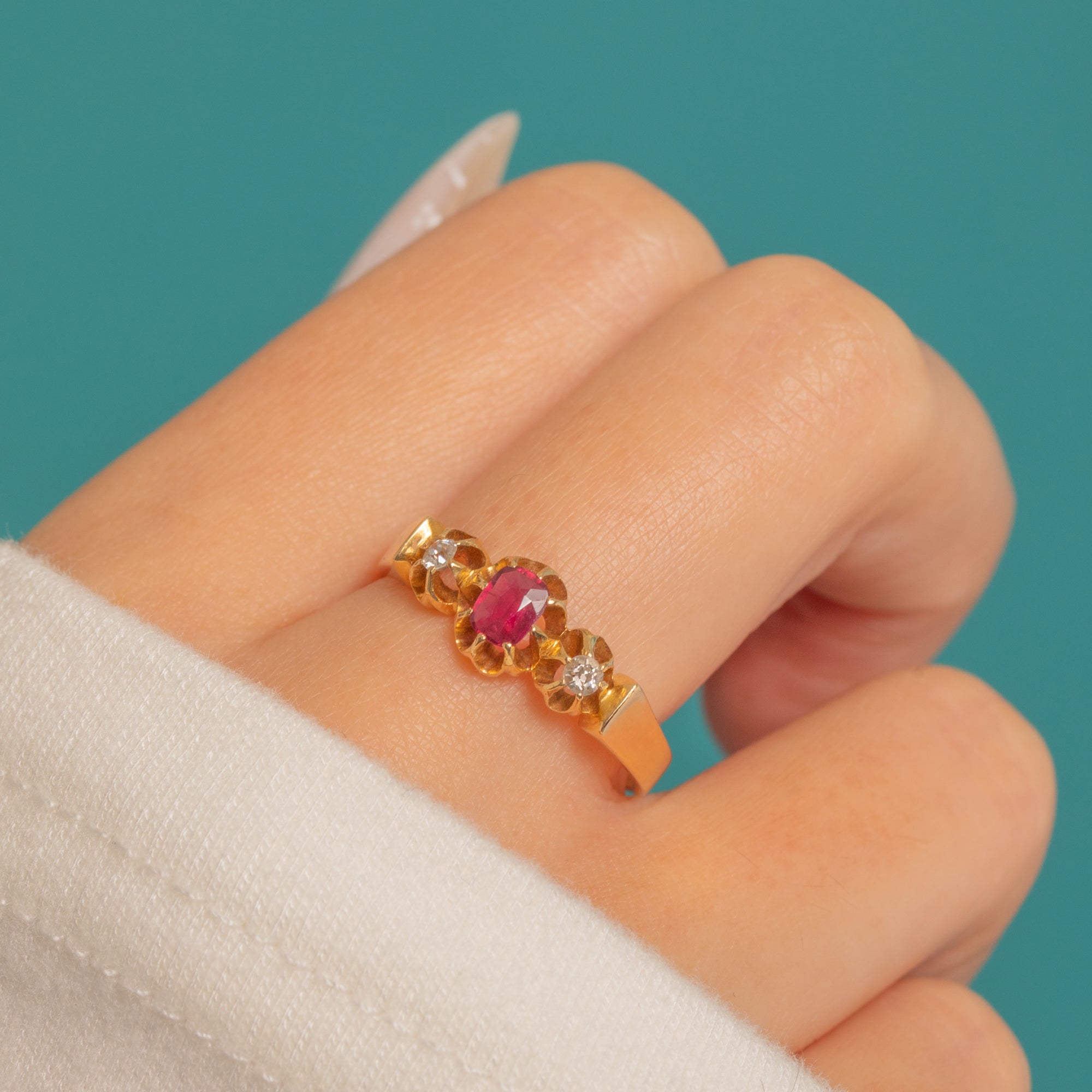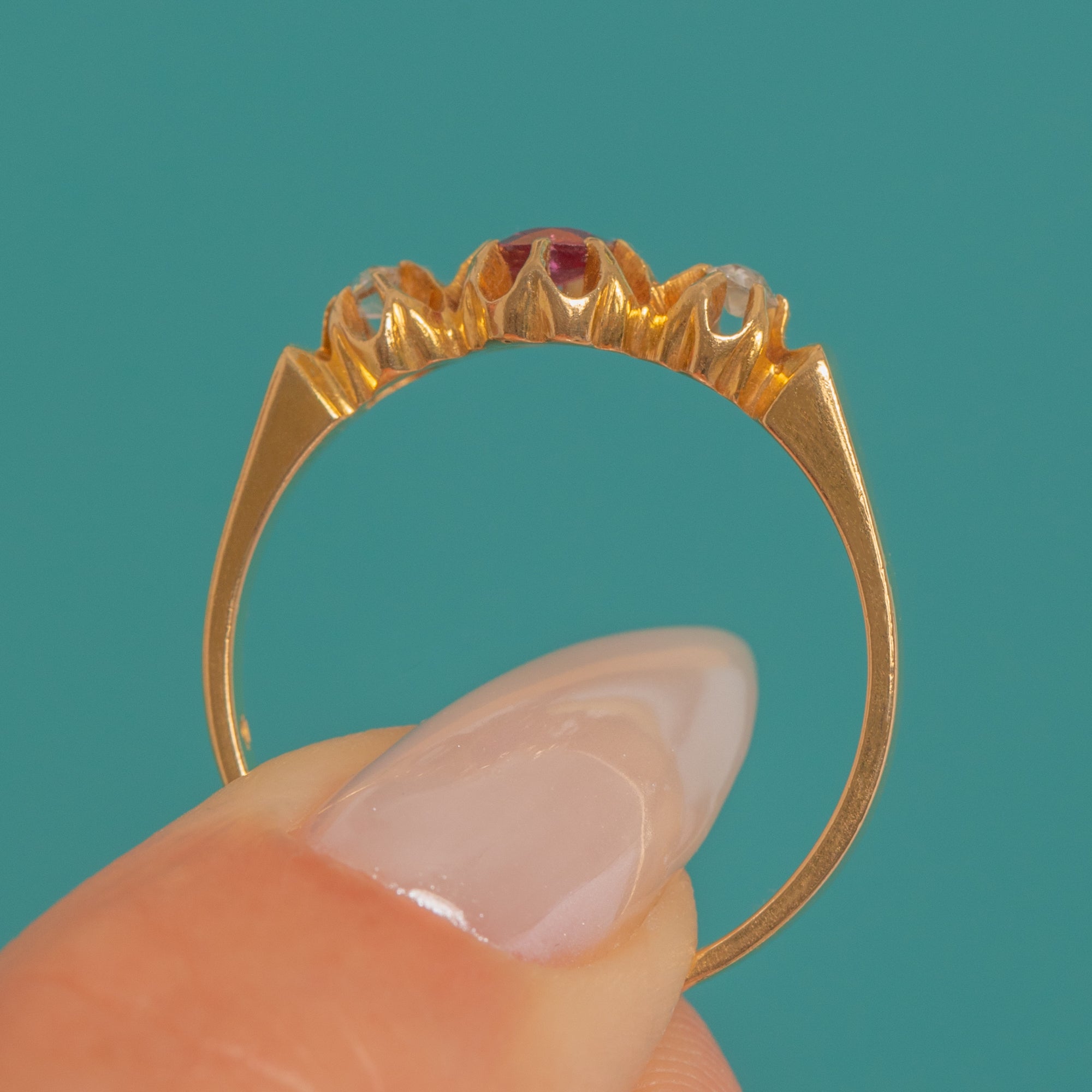 A romantic Belle Époque trilogy ring in rich 18ct Gold, set with a deep pink-red Natural Ruby in old cushion cut between two sparkling old mine cut Diamonds. The stones sit in characterful buttercup settings, with subtly scrolled, tapered shoulders flowing into a polished shank.