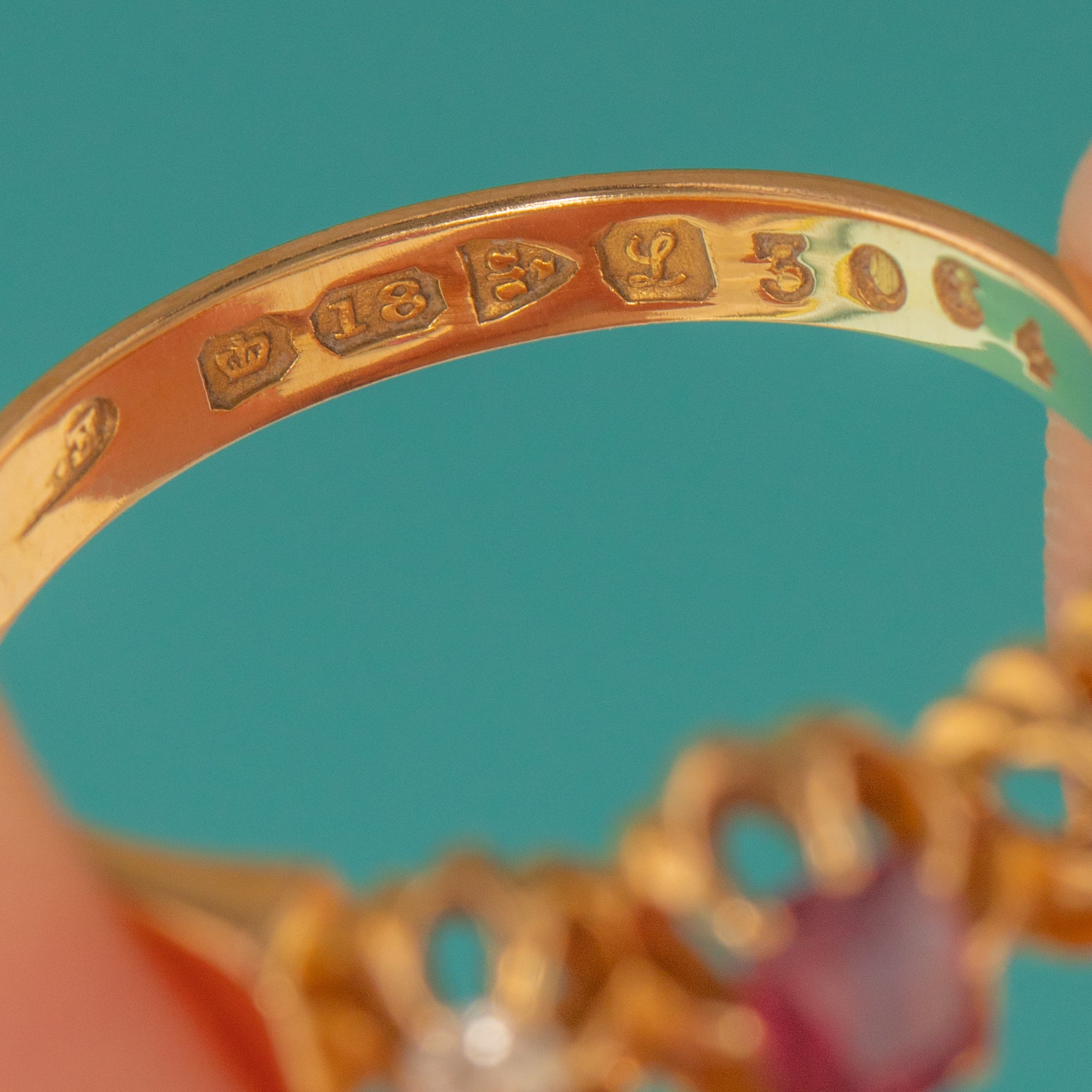 HALLMARKS: Crown, “18”, Chester assay mark, date letter “L” for 1911.