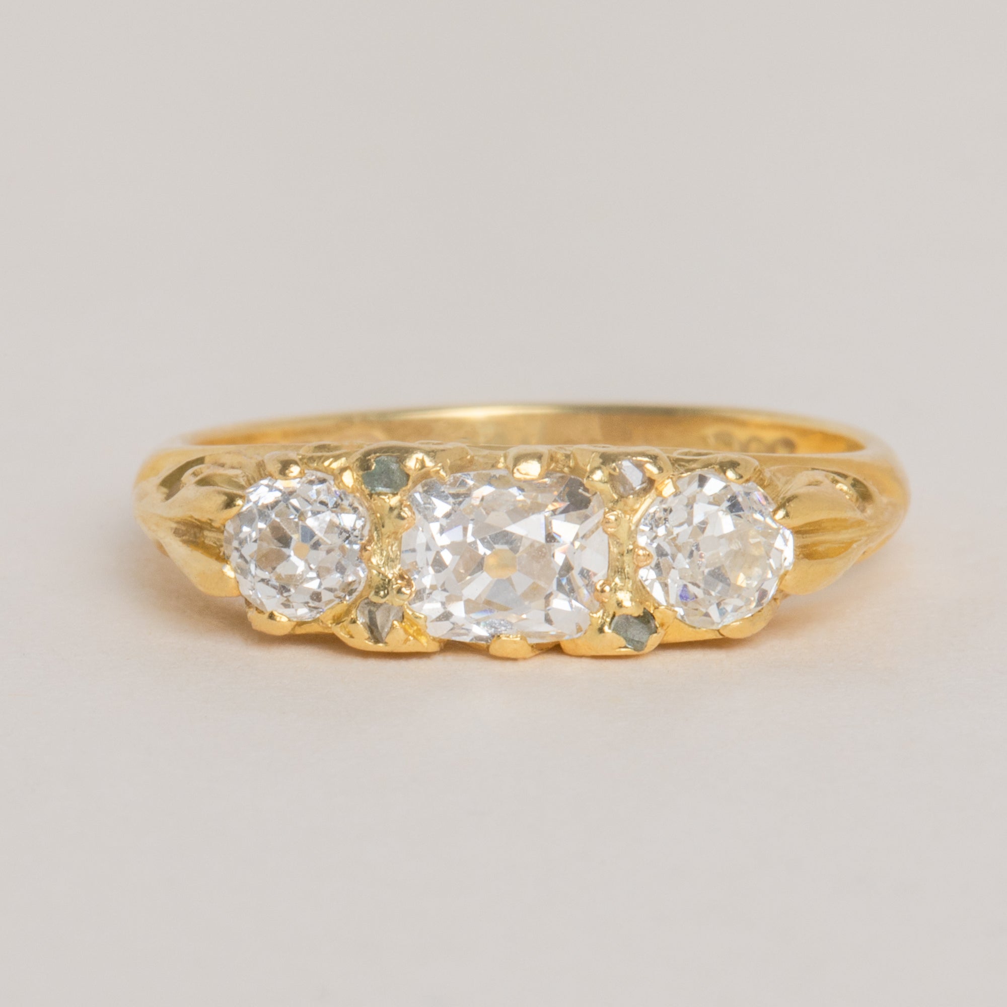 EXCELLENT. With little to report, this 18ct Gold old mine-cut Diamond three stone ring is in excellent condition. The antique cut Diamonds are fabulously faceted and free from any chips or fleabites. The Diamond spacers are all present and secure. The Gold scrollwork is in tip top condition sitting laced either side of the Diamonds, keeping them secure within their settings. Although not perfectly round, the ring band is smooth to the touch and sits comfortably; she would make a fine engagement ring choice!