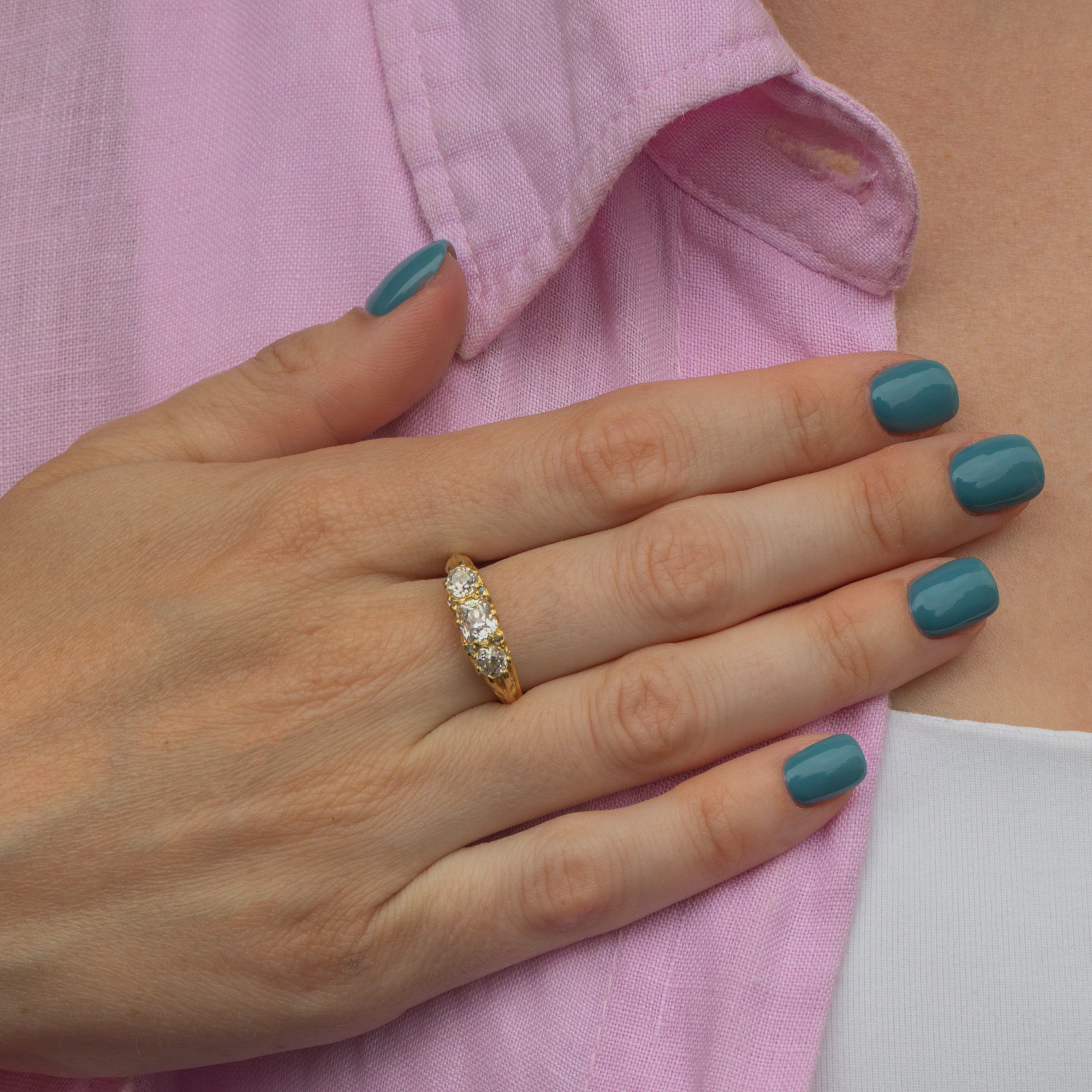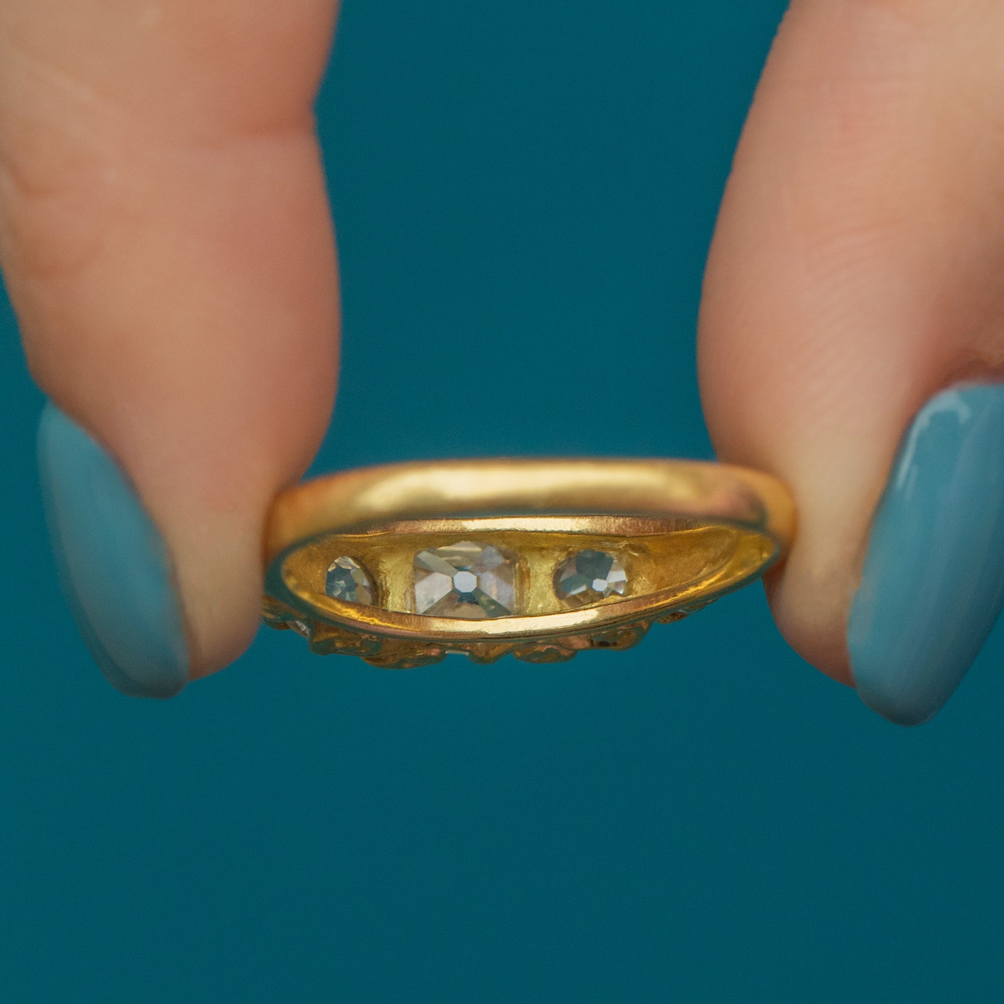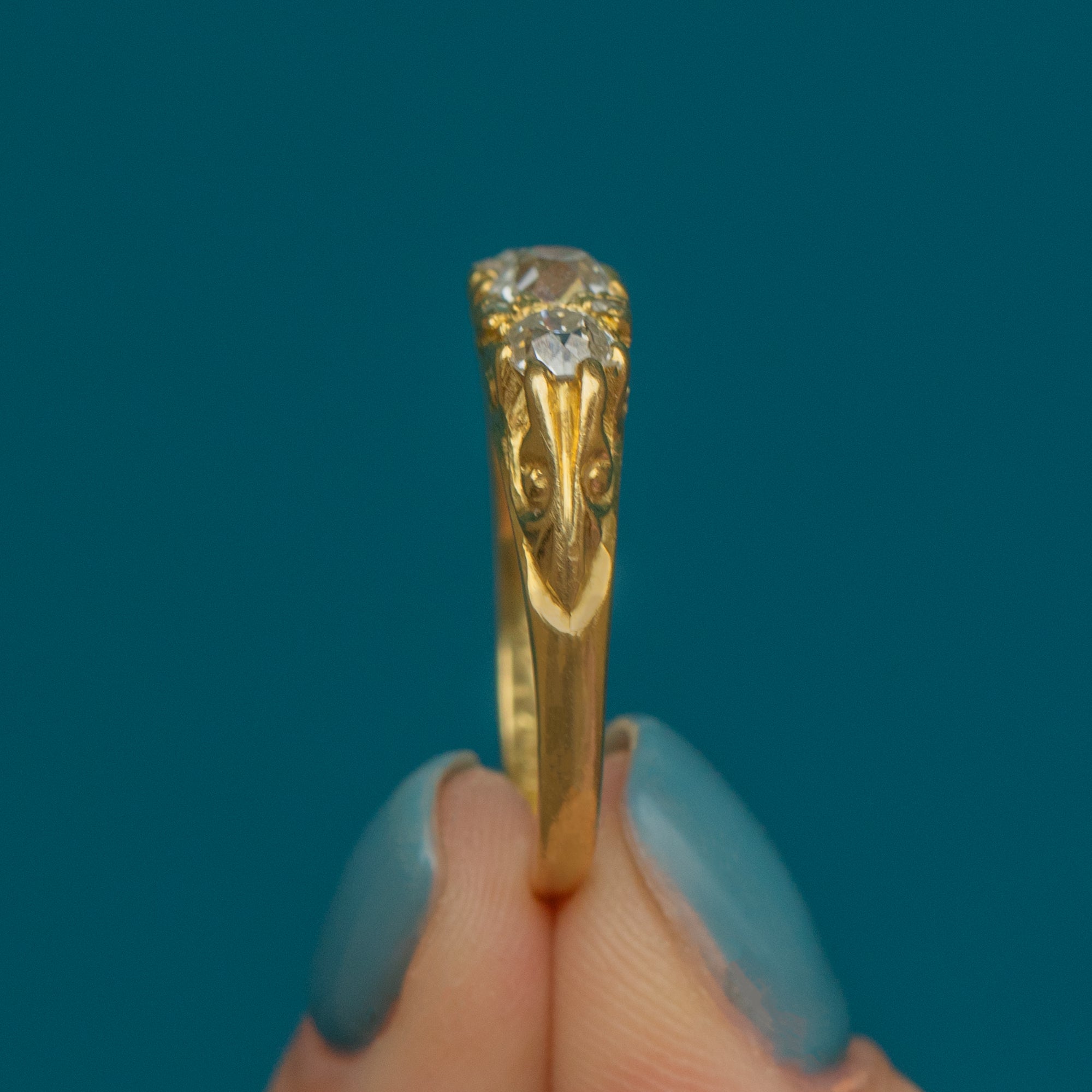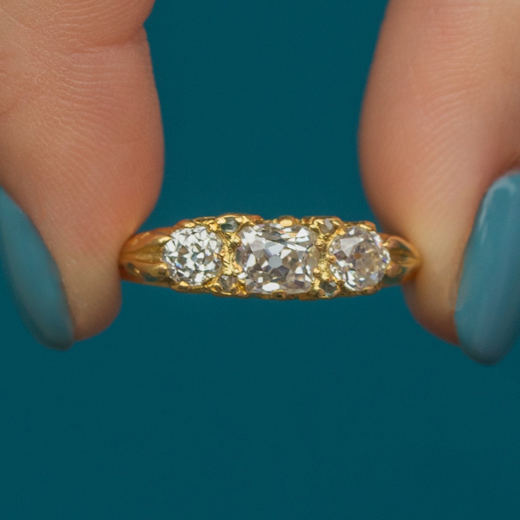 Poised atop a scrollwork gallery crafted from sumptuous 18ct Gold, her splendour can be enjoyed from all angles as she is secured around your finger with a smooth Gold band. And as if her three old mine-cut Diamonds weren't enough, they are accompanied by four peppery Diamond spacers for a finishing touch.