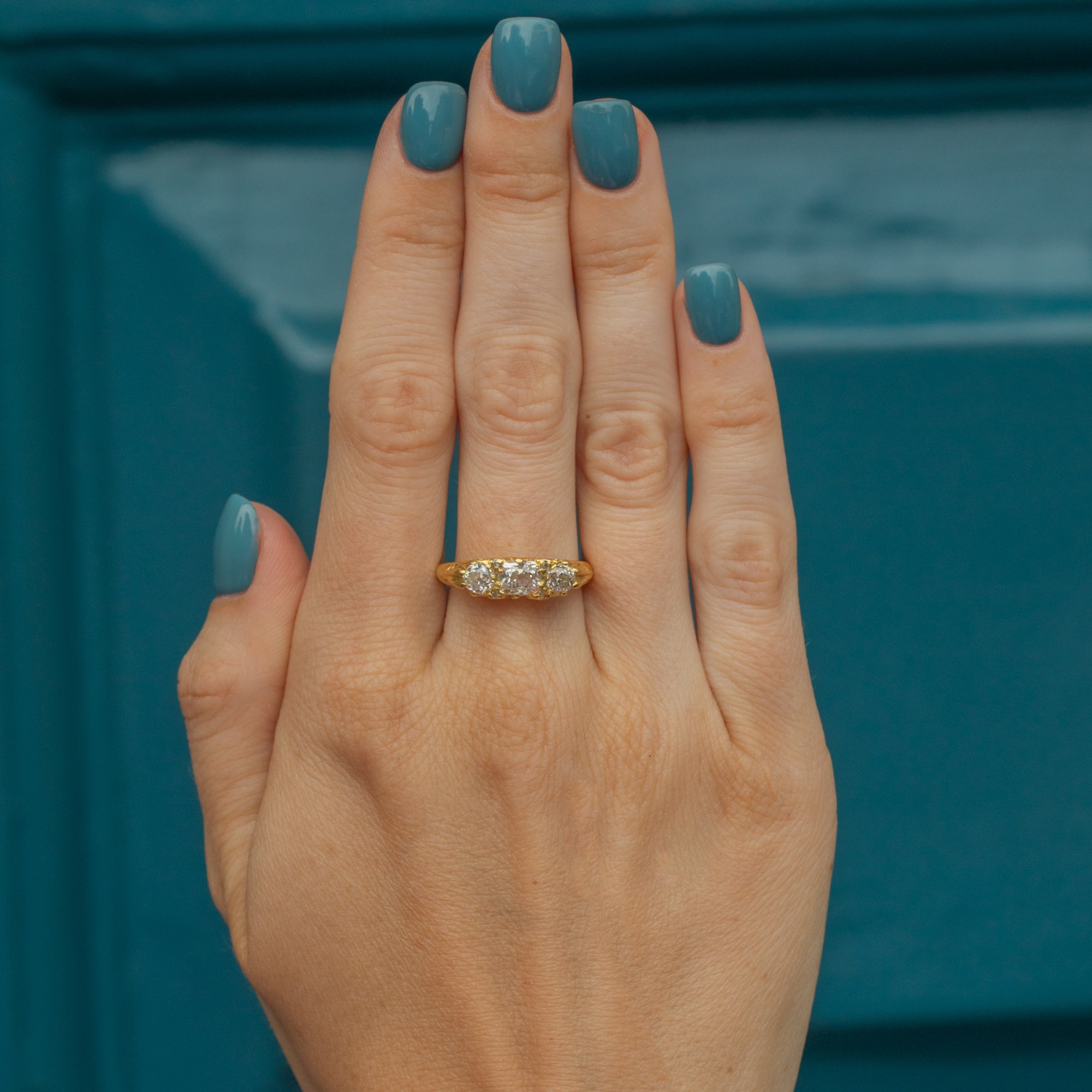 Stand out from the crowd with this 18ct Gold old mine-cut Diamond three stone ring! You will instantly become spellbound by the captivating sparkle that dances across her three old mine-cut Diamonds, a combined carat weight of 0.92ct, with the central Diamond alone weighing in at an impressive 0.50ct alone. With Diamond flickers so crisp and vivacious, she doesn't require light to sparkle.