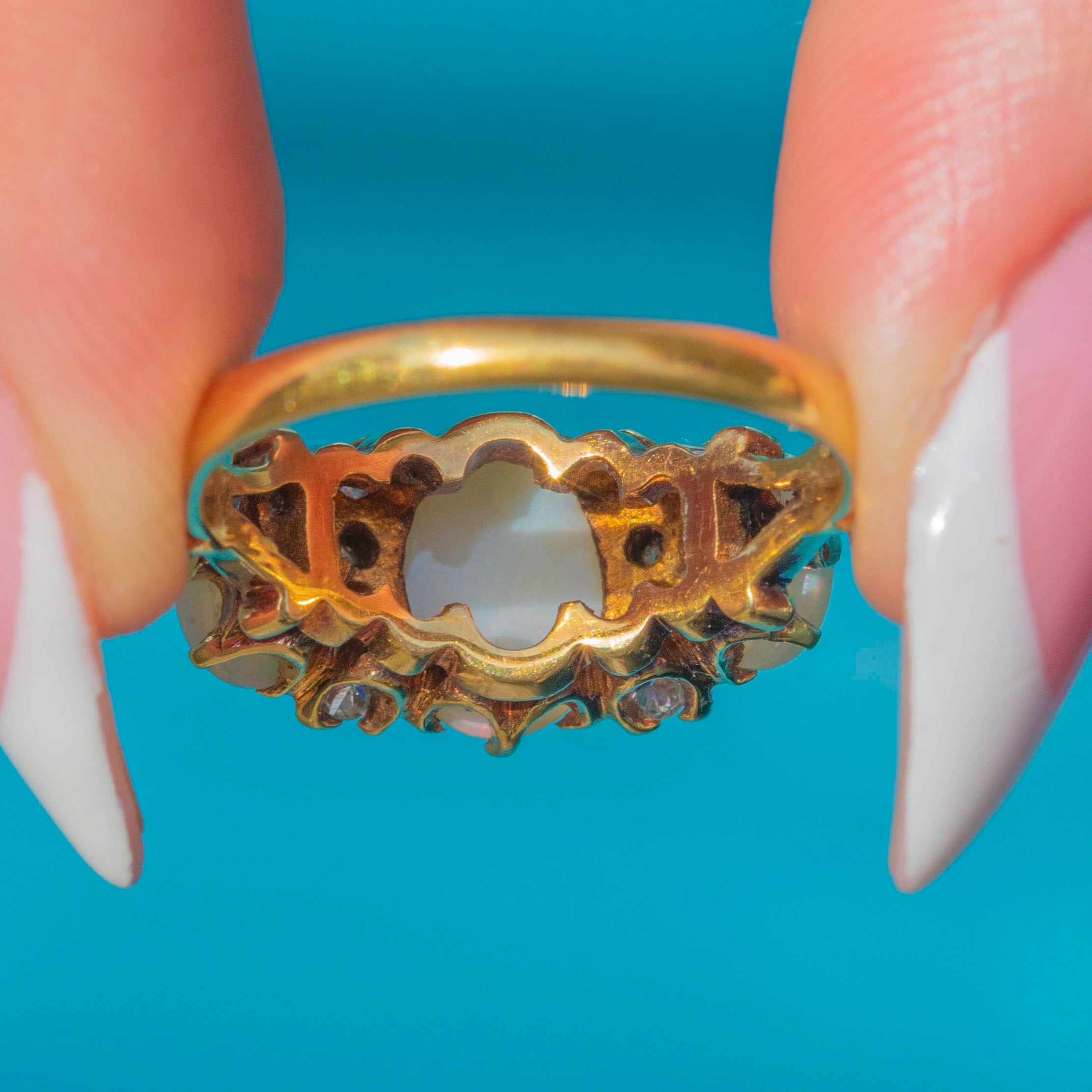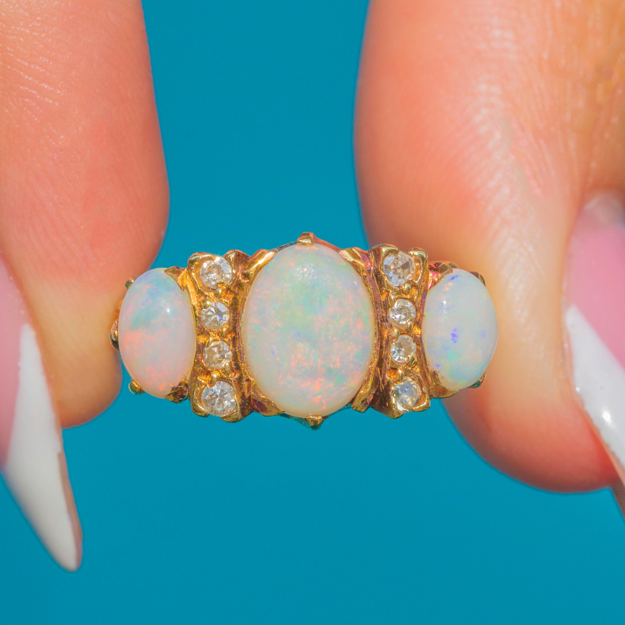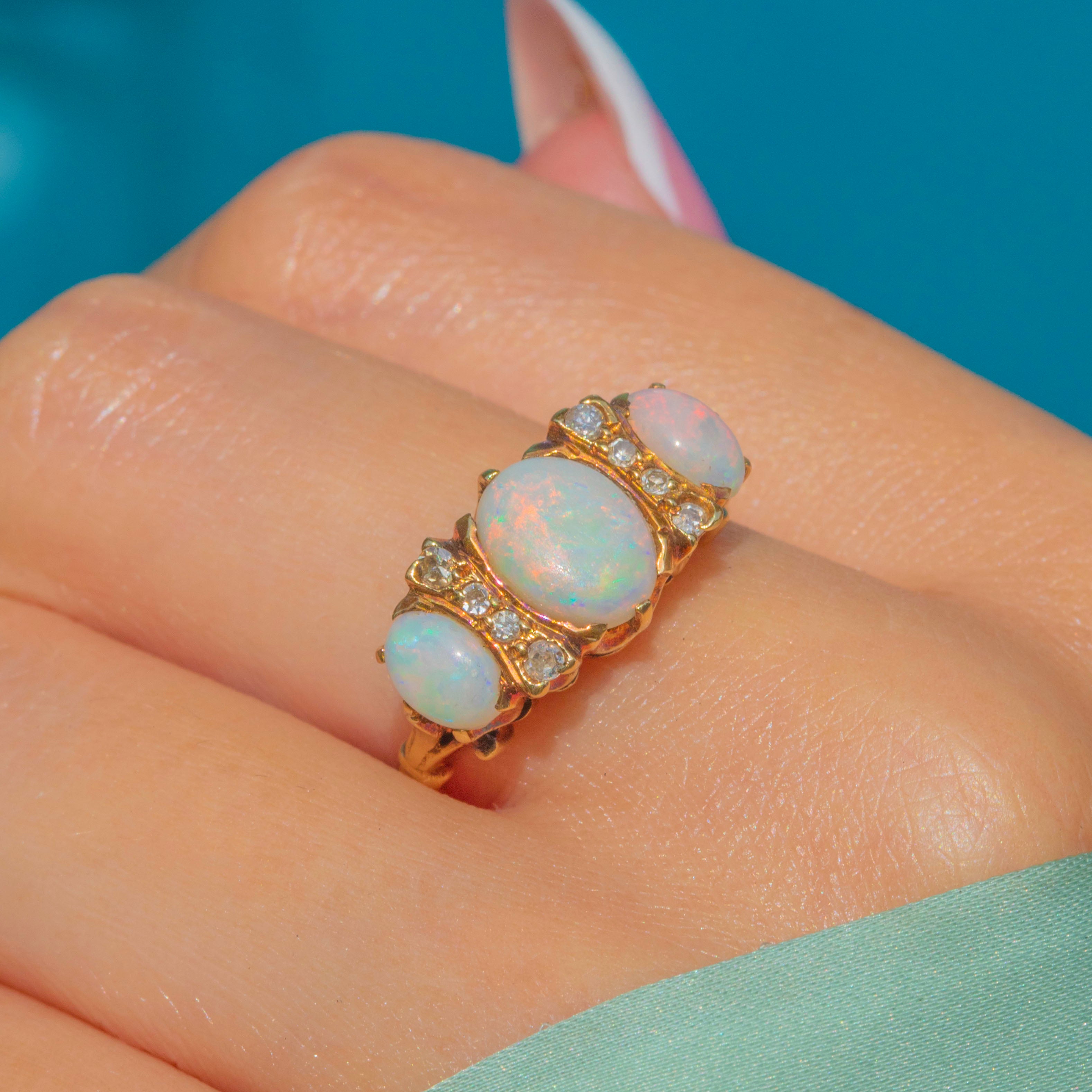 EXCELLENT: The Opals and Diamonds are in beautiful condition, with no visible chips or abrasions. The setting and band are pristine, and the piece has clearly been well cared for over time.