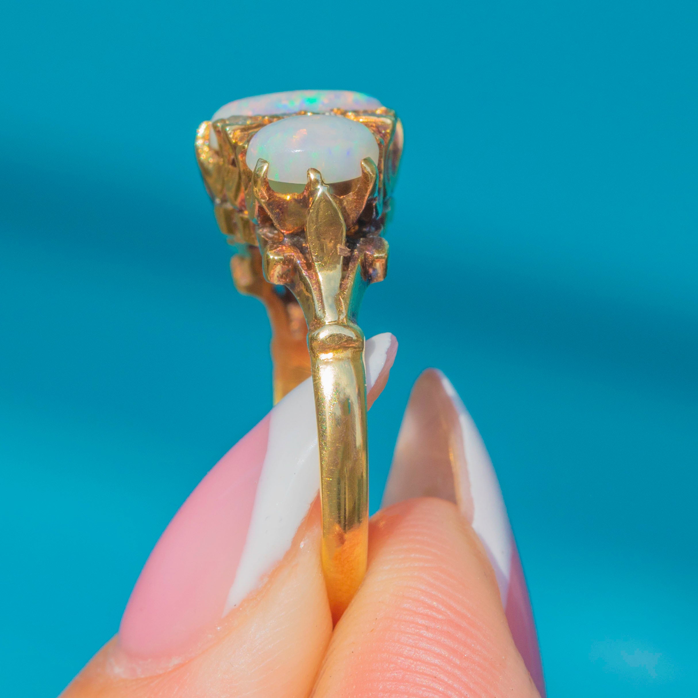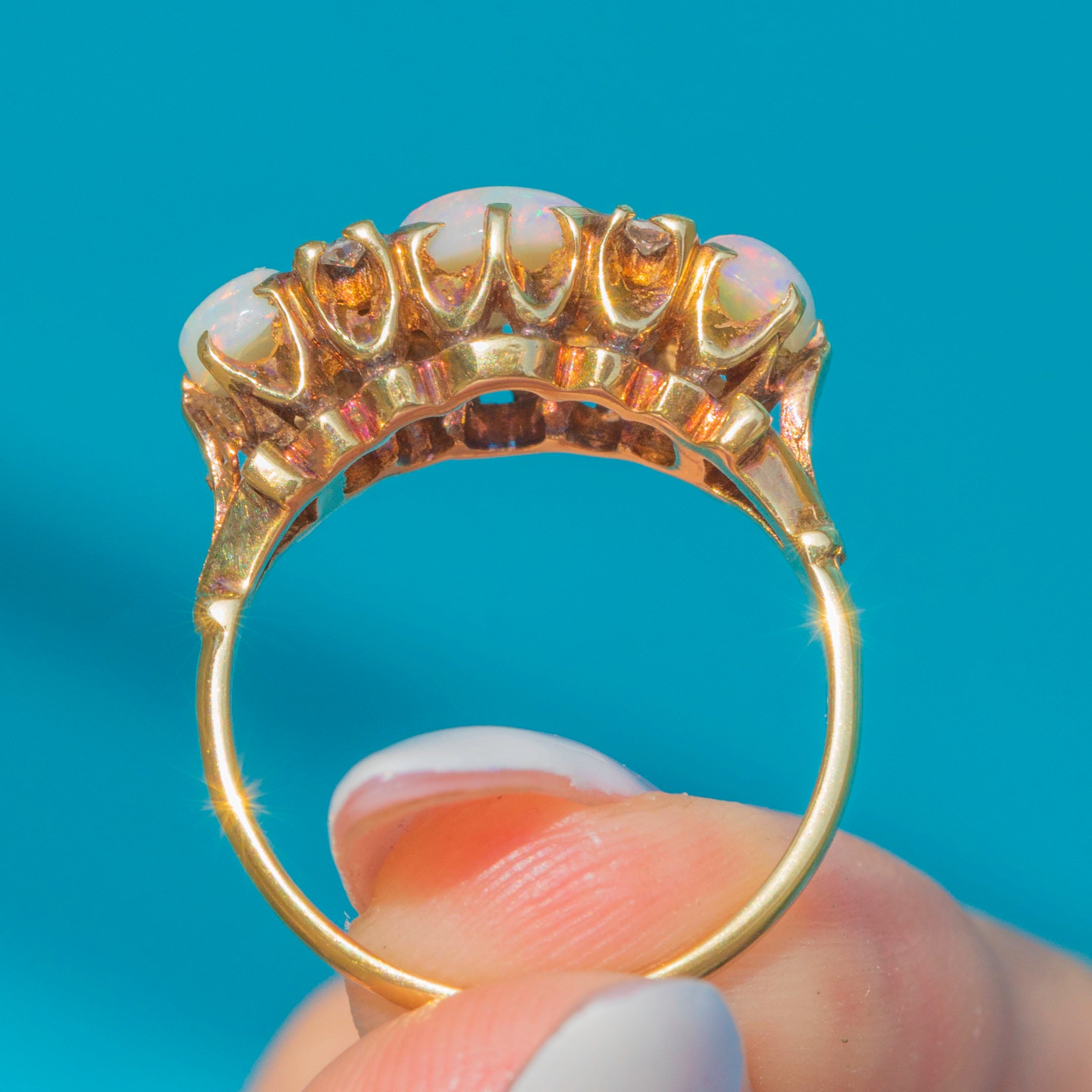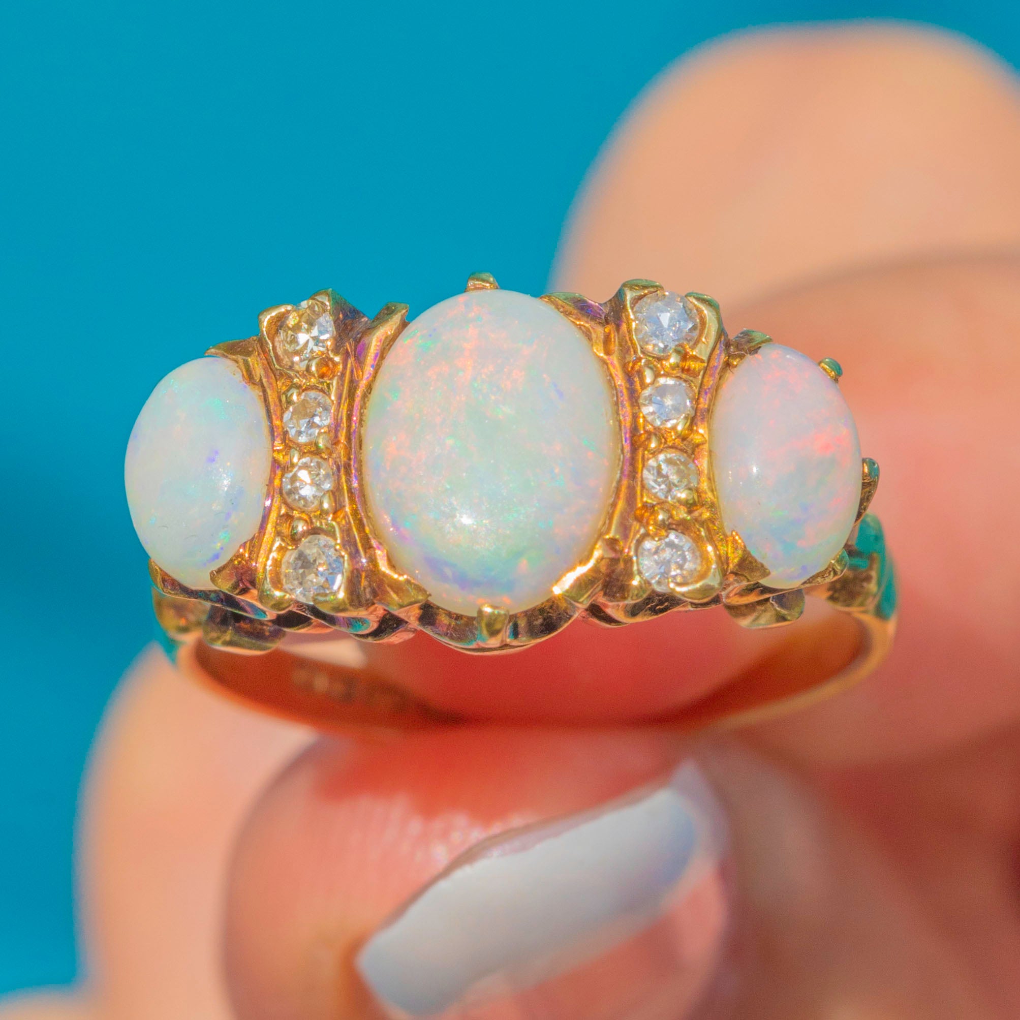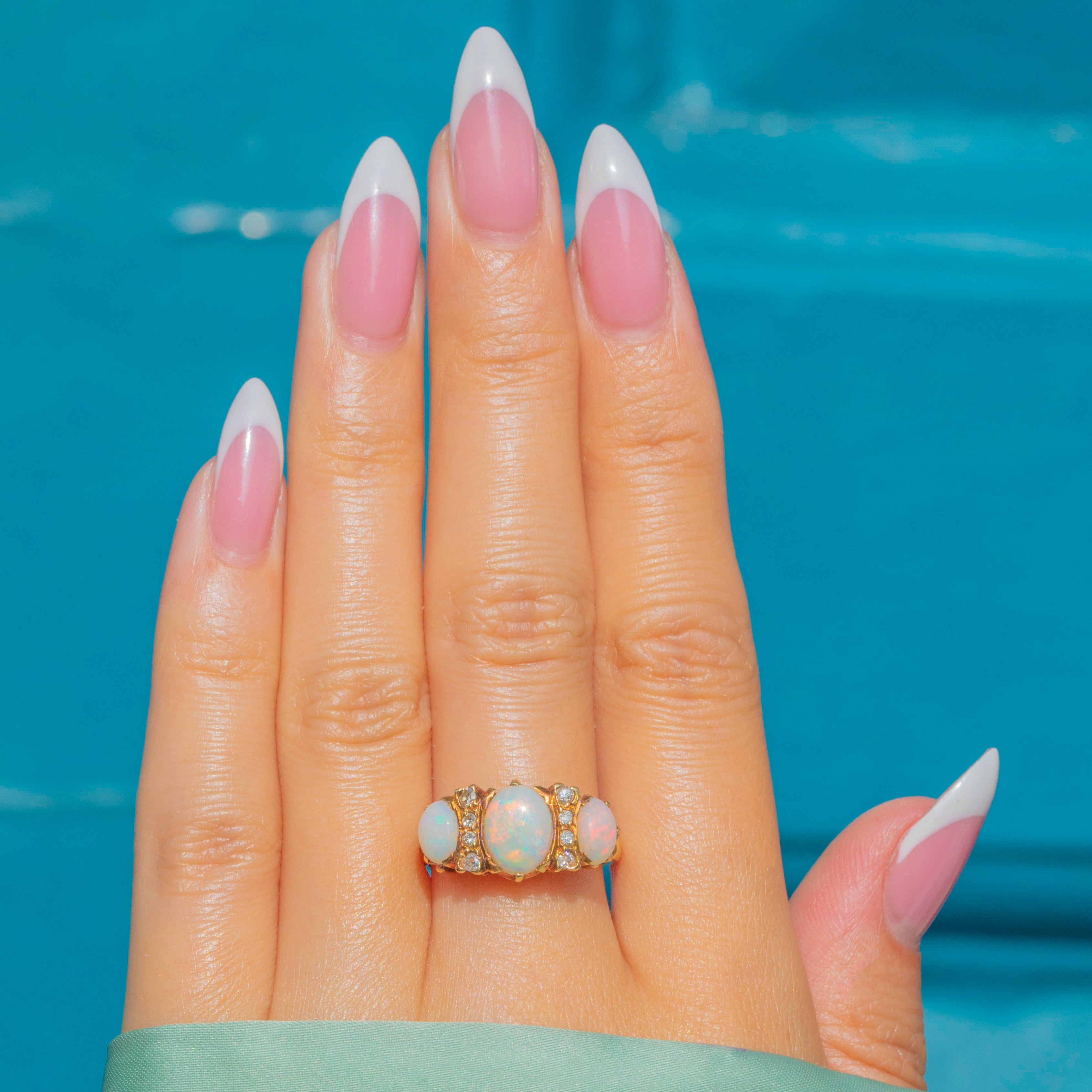 This elegant Vintage Opal ring dates to 1972 and is crafted in rich 18ct Gold. The central Opal is flanked by smaller Opals and Diamonds, creating a vibrant and luminous design. The Opals display subtle internal flashes of colour, while the Diamonds add a delicate sparkle.
