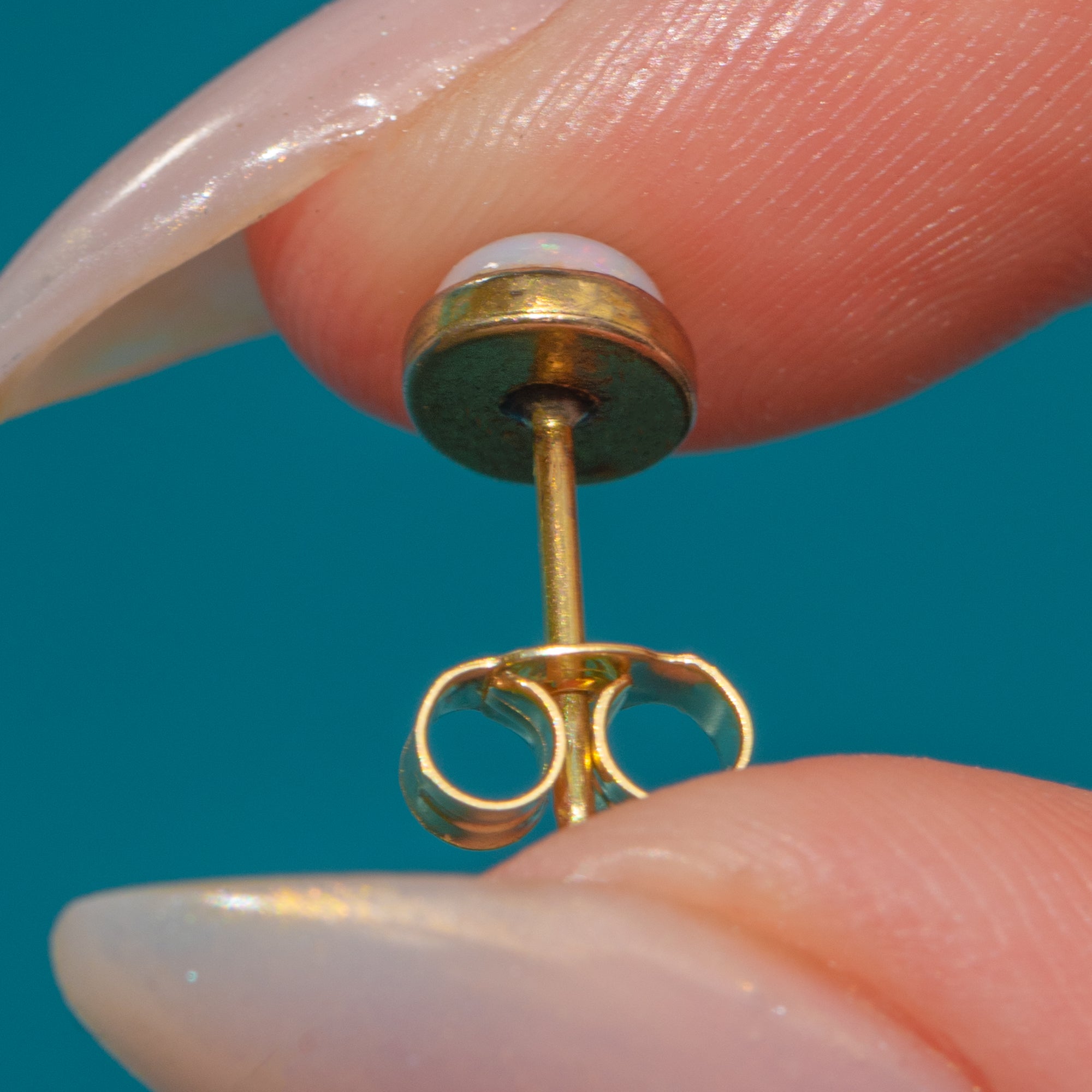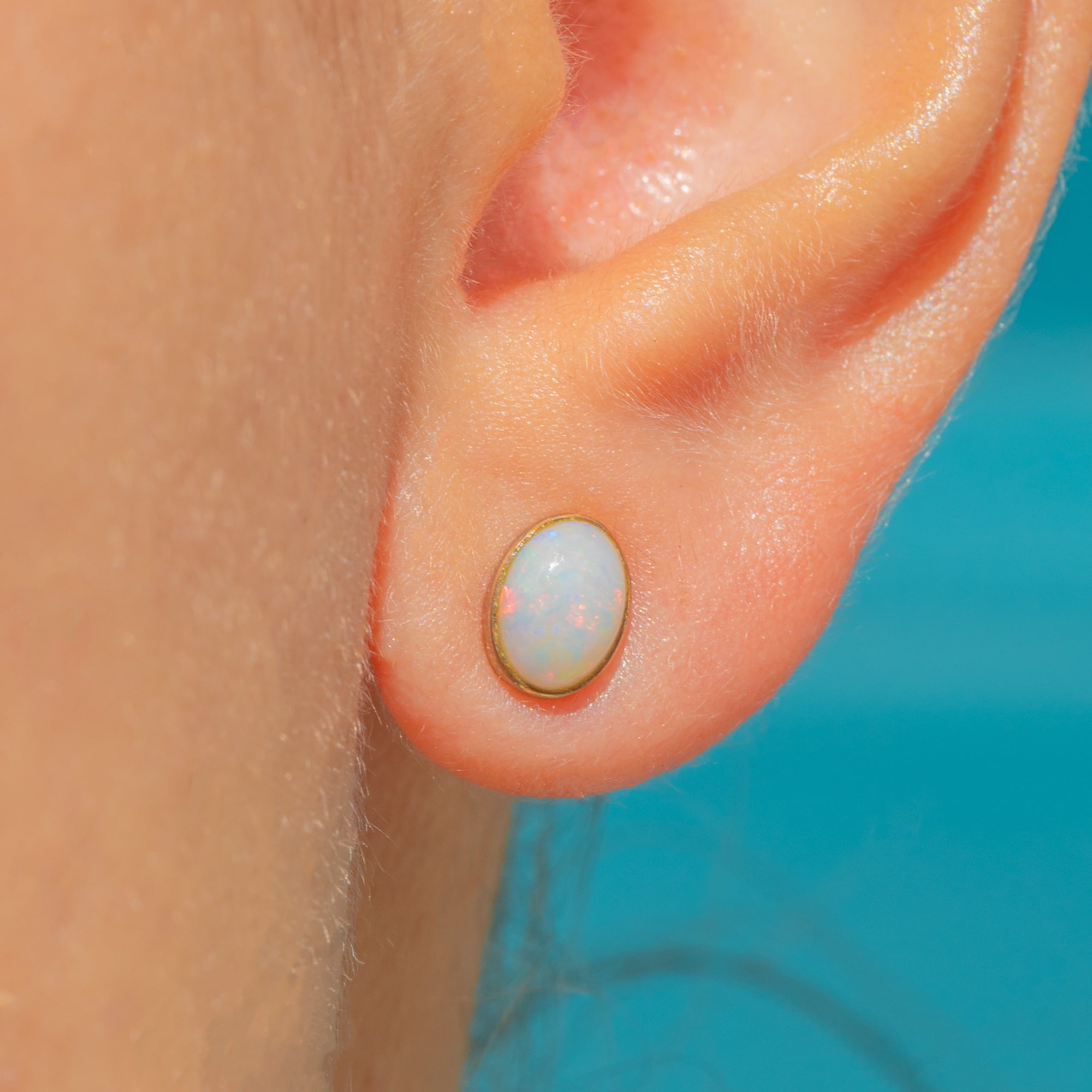 The stones are bezel-set for a sleek, modern finish, offering both security and elegance. Stamped “750” on the butterfly backs, these earrings are a classic design that allows the natural beauty of the Opals to take centre stage.