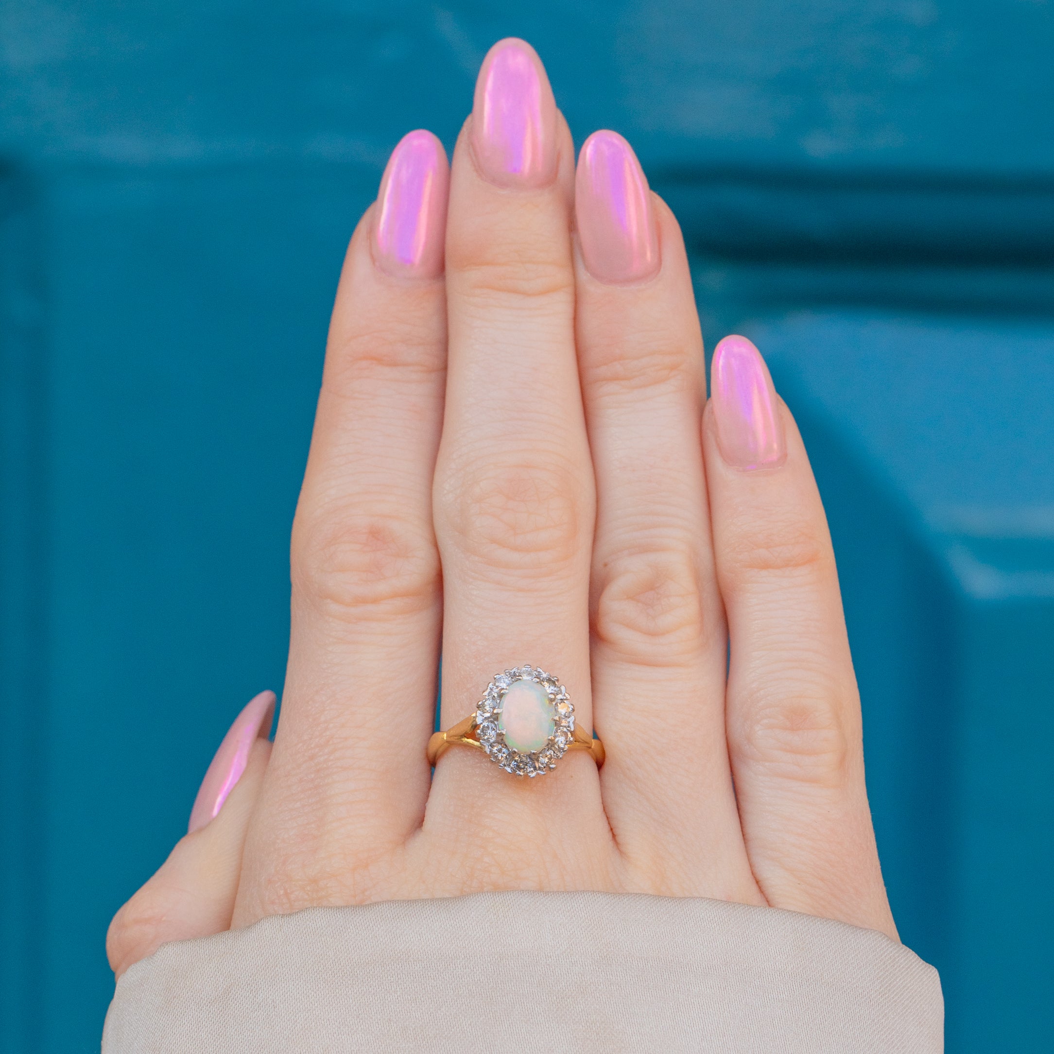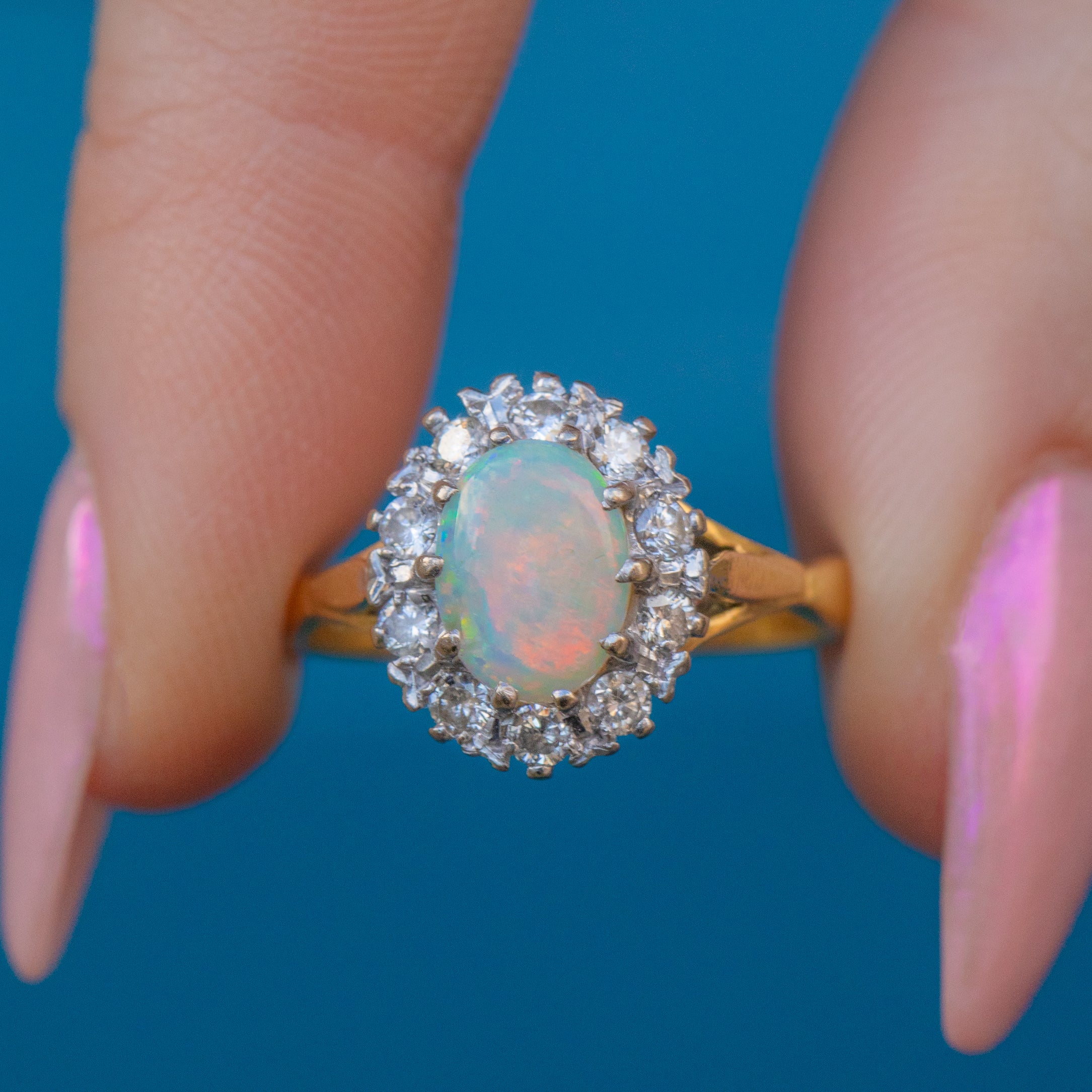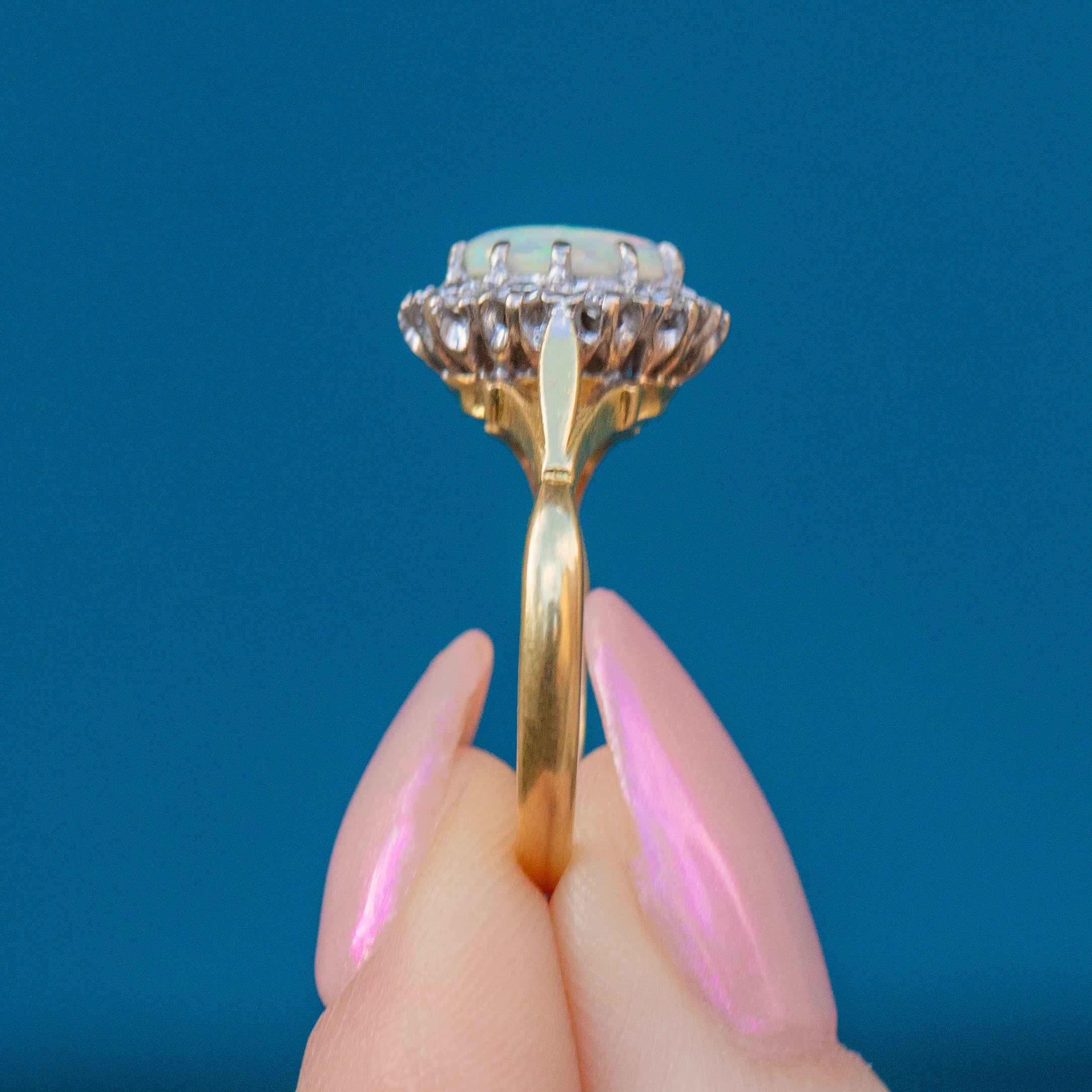 Add a touch of timeless elegance to your collection with this breathtaking 18ct Gold Opal Diamond oval cluster ring!