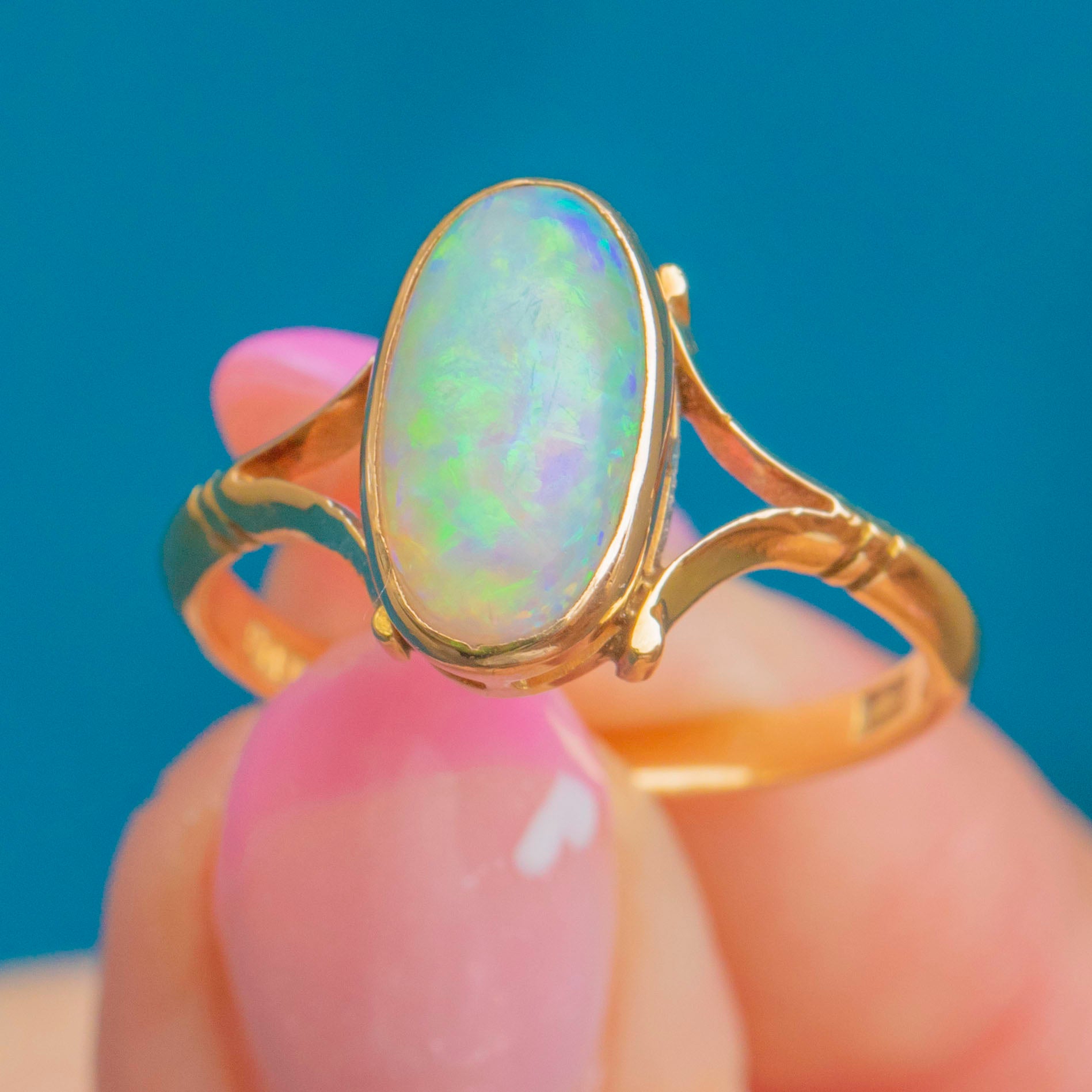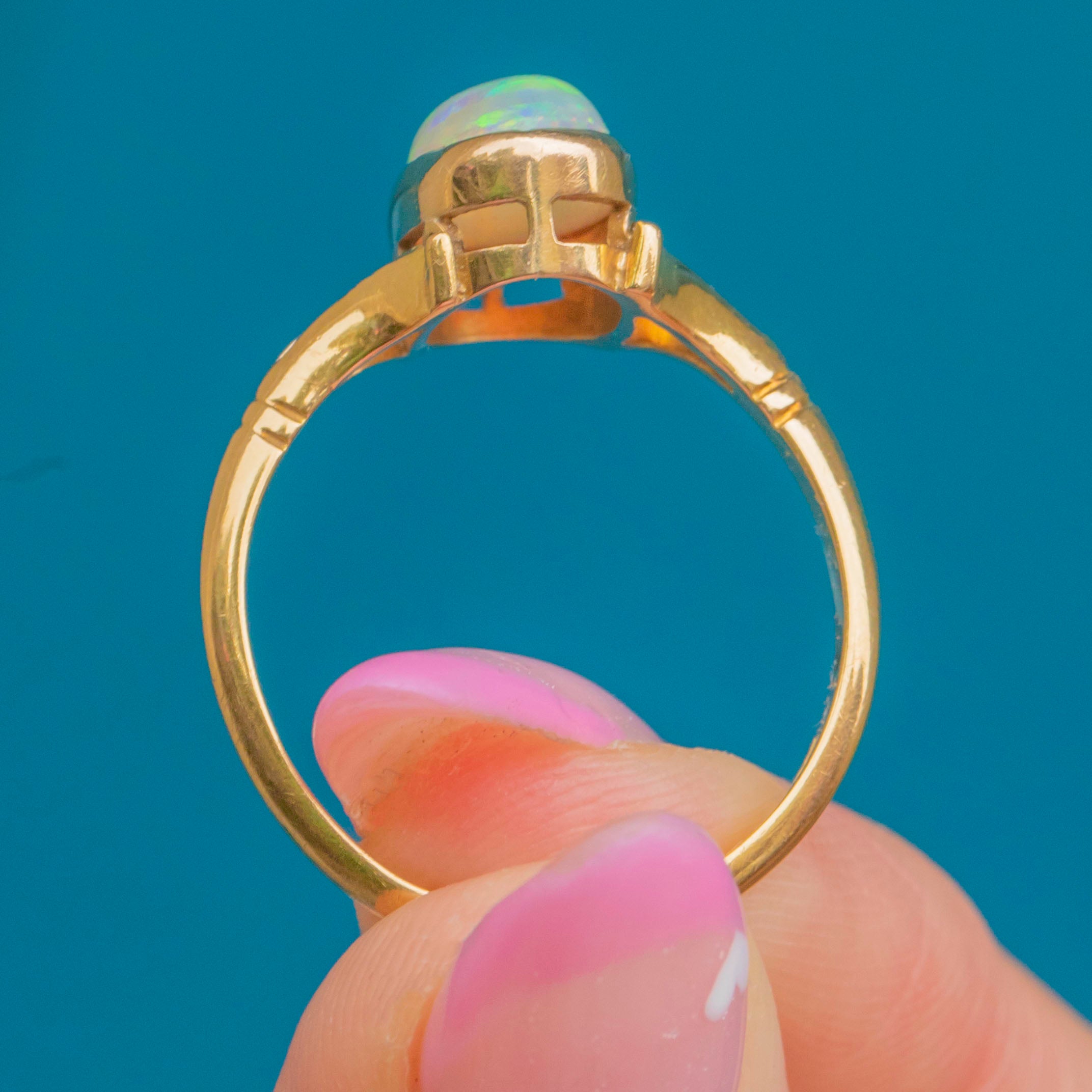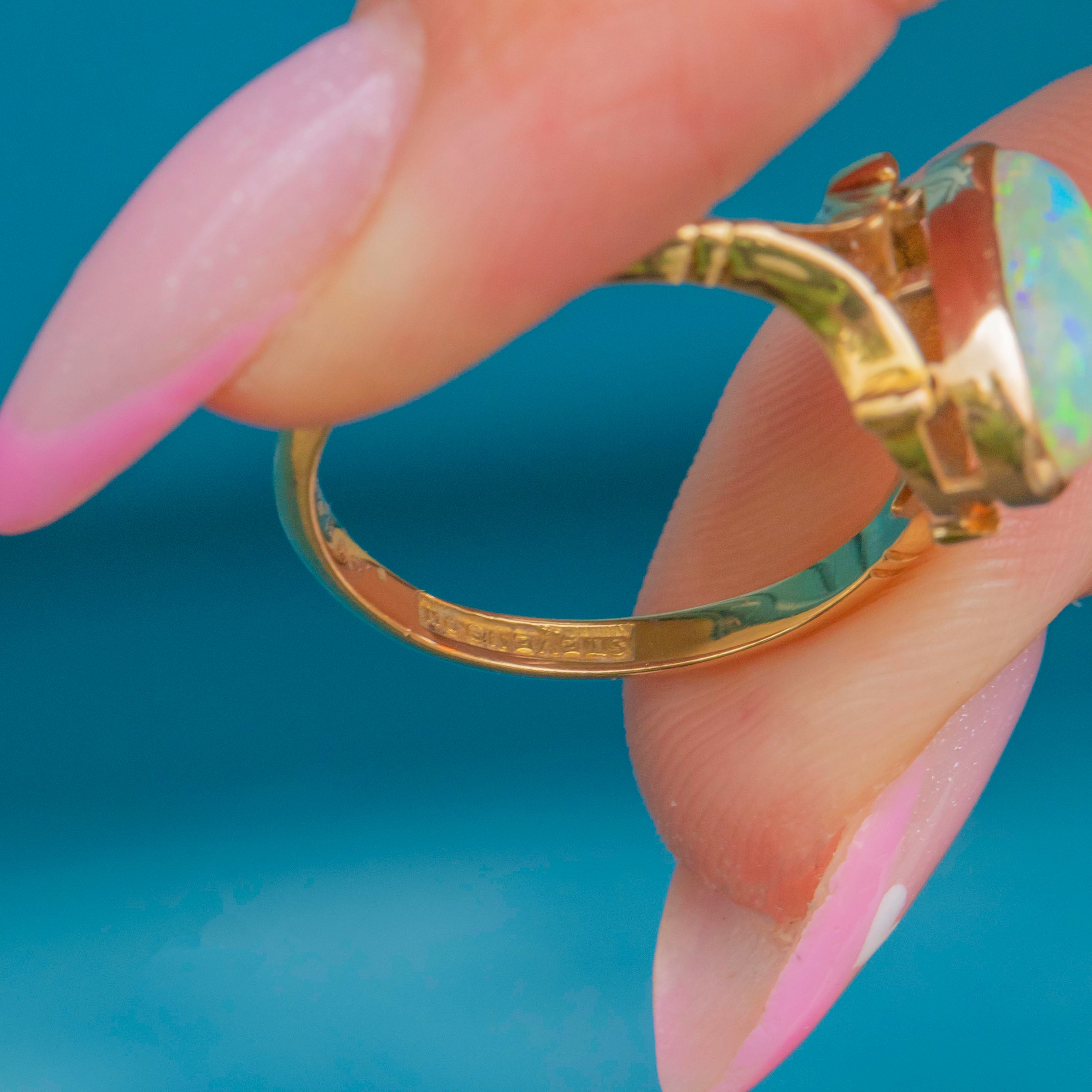 EXCELLENT: The Opal is bright and stable with lively colourplay. The Gold setting is smooth, glossy and well preserved with crisp stamps and a secure split-shoulder design.