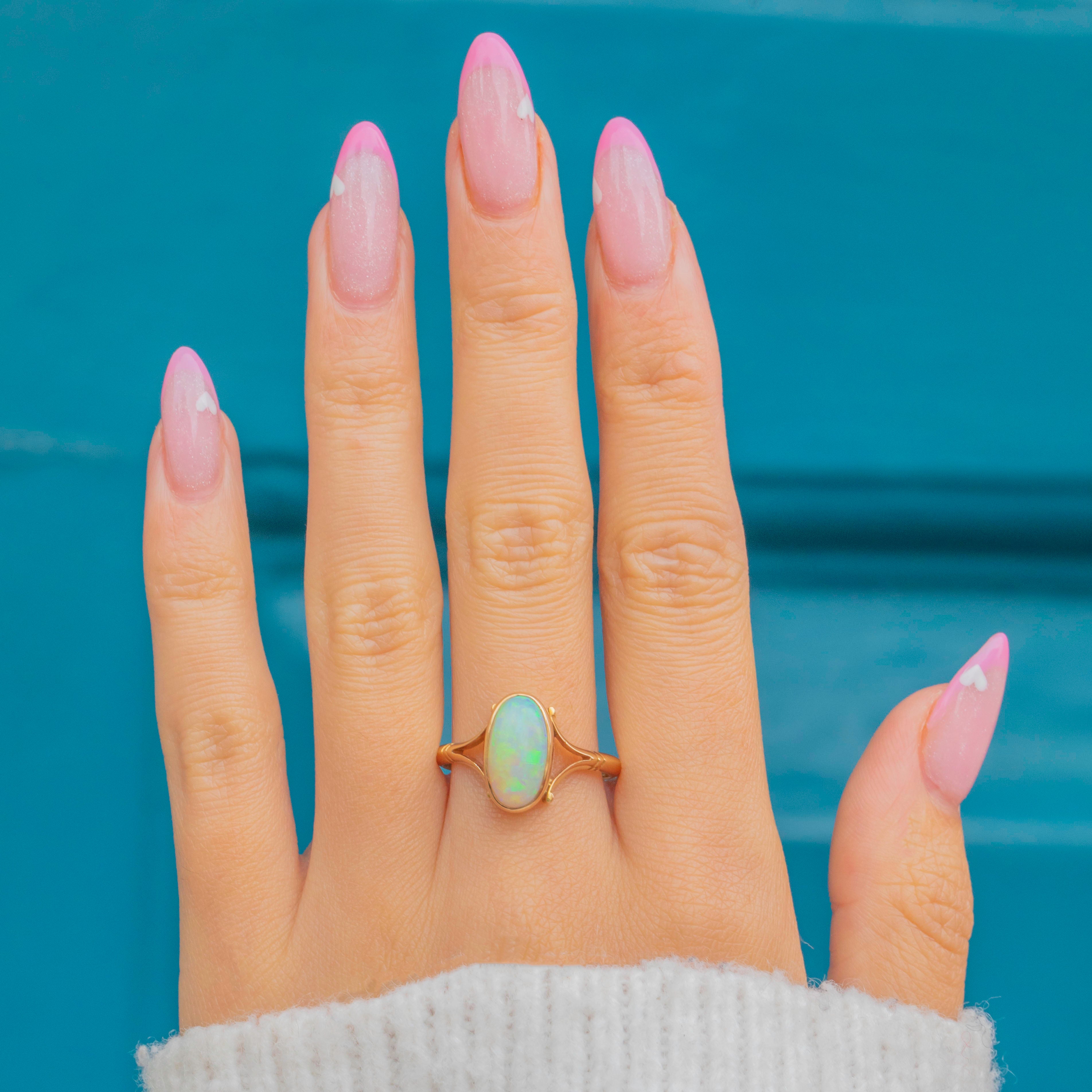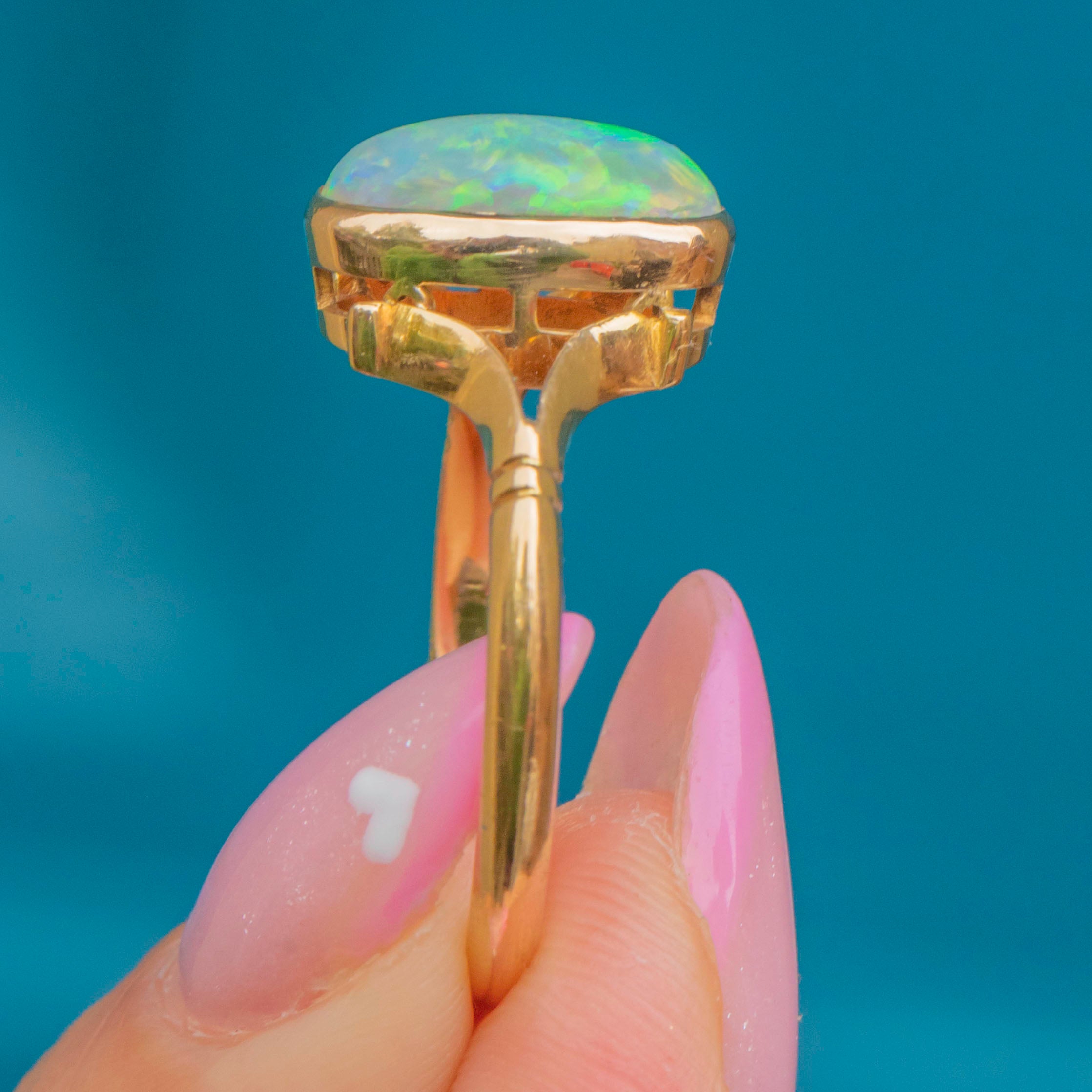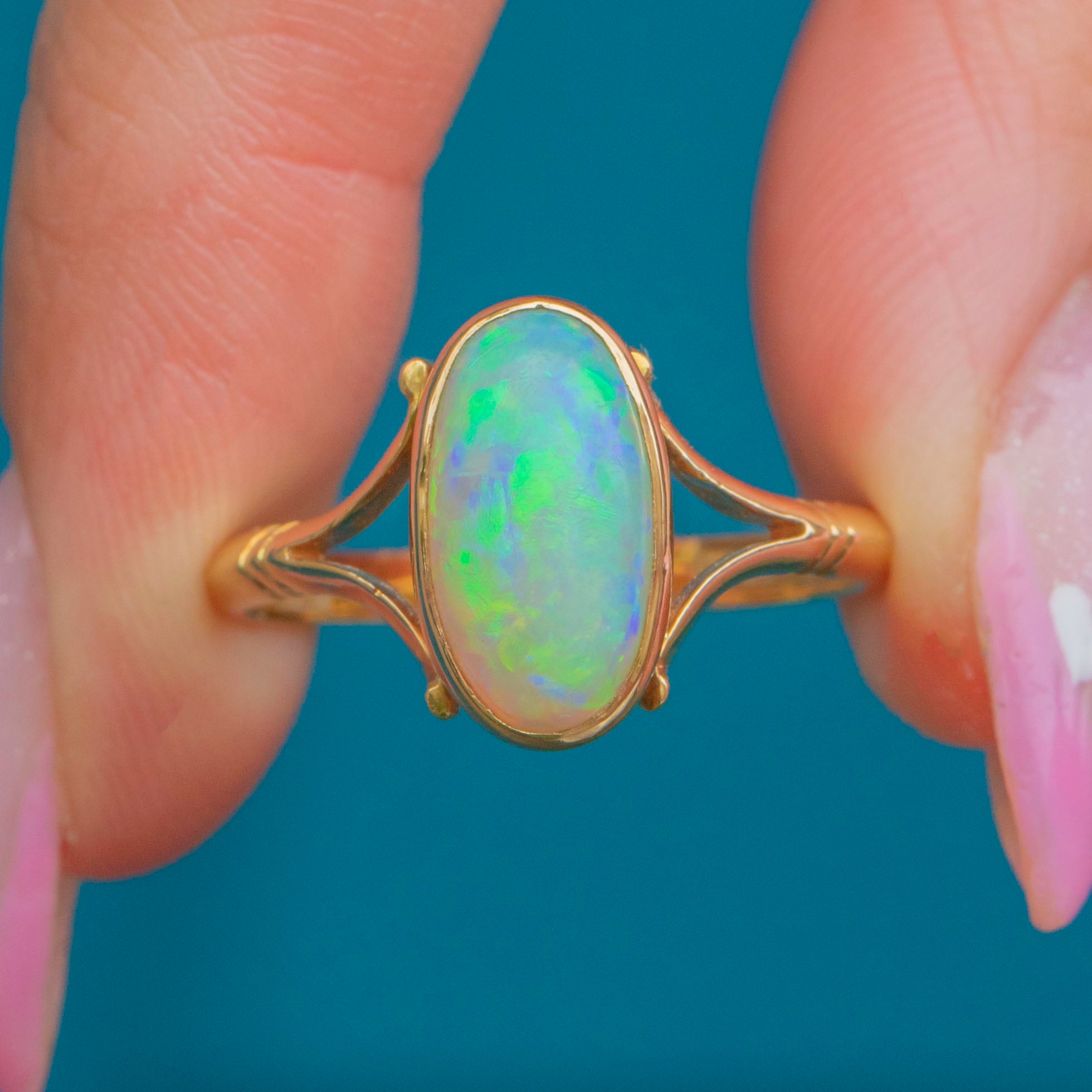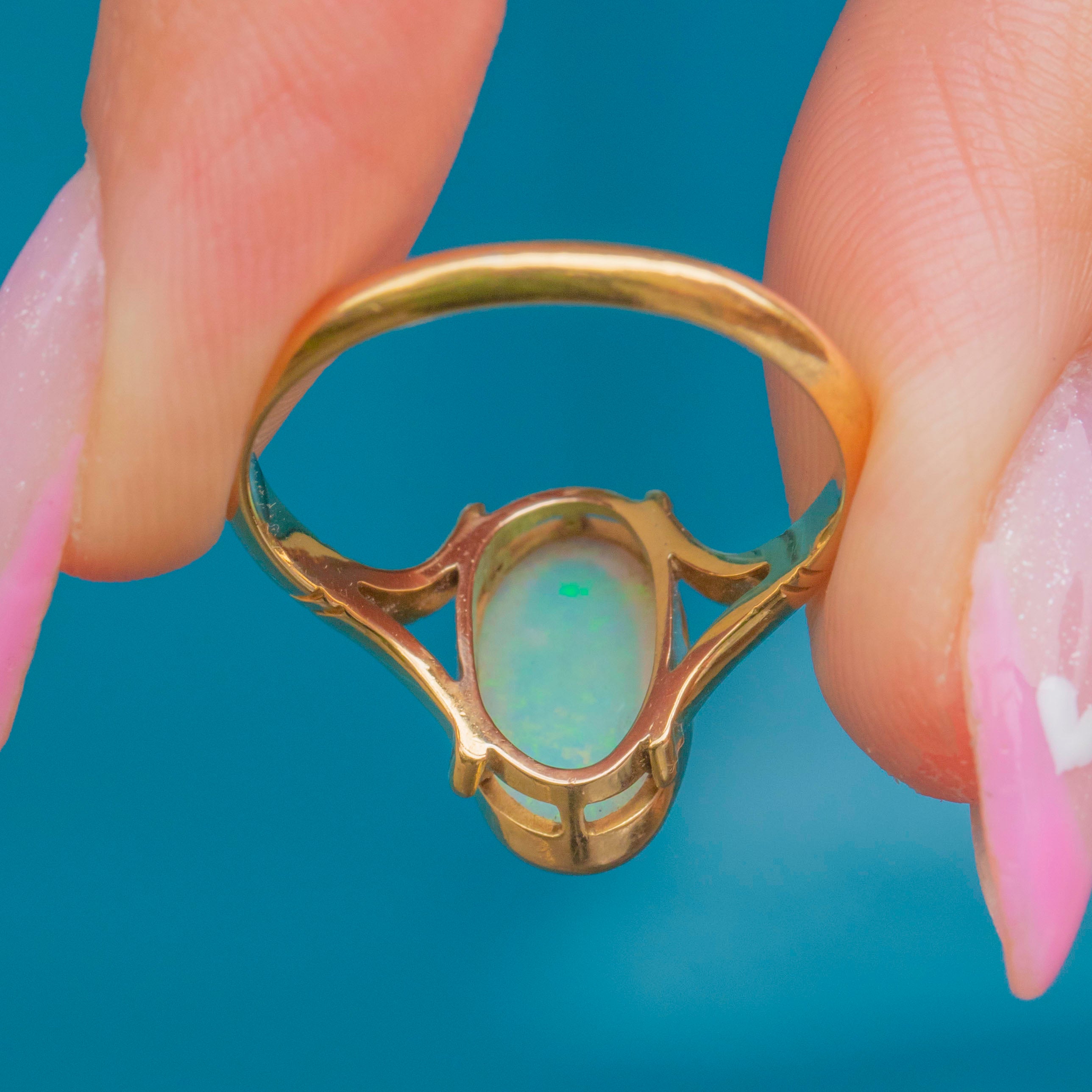 EXCELLENT: The Opal is bright and stable with lively colourplay. The Gold setting is smooth, glossy and well preserved with crisp stamps and a secure split-shoulder design.
