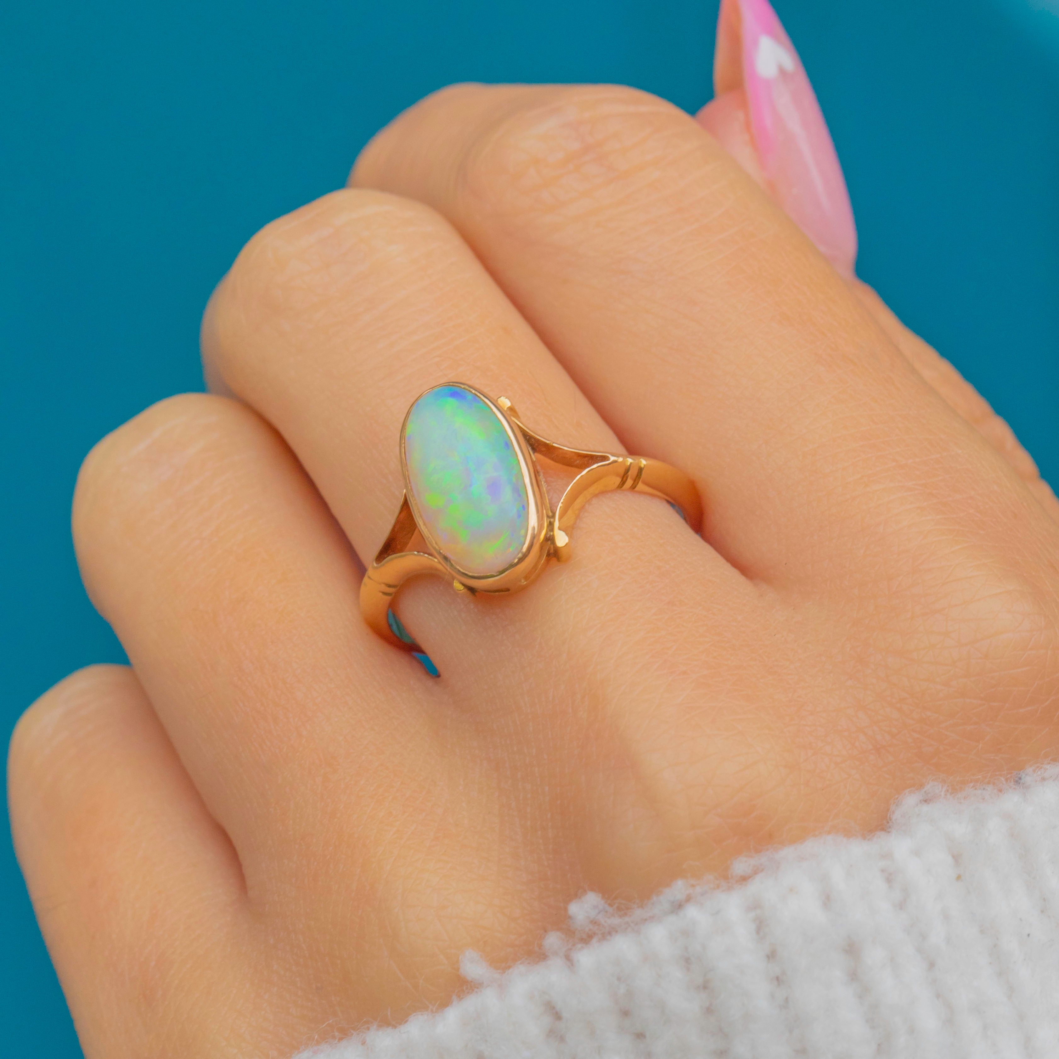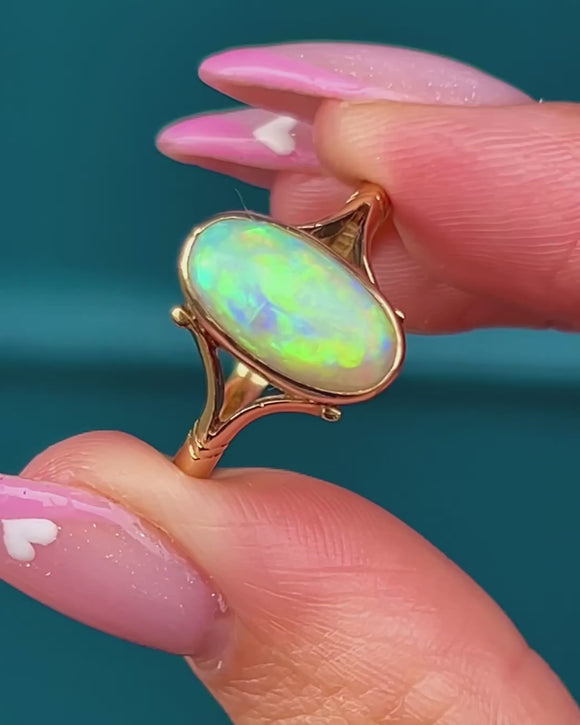 An elegant Mid-Century 18ct Gold Opal solitaire ring featuring a luminous cabochon-cut Opal framed by sweeping split shoulders.