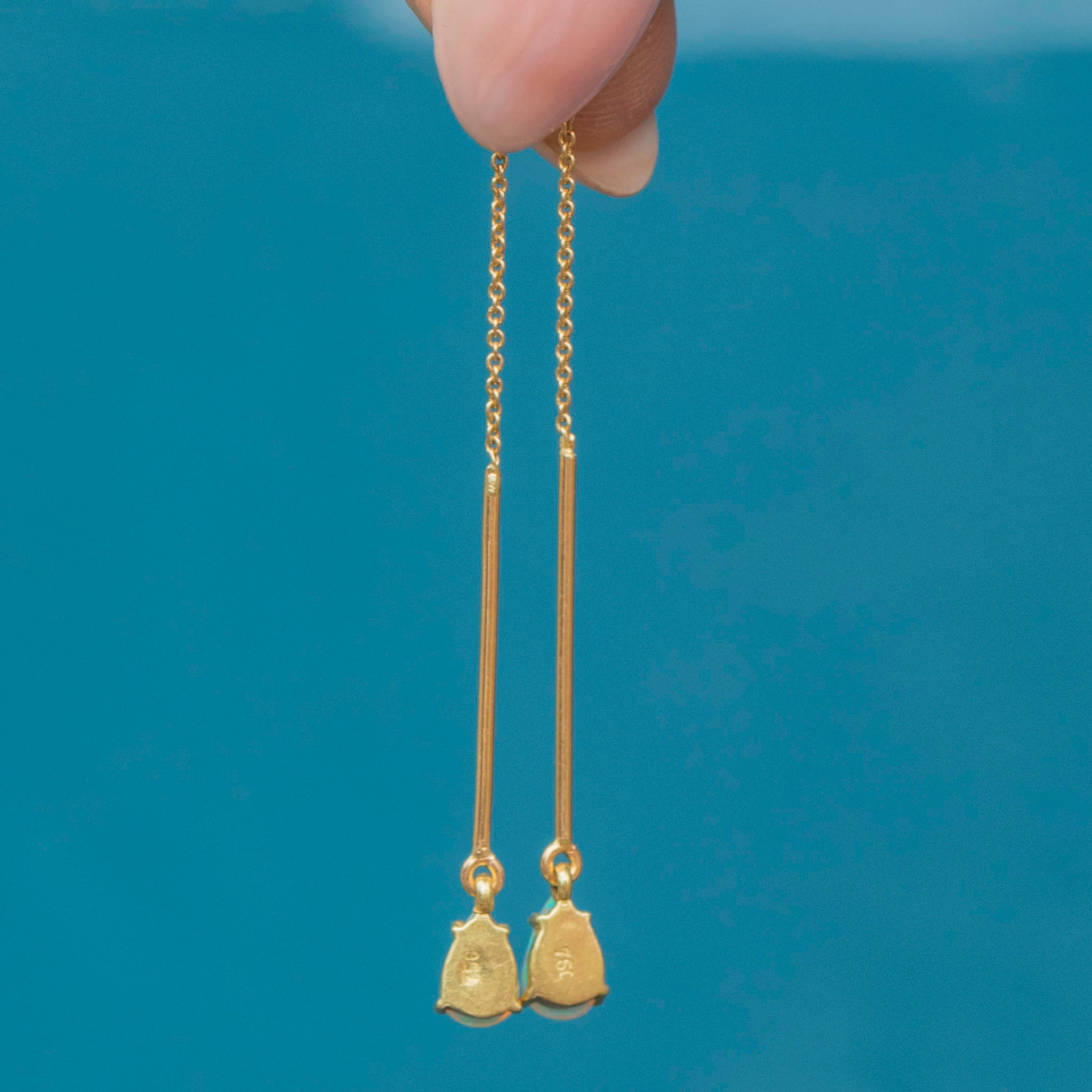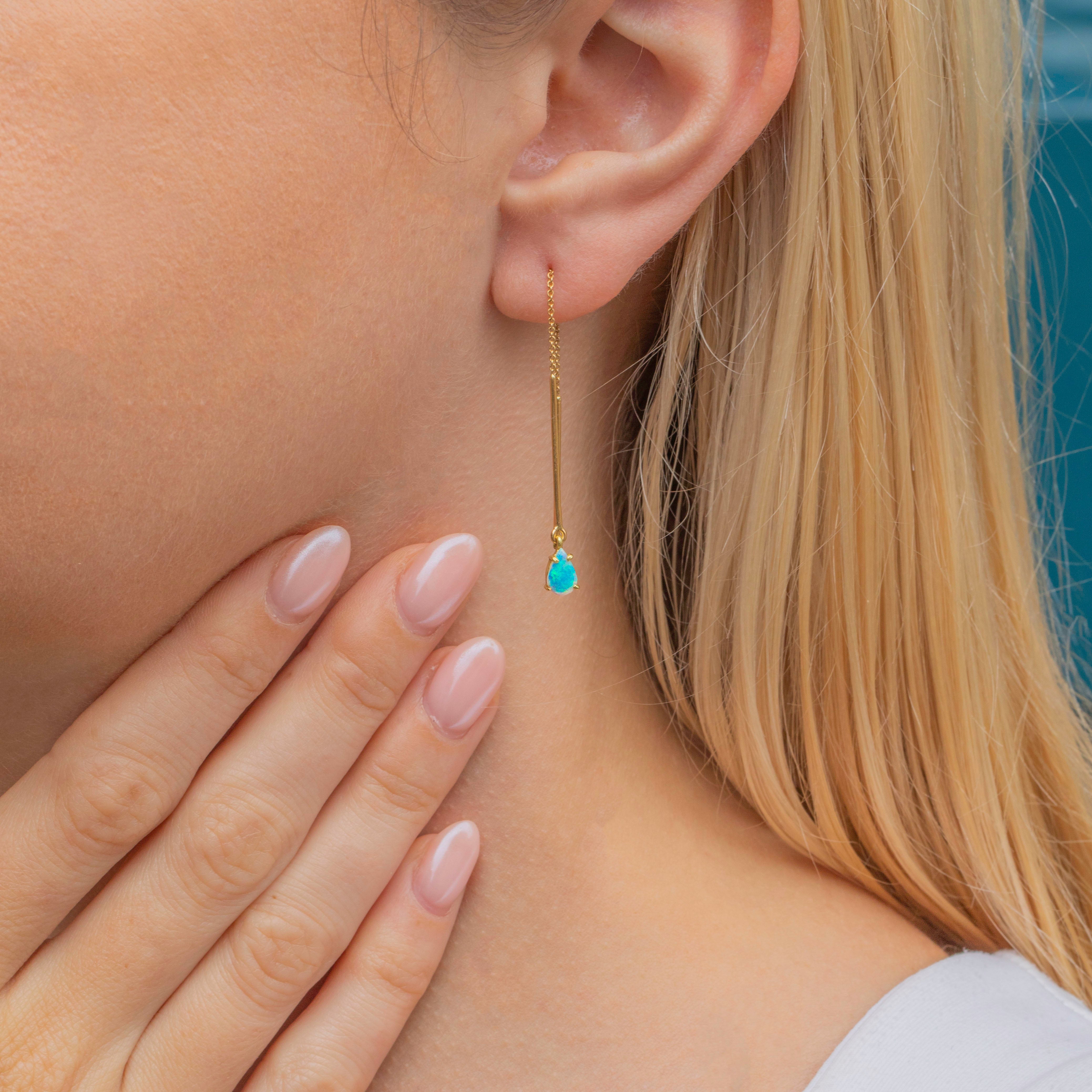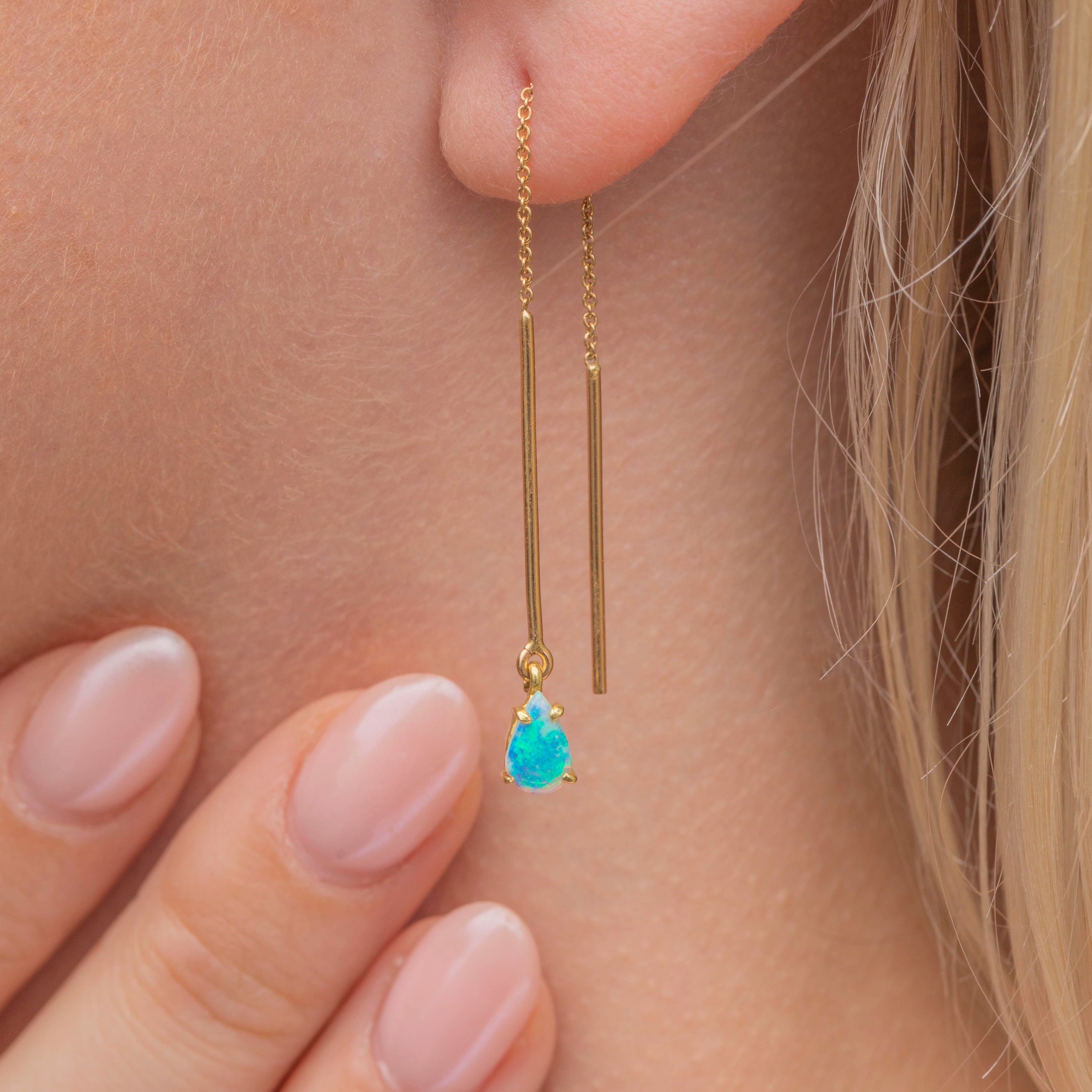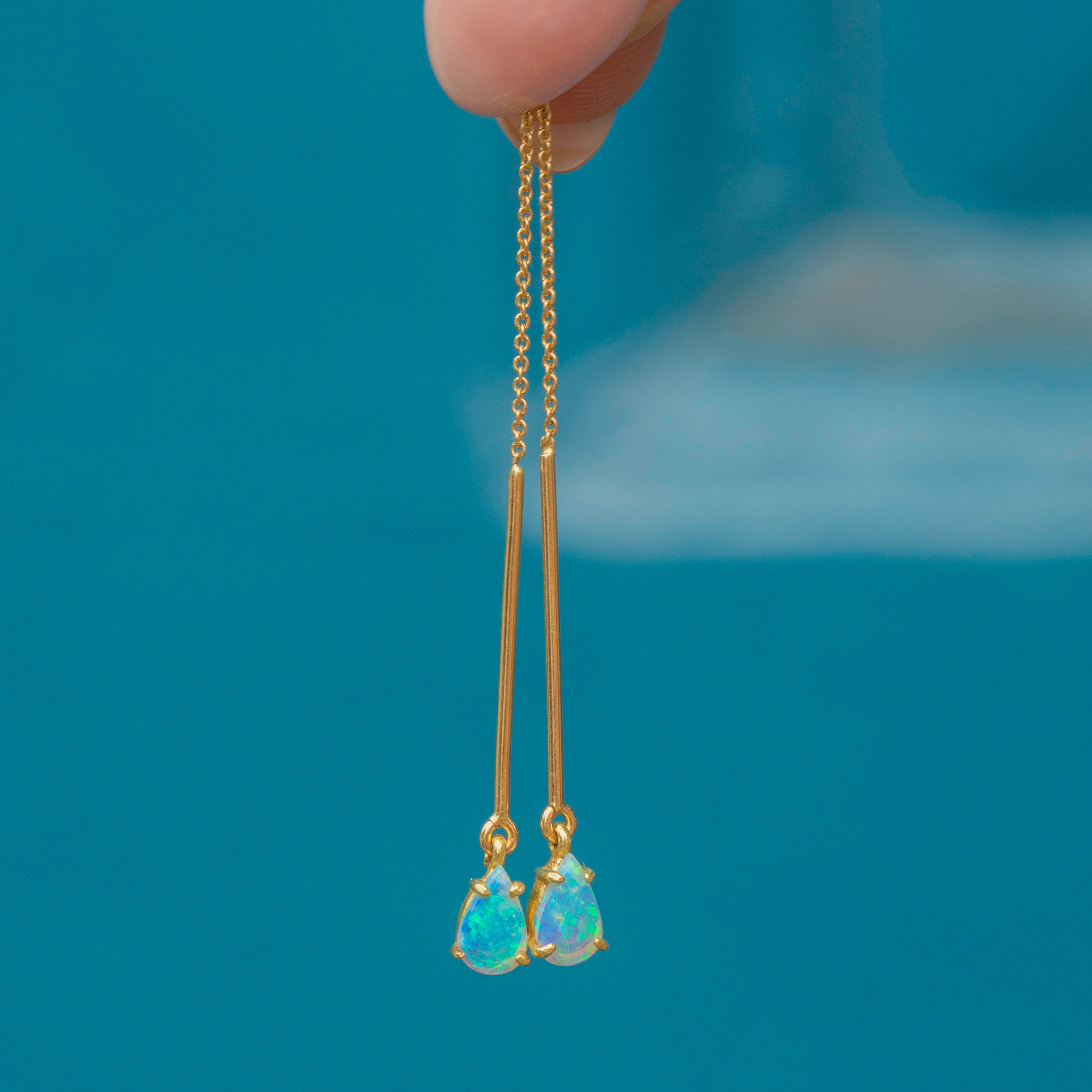 EXCELLENT. These 18ct Gold Opal threader earrings are in excellent condition! The Opals sit securely within their settings, smooth to the touch and bringing that play of colour we all yearn for. Each component is securely connected and allows for easy threading through the ear. The lightweight design of these Opal earrings allows for comfortable wear, taking you from day to night with ease!