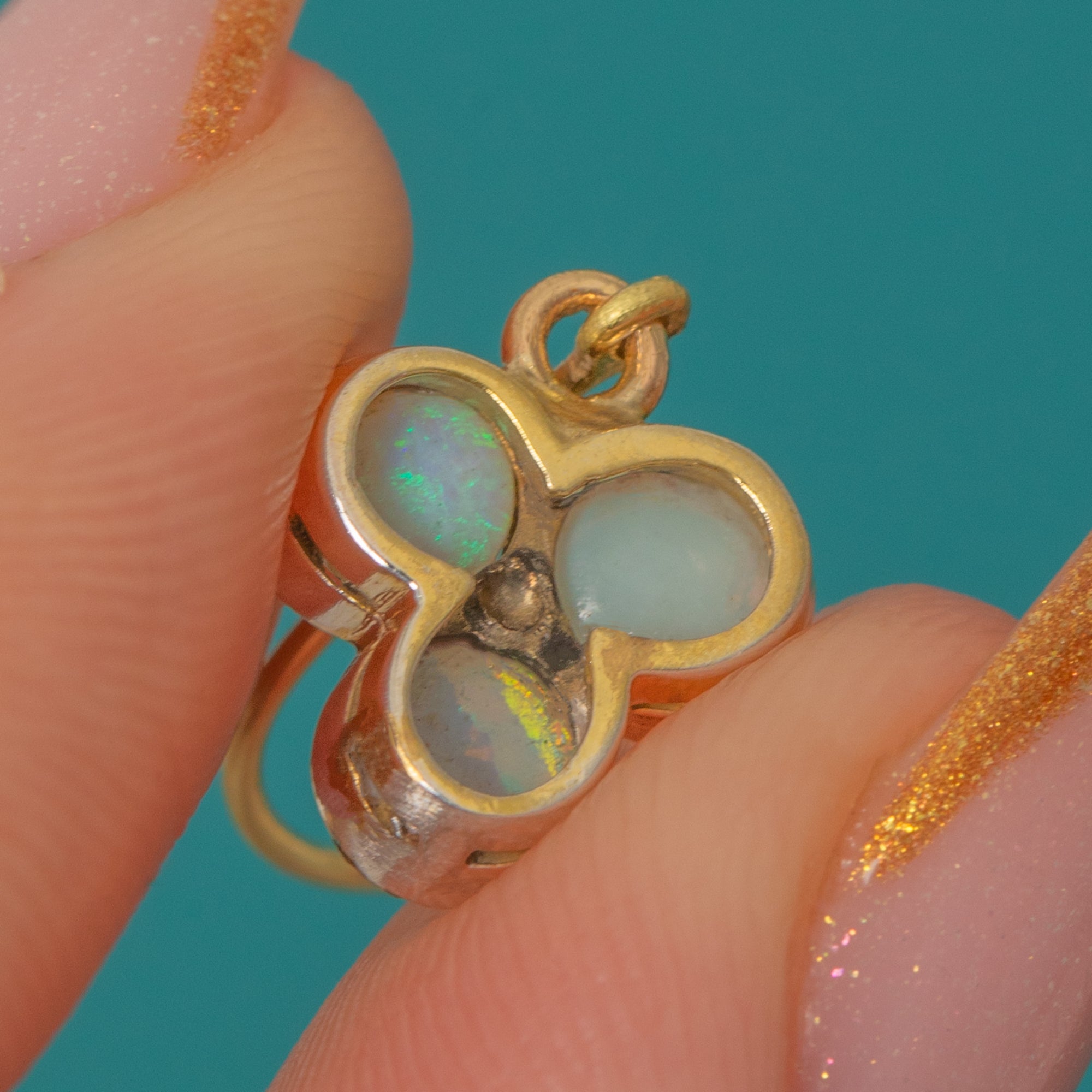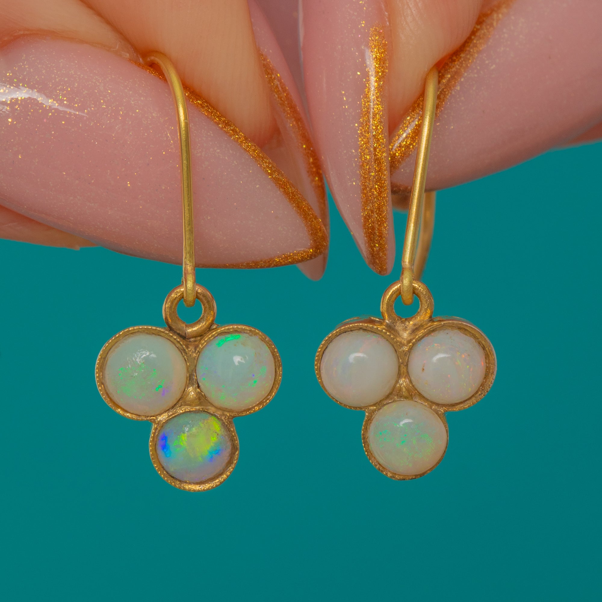 These beautiful Victorian 18ct Gold earrings showcase three natural Opals in a charming trefoil cluster design. Each Opal glows with a kaleidoscope of pastel blues, greens and pinks, creating a soft yet radiant look.