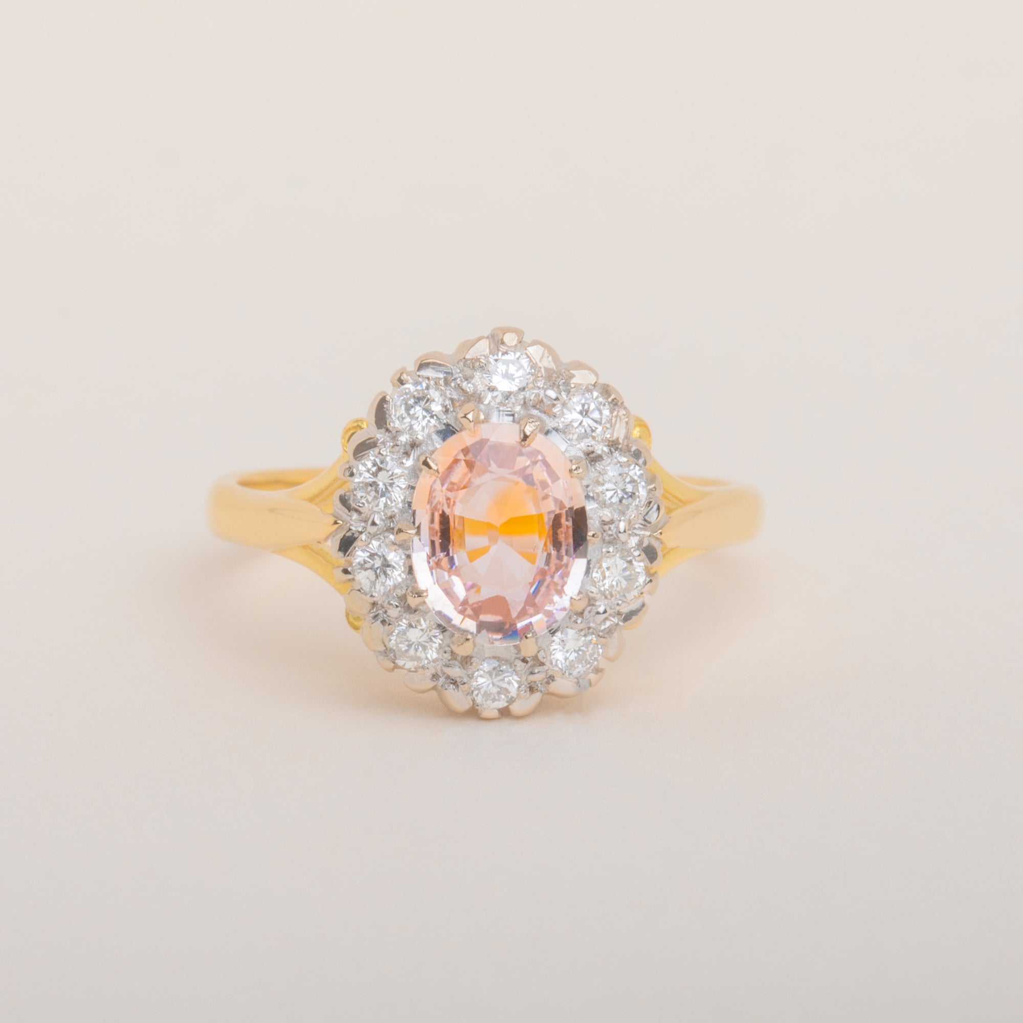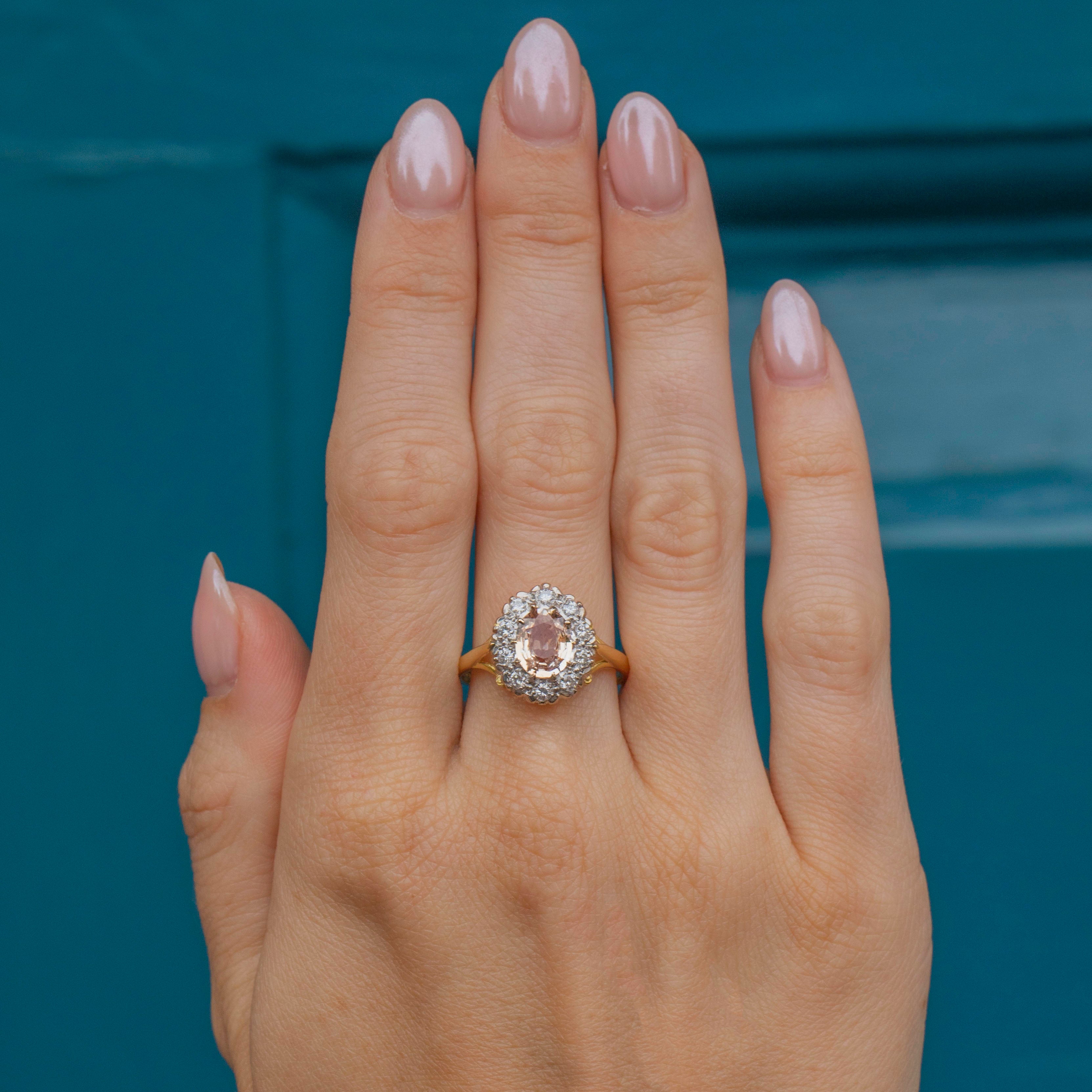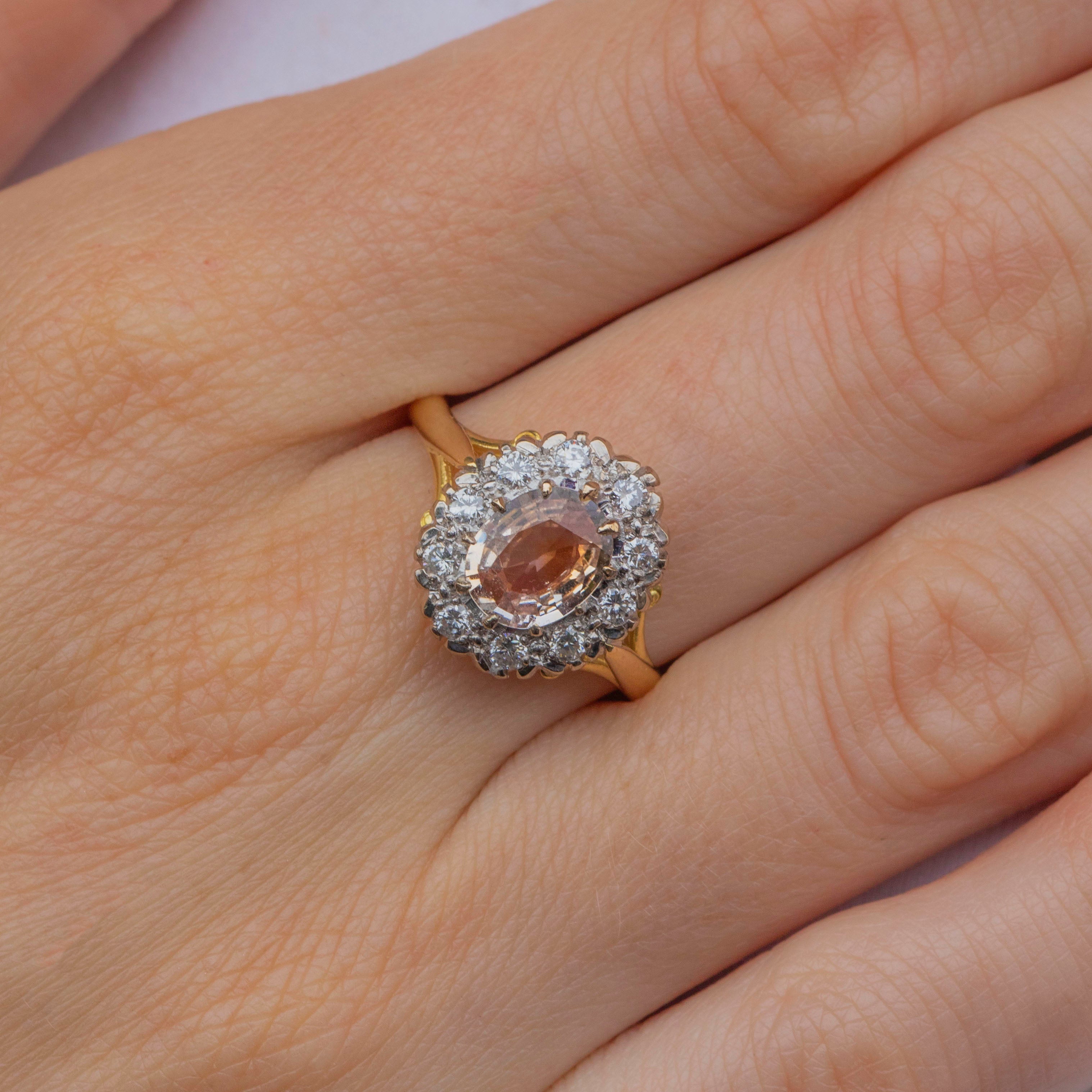 EXCELLENT. This 18ct Gold Padparadscha Sapphire Diamond cluster ring is in excellent condition! The Sapphire is free from any scratches and the Diamonds have a brilliant crisp white hue! Fully hallmarked for the date c.1988 this ring is ready to be a girls best friend!
