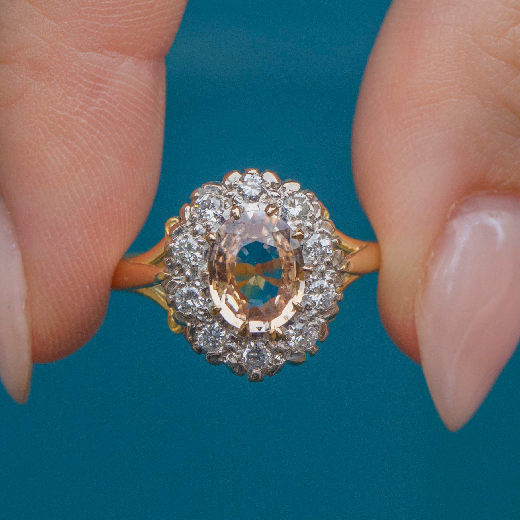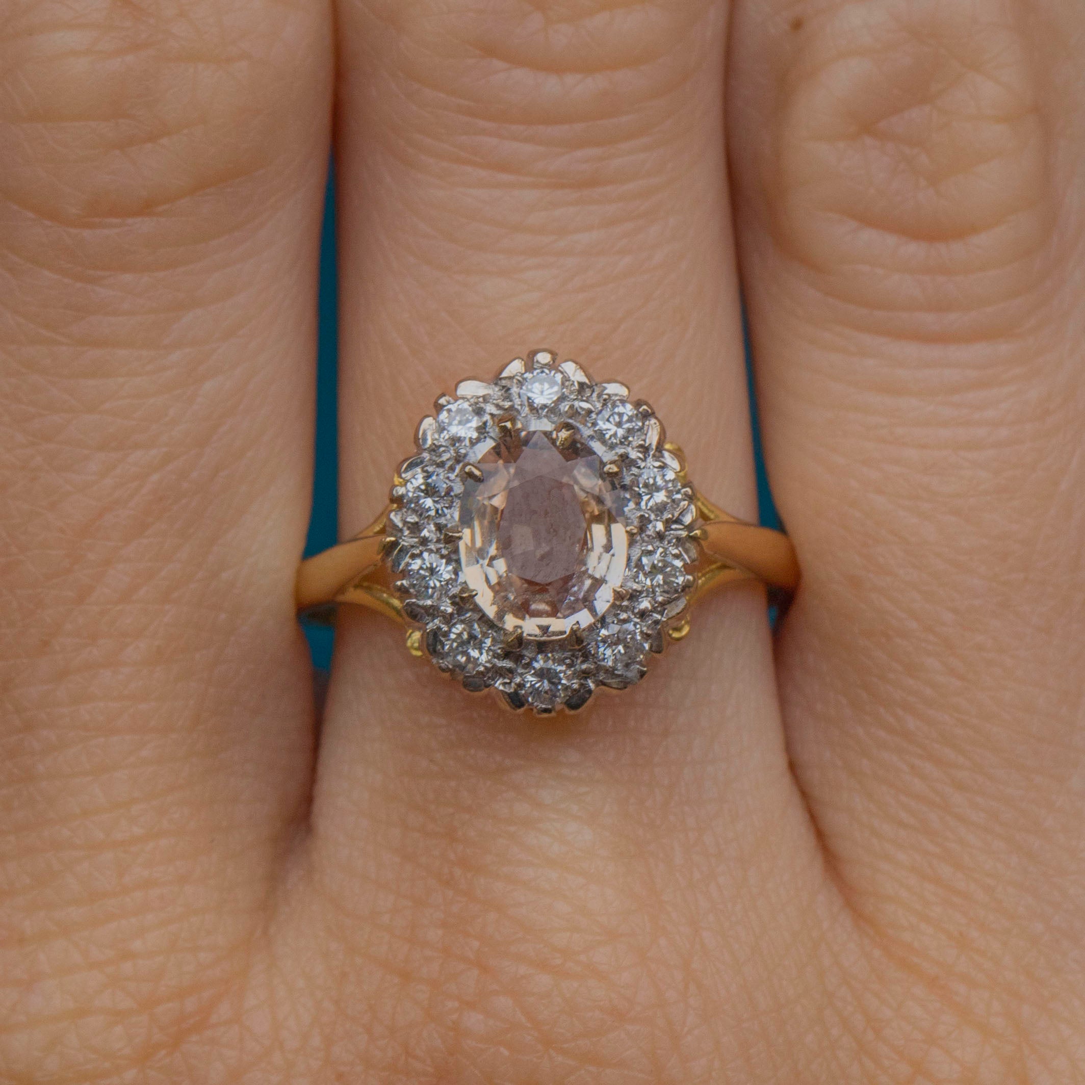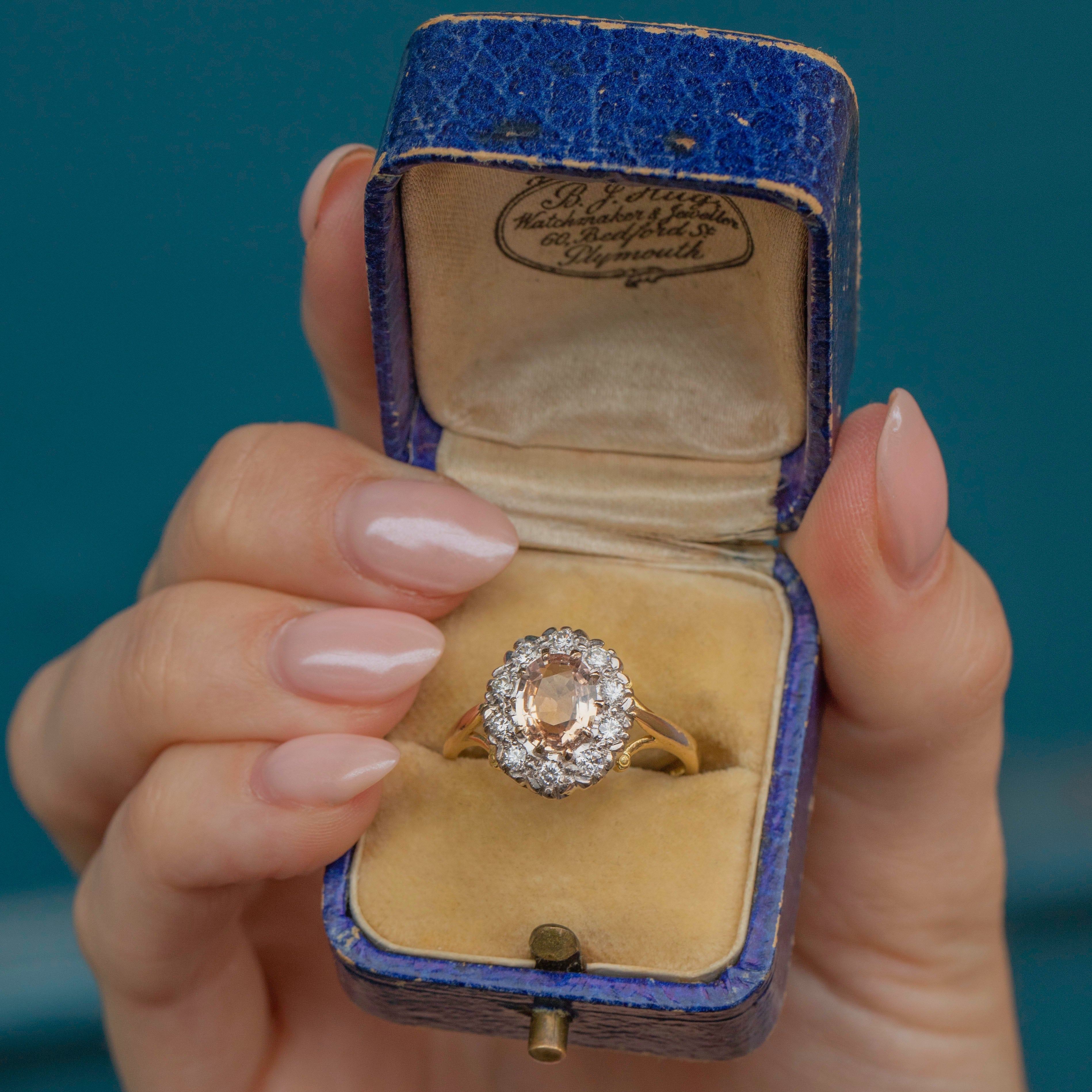 EXCELLENT. This 18ct Gold Padparadscha Sapphire Diamond cluster ring is in excellent condition! The Sapphire is free from any scratches and the Diamonds have a brilliant crisp white hue! Fully hallmarked for the date c.1988 this ring is ready to be a girls best friend!
