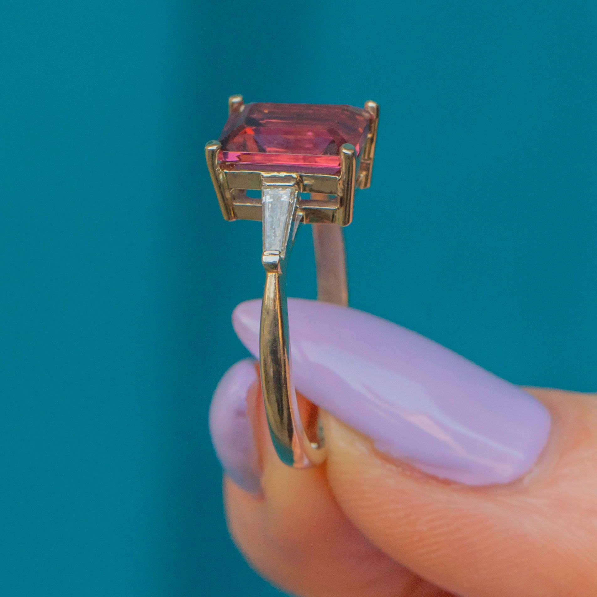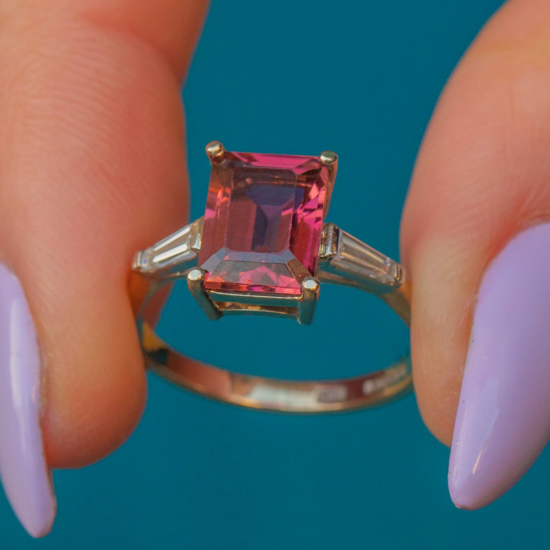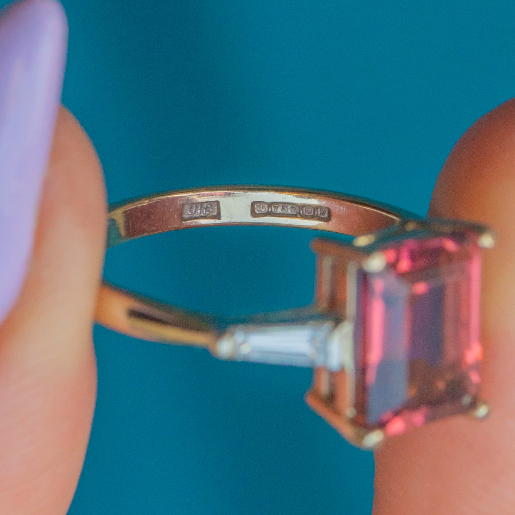 Add a touch of luxury to your collection with this breathtaking 18ct Gold Pink Tourmaline ring! The dusty pink hue of the Tourmaline exudes warmth and sophistication and is flanked by baguette-cut Diamonds, their crisp sparkle providing a dazzling contrast and catching the light in the most gorgeous way.