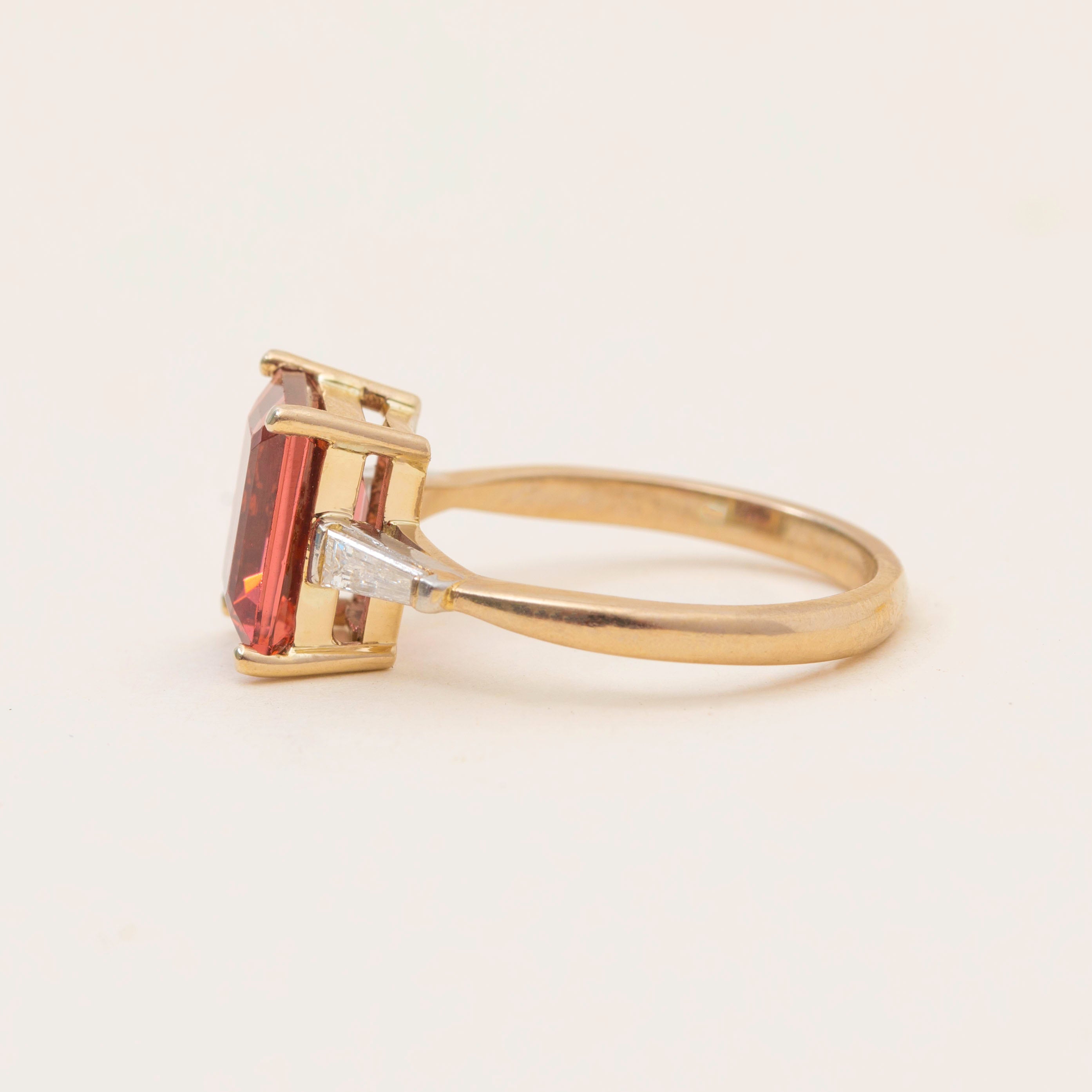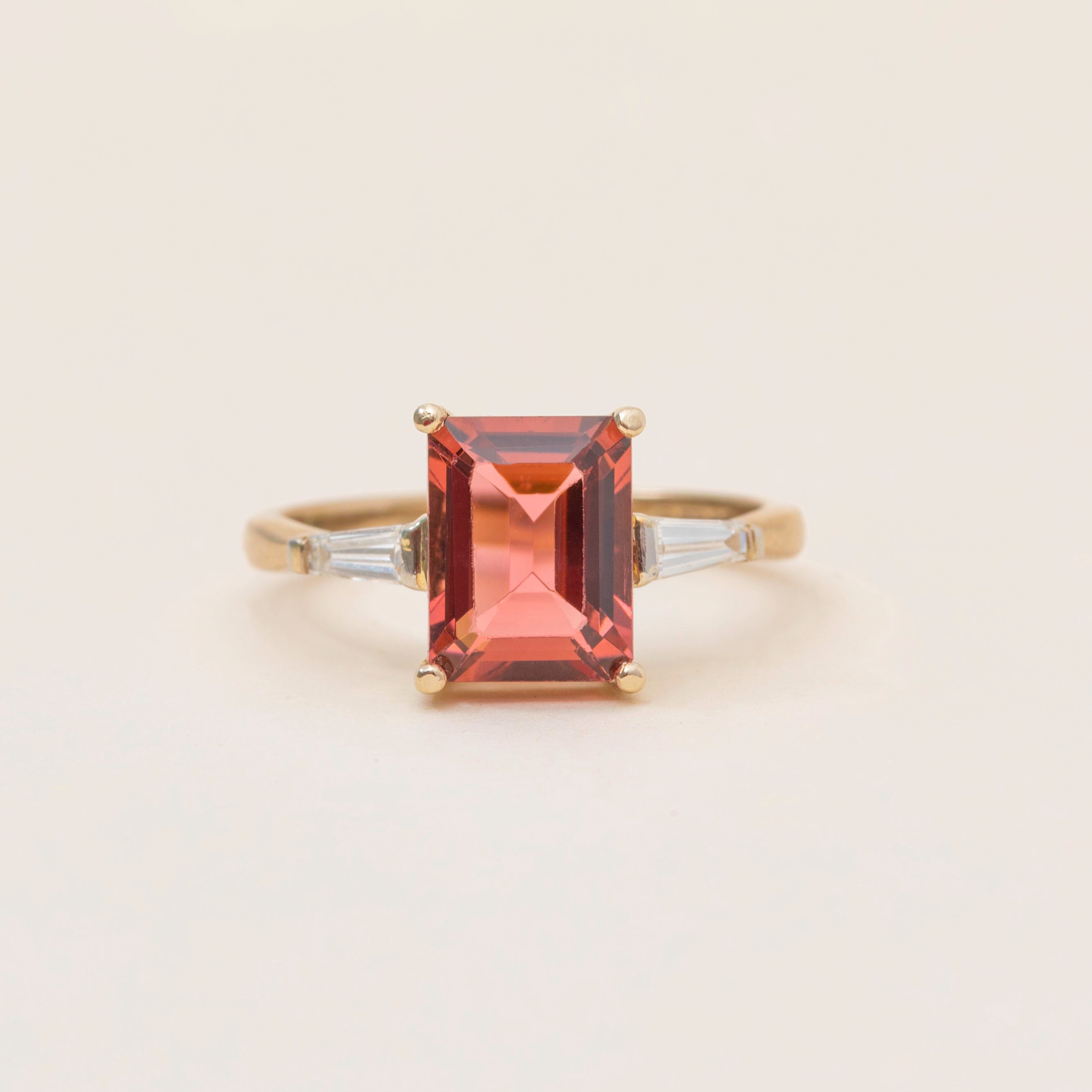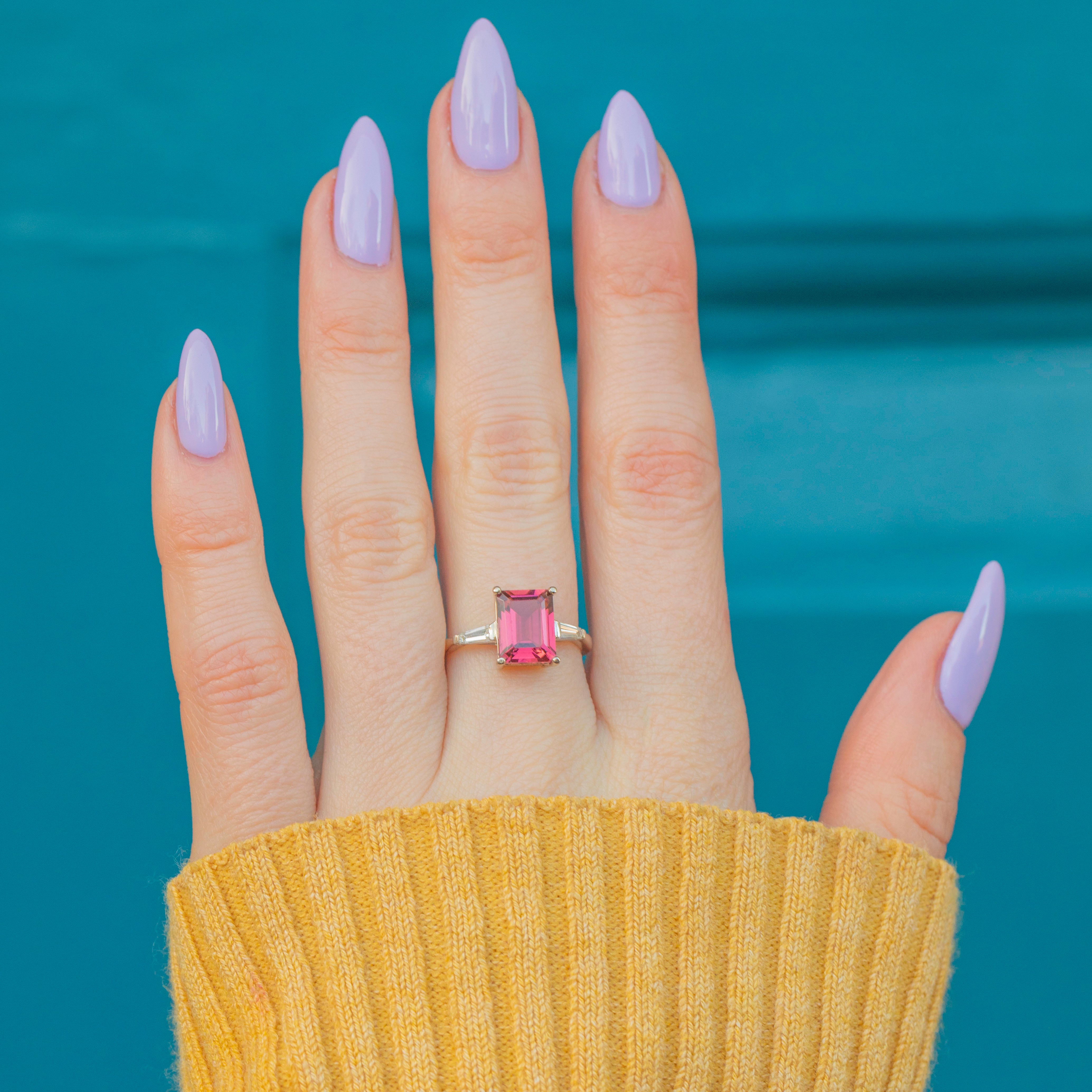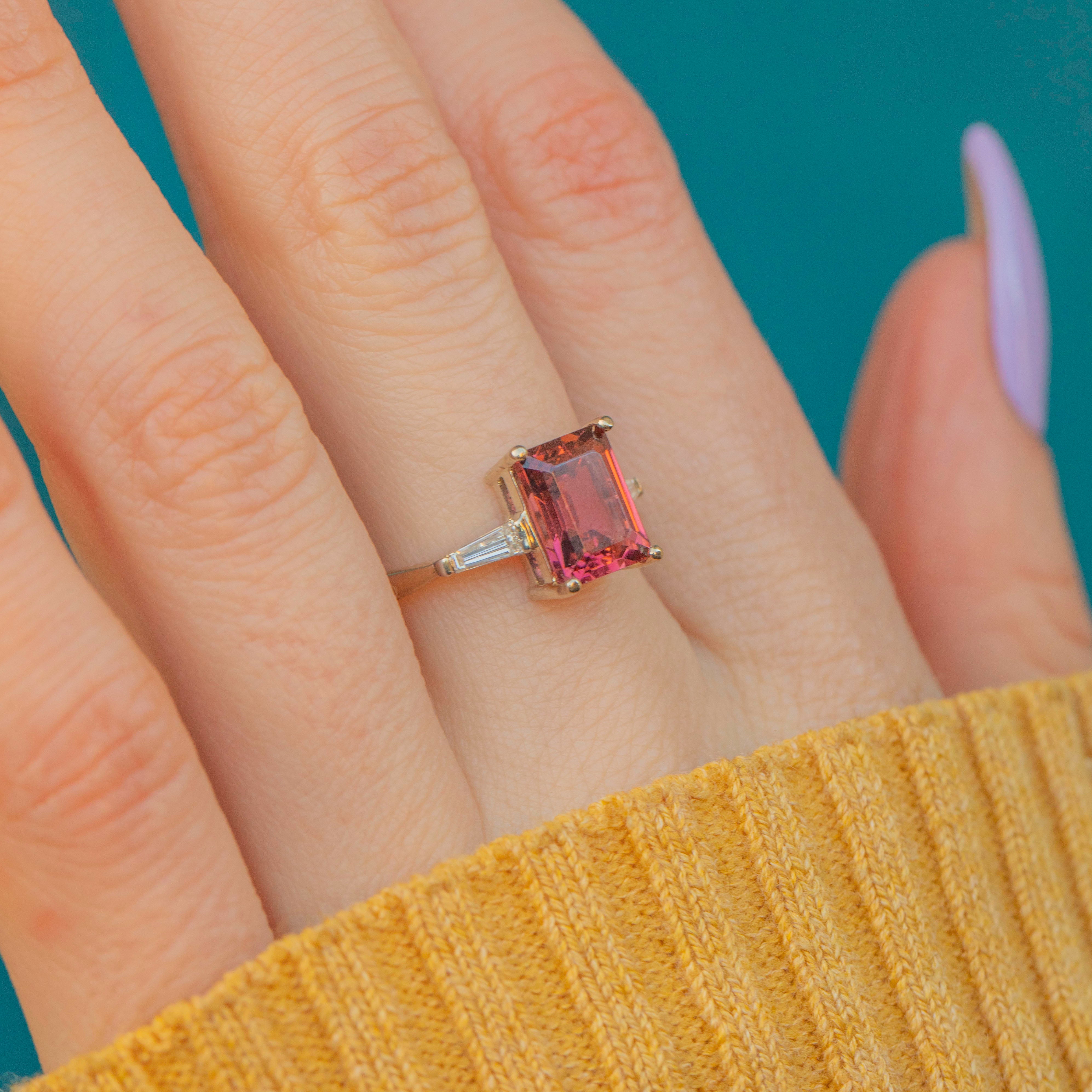 Add a touch of luxury to your collection with this breathtaking 18ct Gold Pink Tourmaline ring! The dusty pink hue of the Tourmaline exudes warmth and sophistication and is flanked by baguette-cut Diamonds, their crisp sparkle providing a dazzling contrast and catching the light in the most gorgeous way.