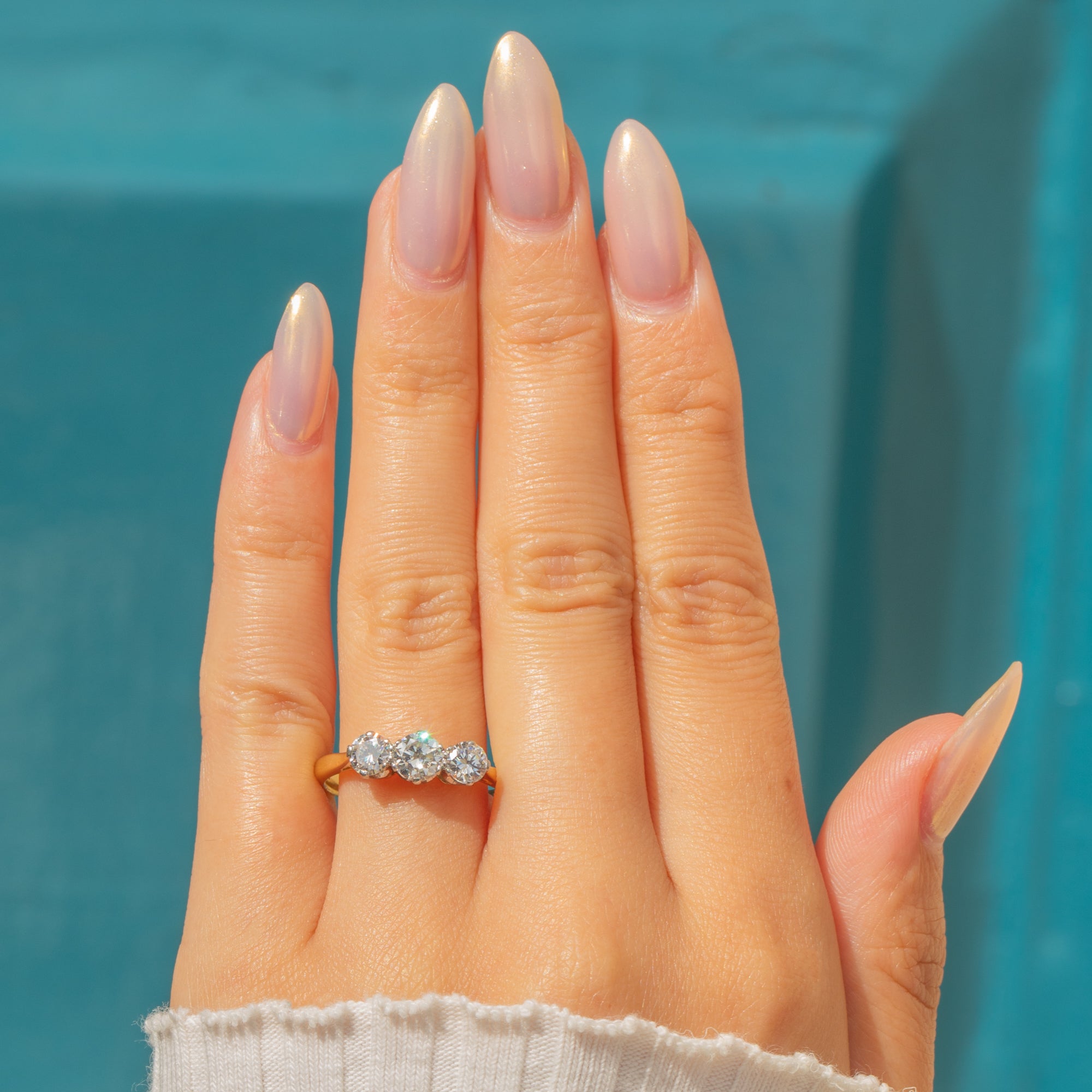 A refined Art Deco Diamond trilogy ring, c.1920s, crafted in 18ct Yellow Gold with Platinum settings. The ring is set with three bright and sparkling round-cut Diamonds. With a total Diamond weight of 0.65ct, the gems are lively and full of brilliance, displaying excellent white colour and clarity.
