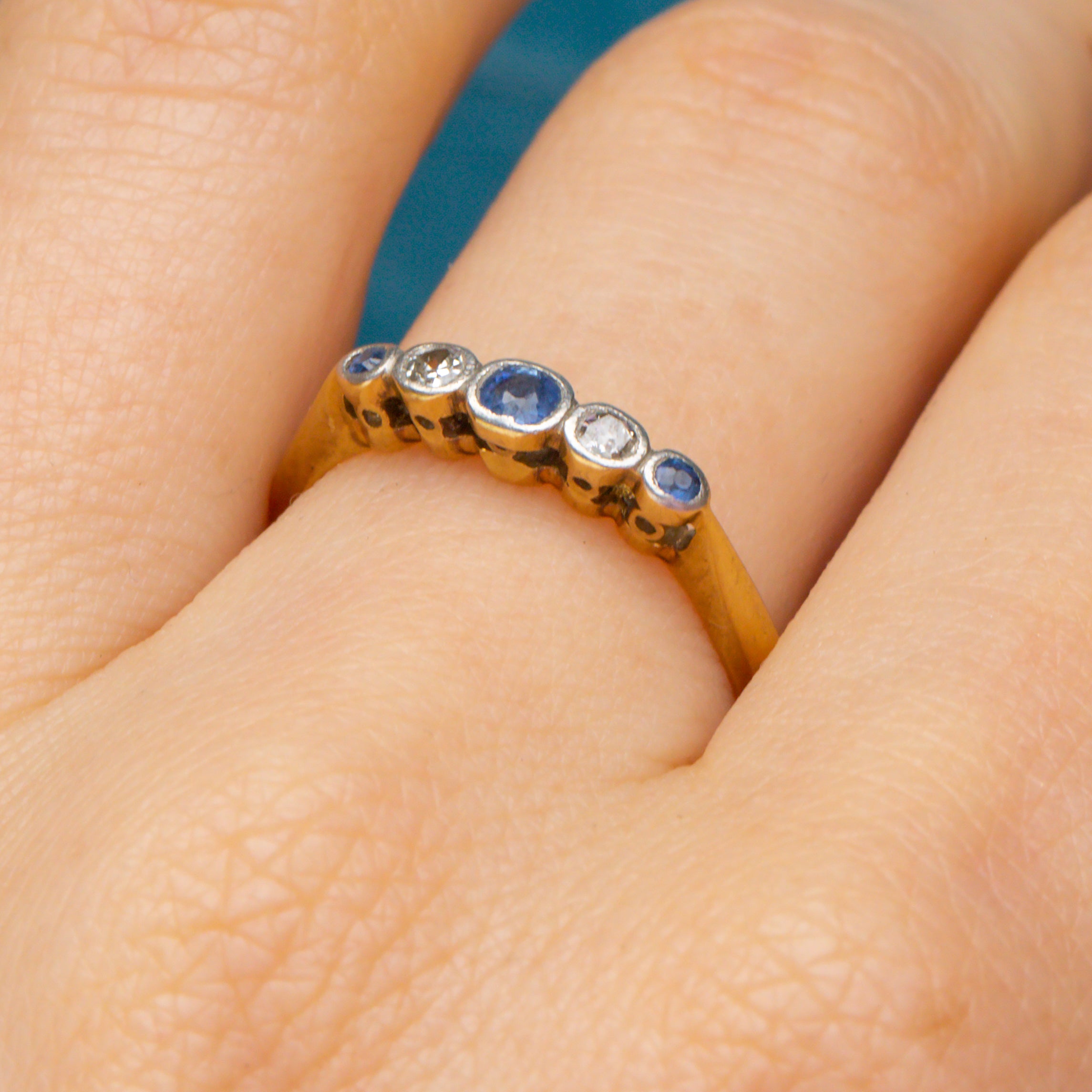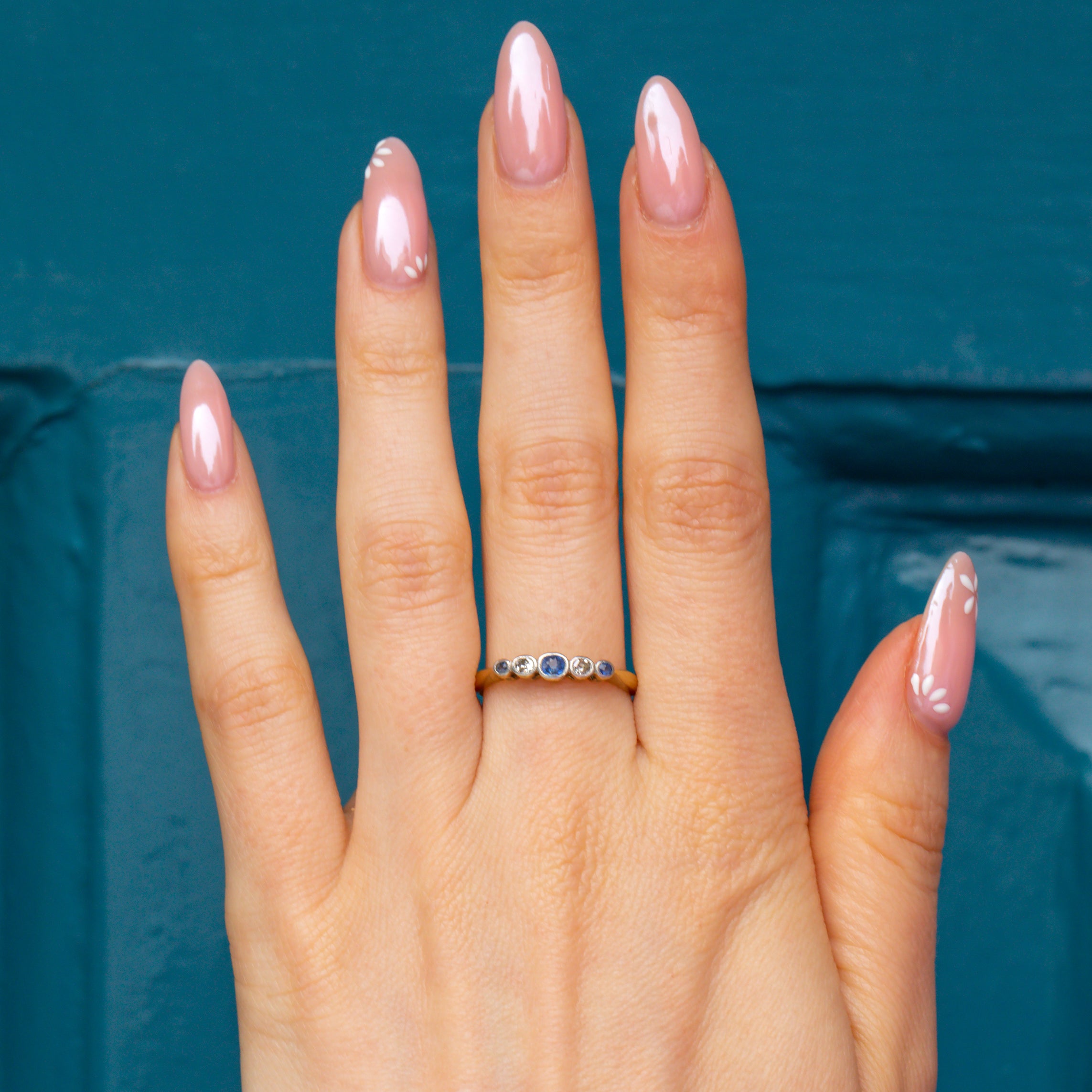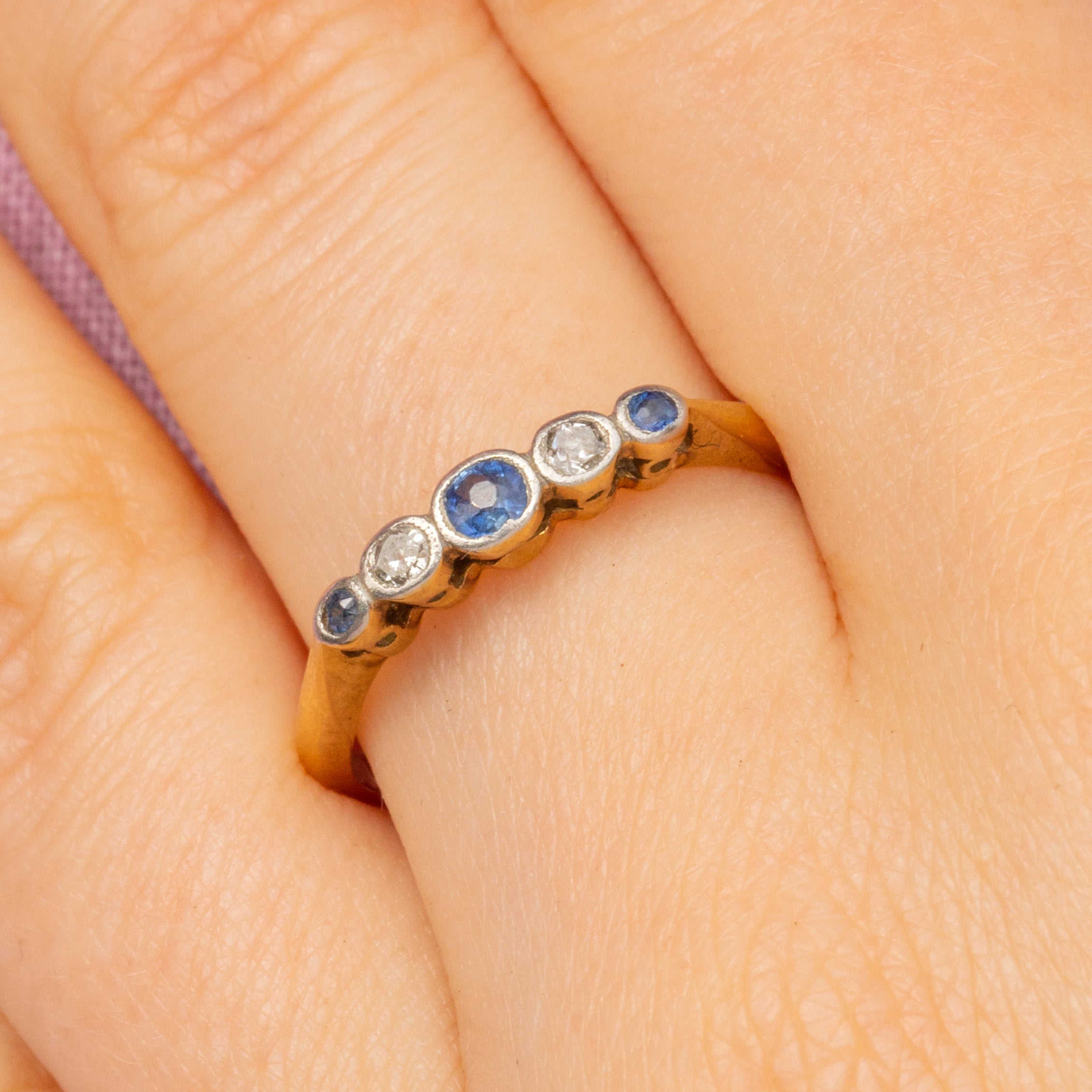 Bague cinq pierres sertie clos en or 18 carats et platine avec saphir et diamant