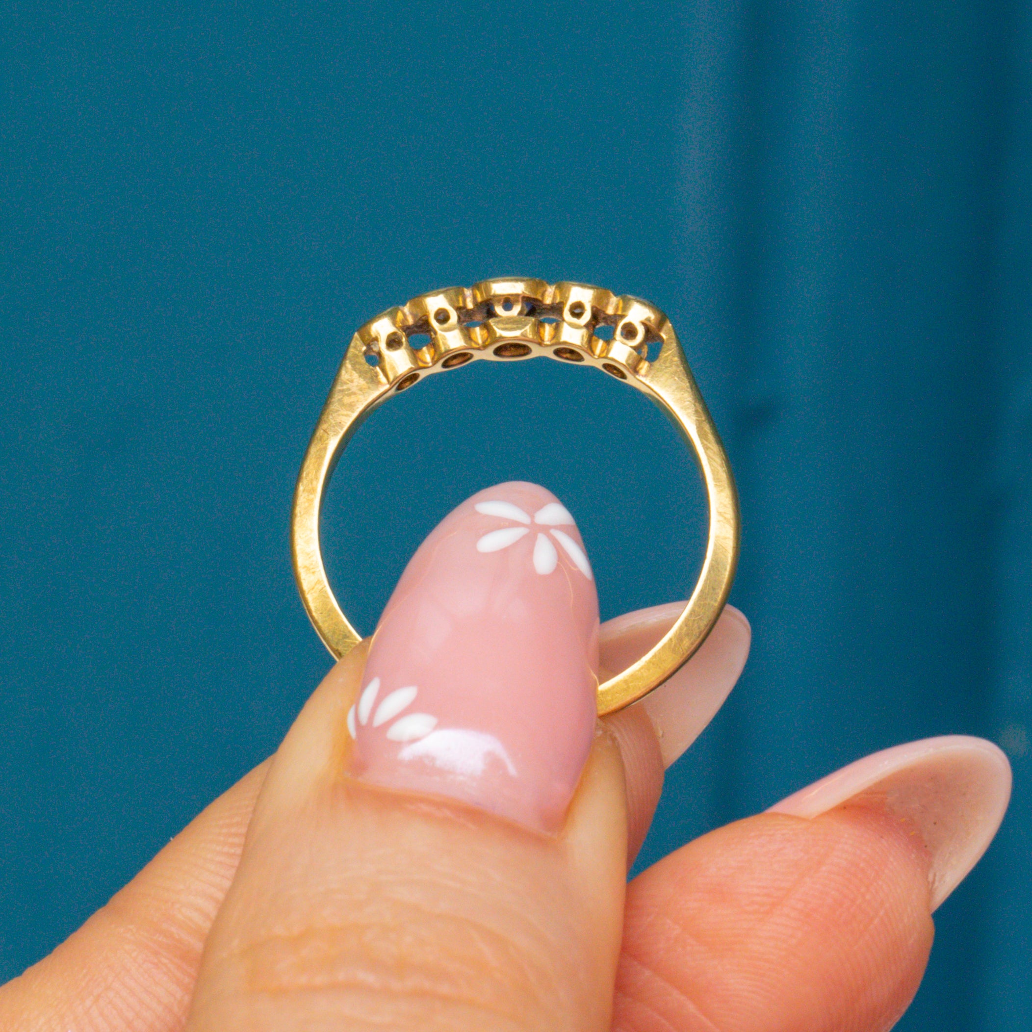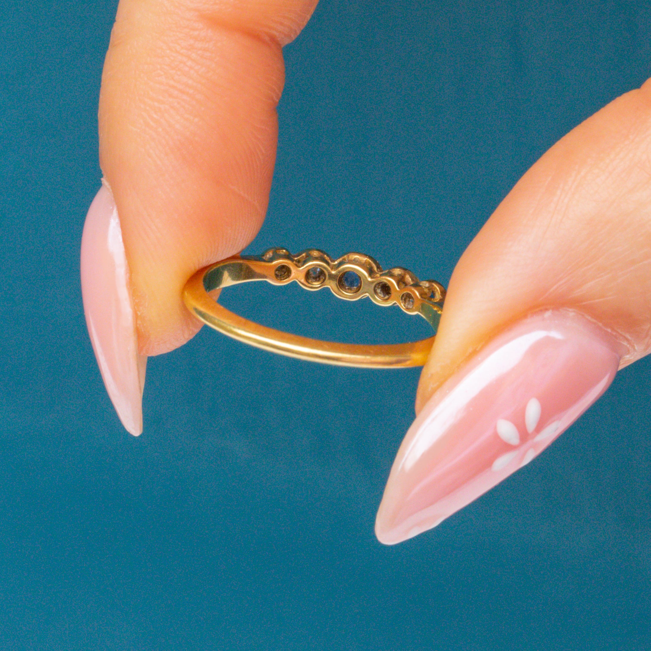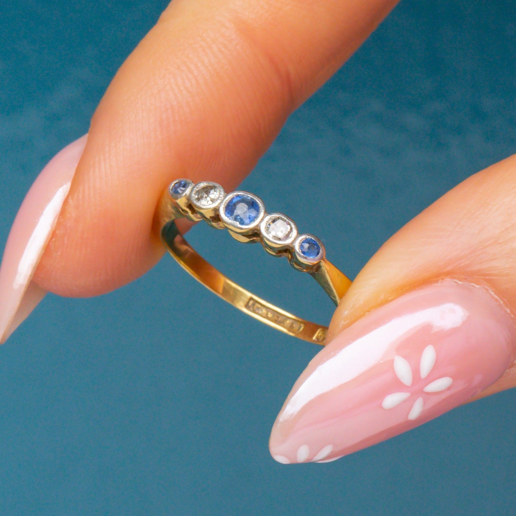 Bague cinq pierres sertie clos en or 18 carats et platine avec saphir et diamant
