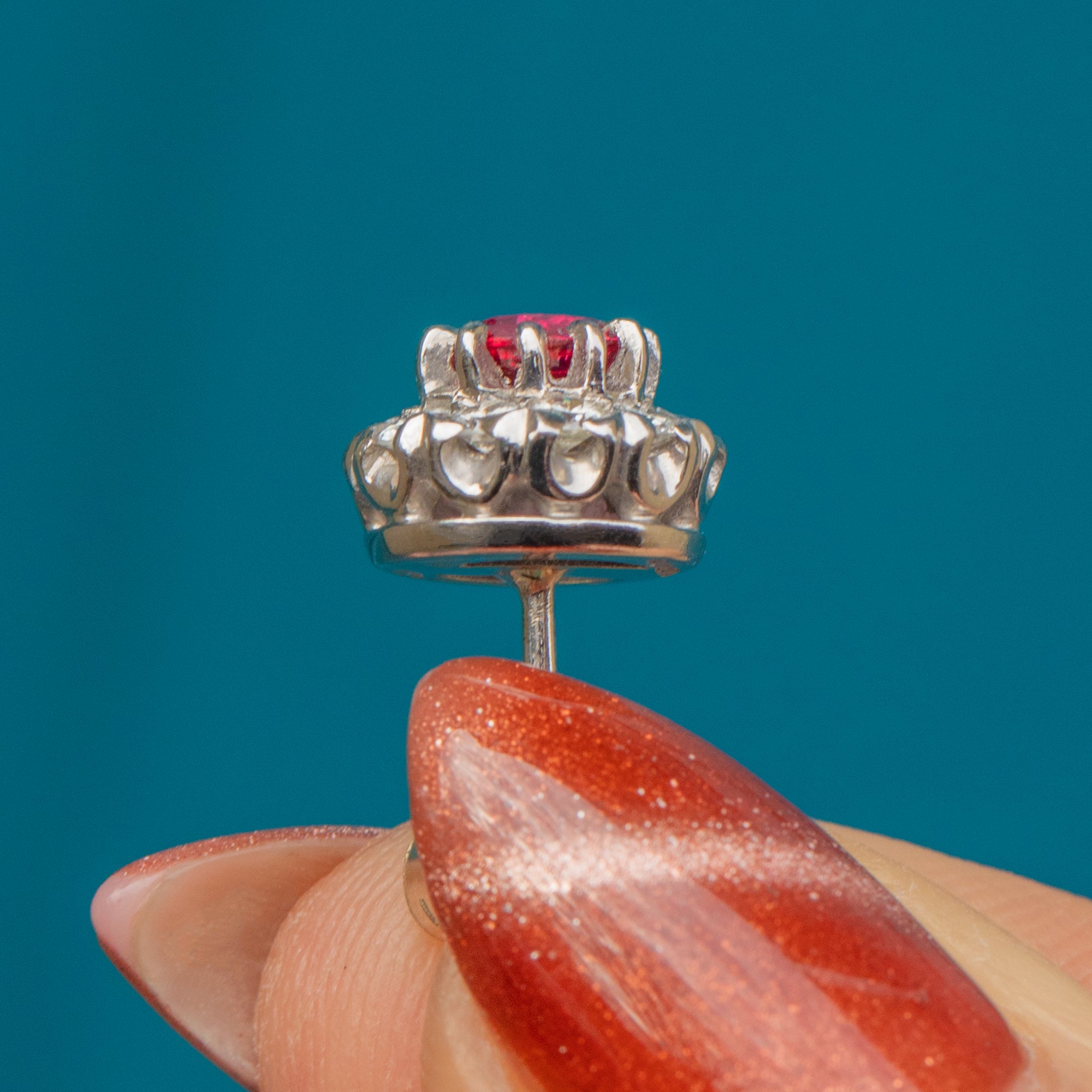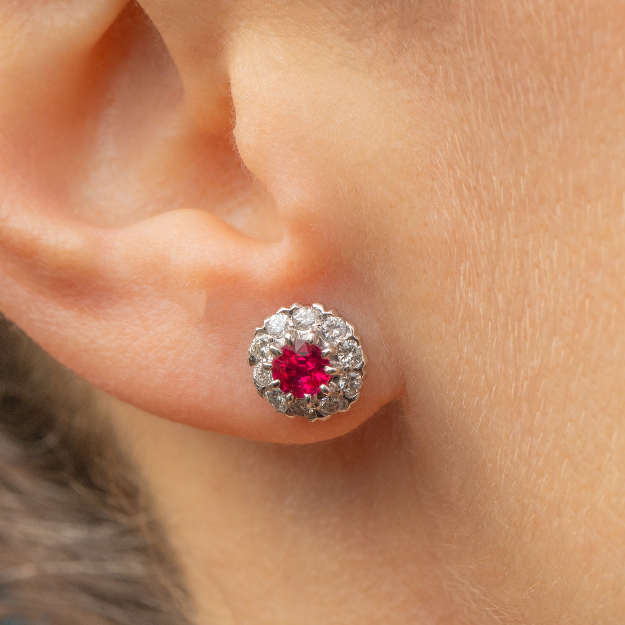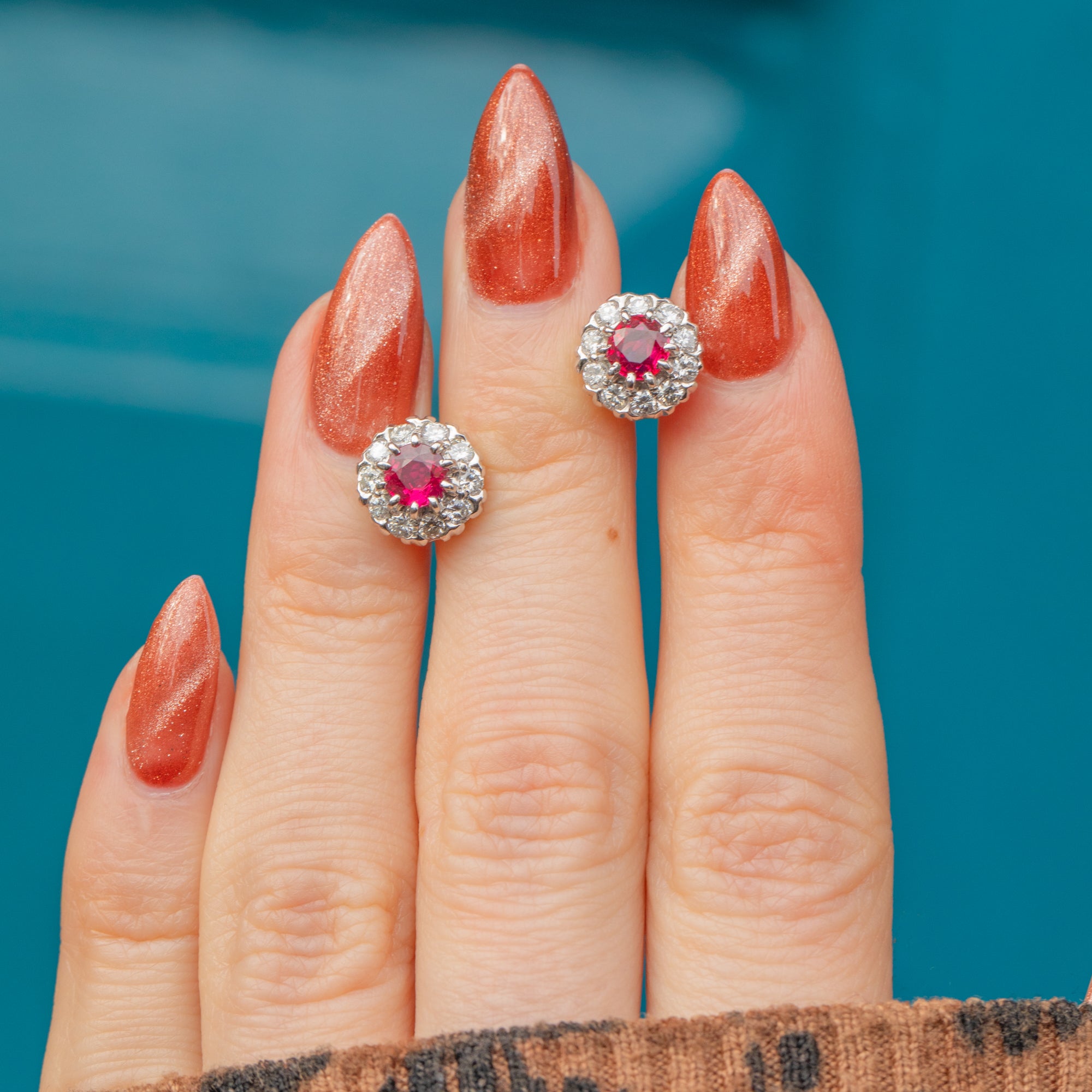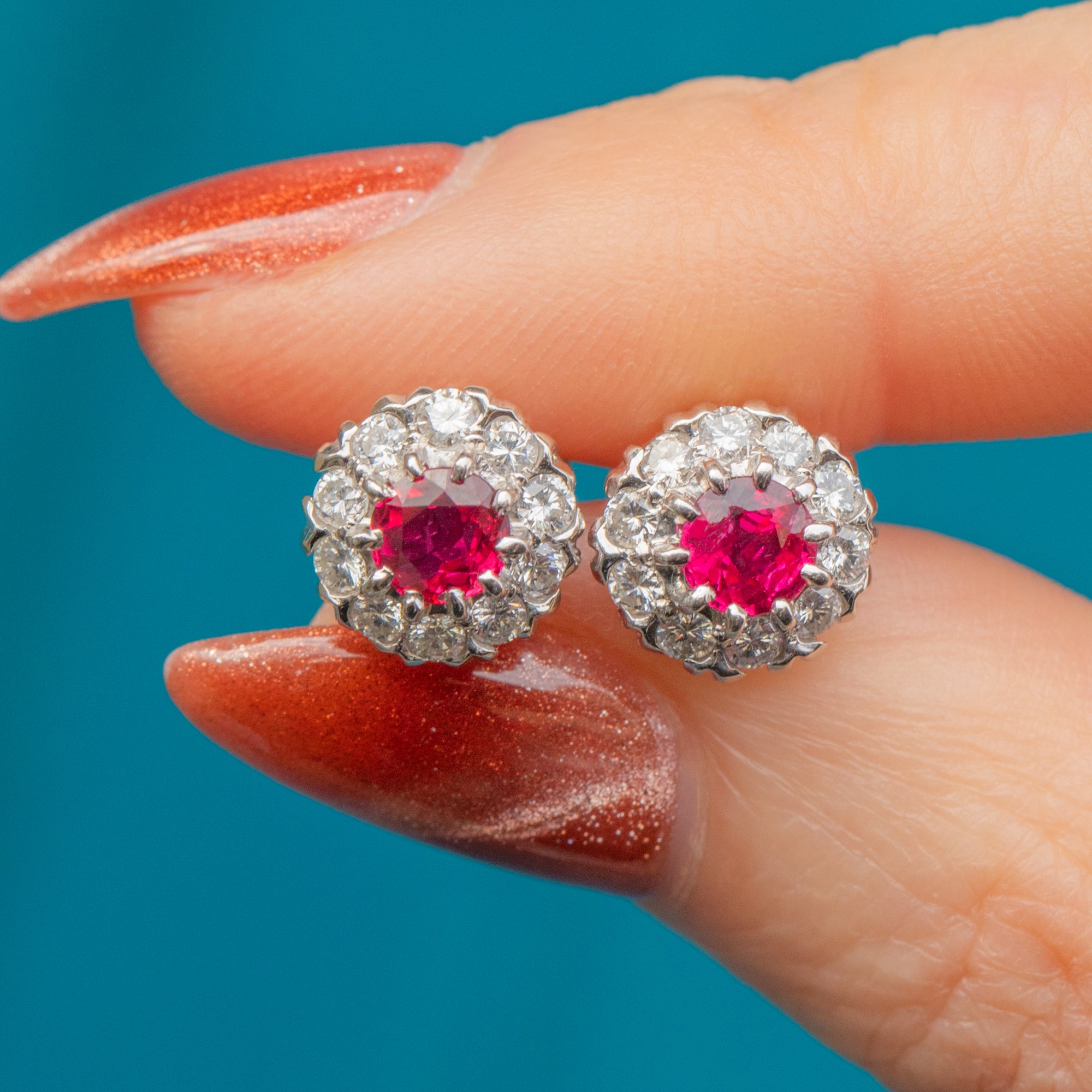 Each vintage stud features a richly saturated Ruby, radiating stunning fuchsia hues. They are haloed by scintillating natural Diamonds and set within lustrous 18ct White Gold settings.