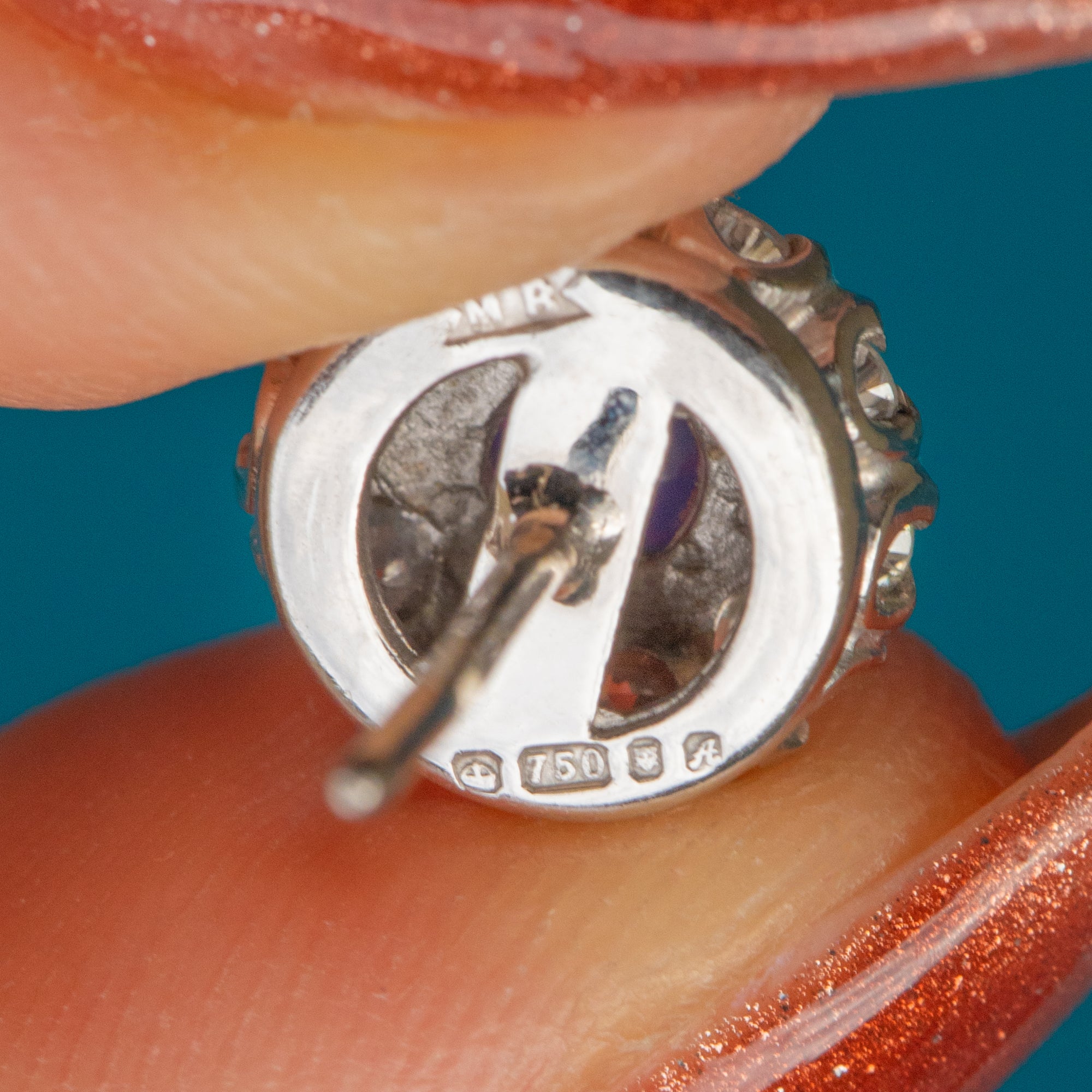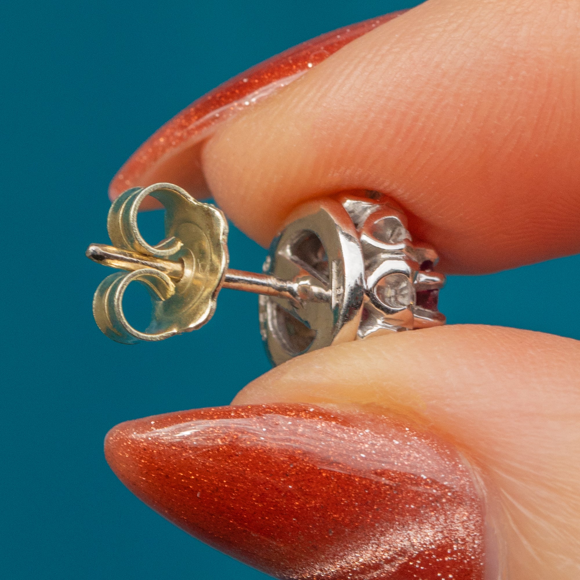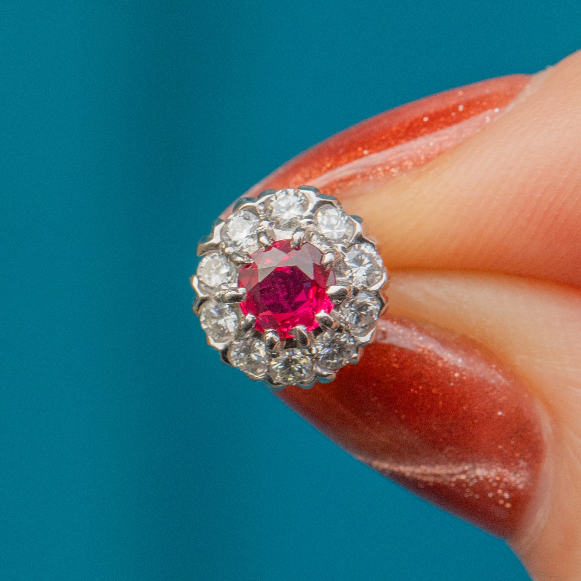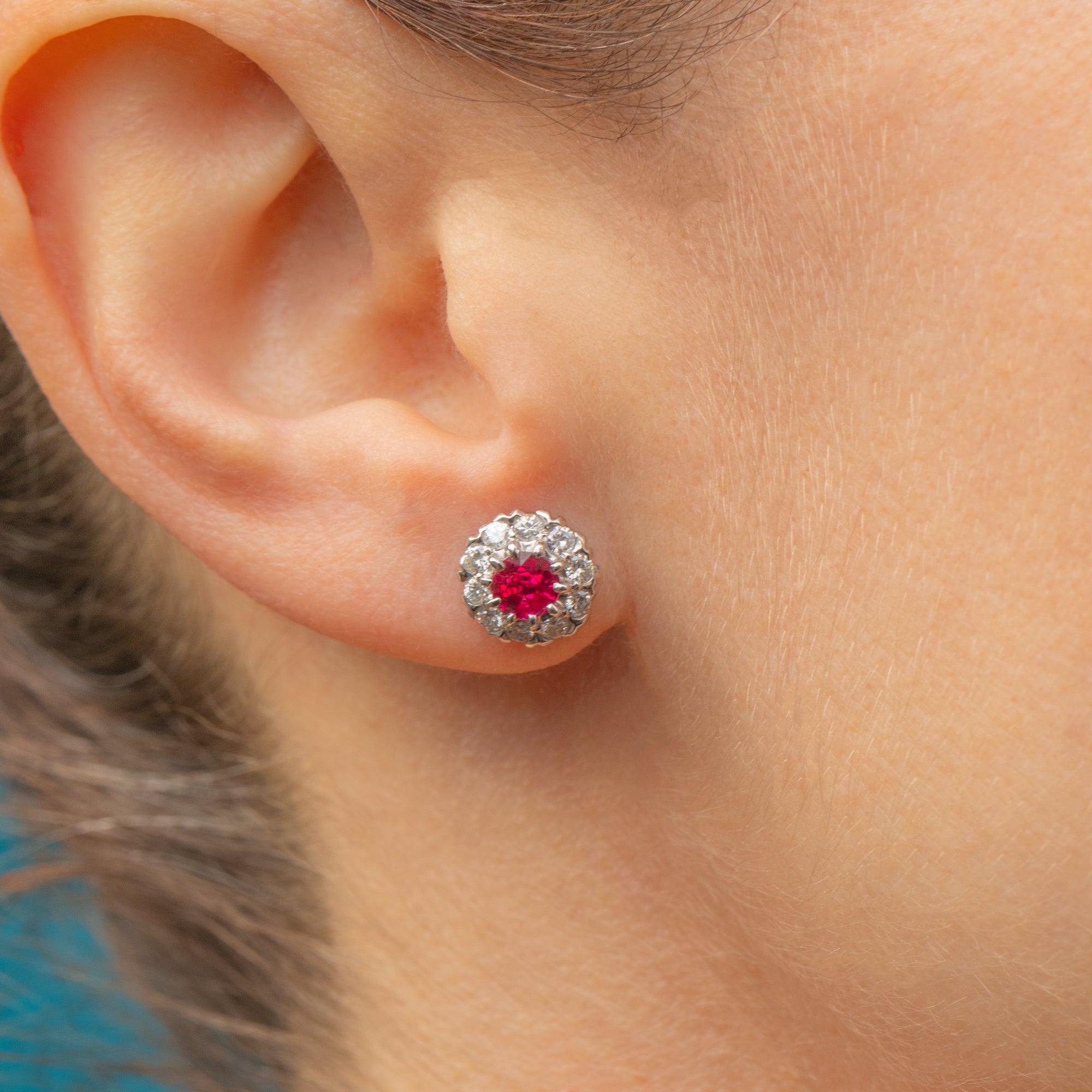 Each vintage stud features a richly saturated Ruby, radiating stunning fuchsia hues. They are haloed by scintillating natural Diamonds and set within lustrous 18ct White Gold settings.