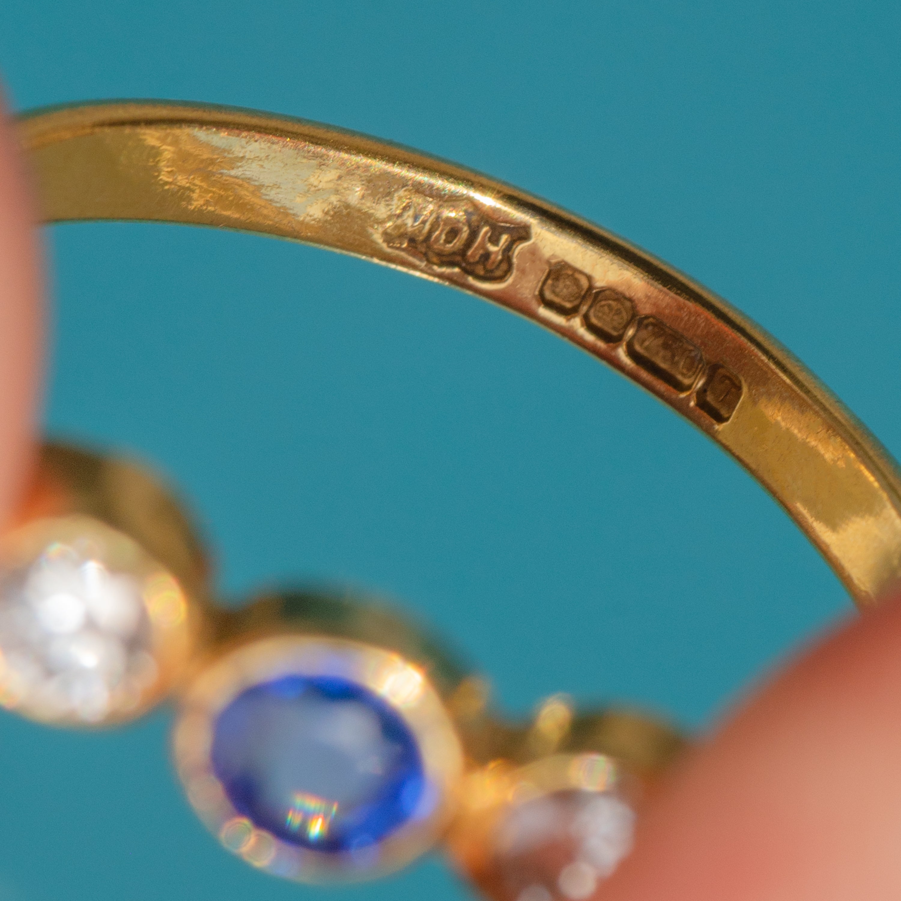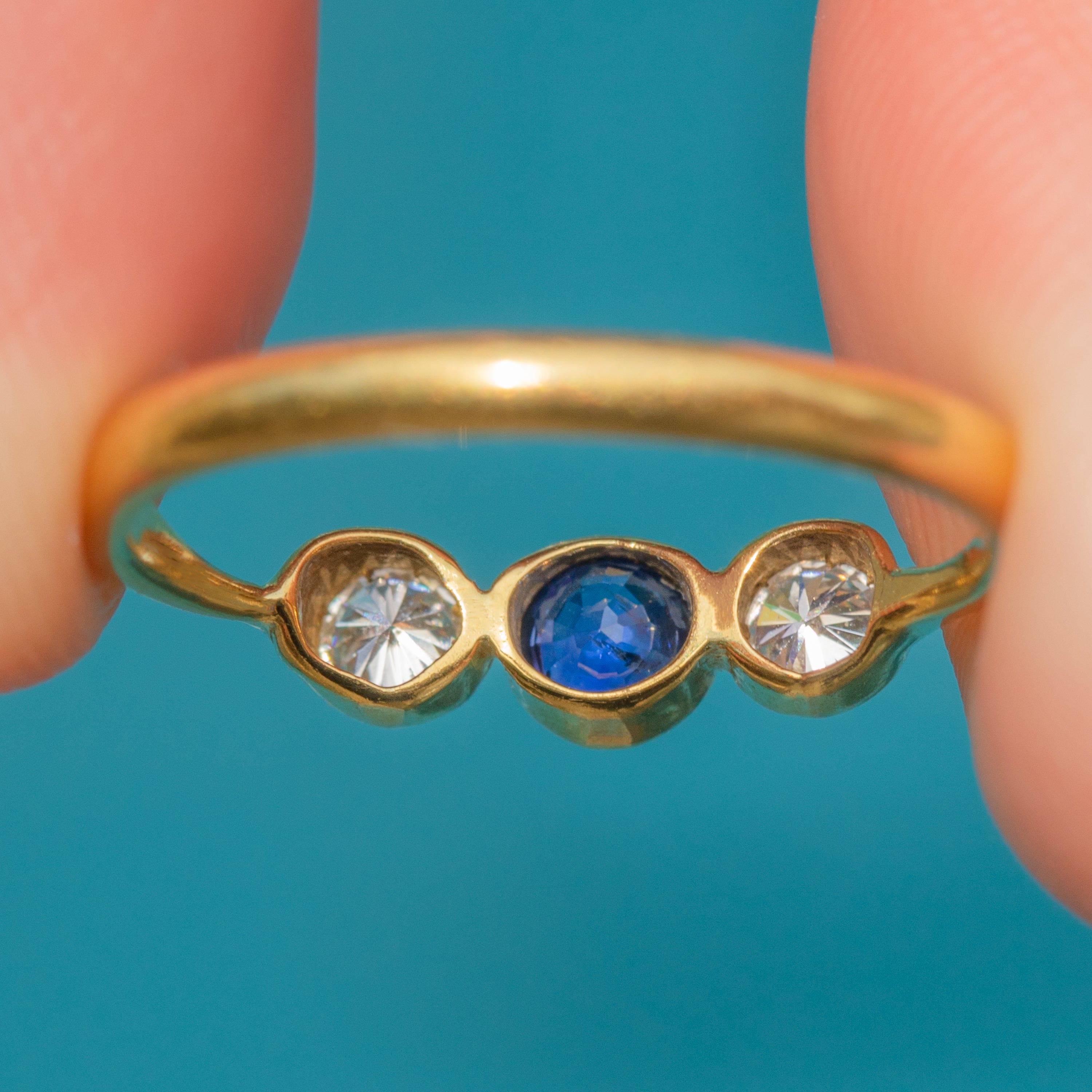 EXCELLENT: This 18ct Gold Sapphire Diamond trilogy ring is in excellent condition. The gemstones are radiant and sit securely within their settings, free from fleabites or abrasions. Her Gold is bright and buttery, with only minor surface wear commensurate with age. Fully hallmarked to 1993, this vintage ring is a great piece!