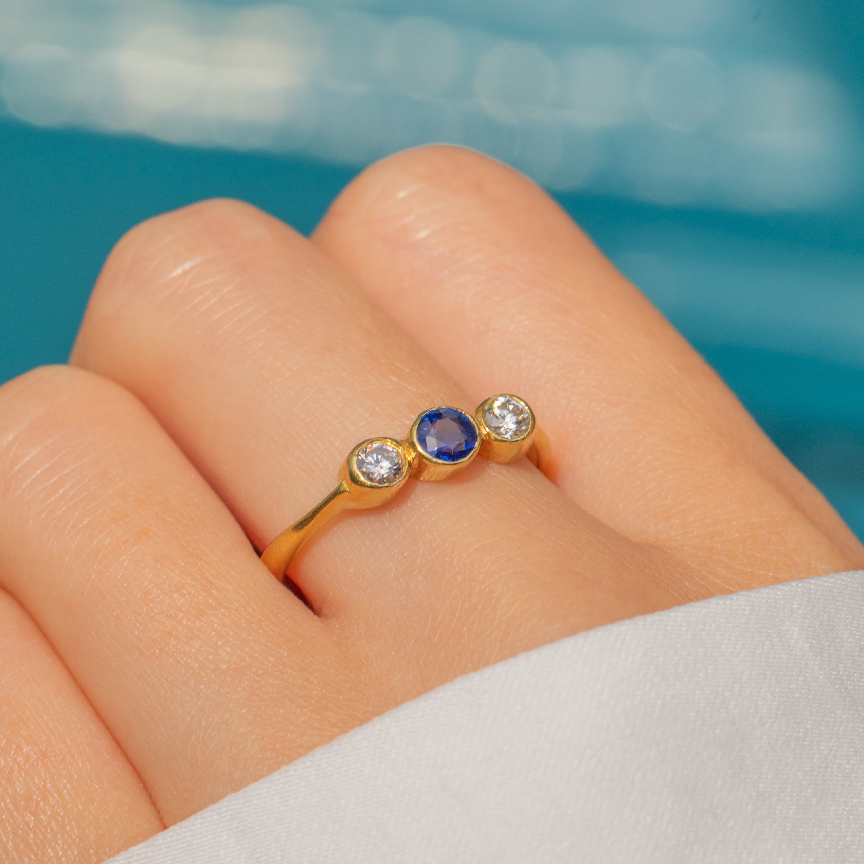 This 18ct Gold Sapphire Diamond trilogy ring is a stunning vintage piece. Boasting a mesmerising central Sapphire with a deep midnight blue hue flanked by two scintillating Diamonds, this vintage ring looks as though she has been plucked from a winter's night sky!