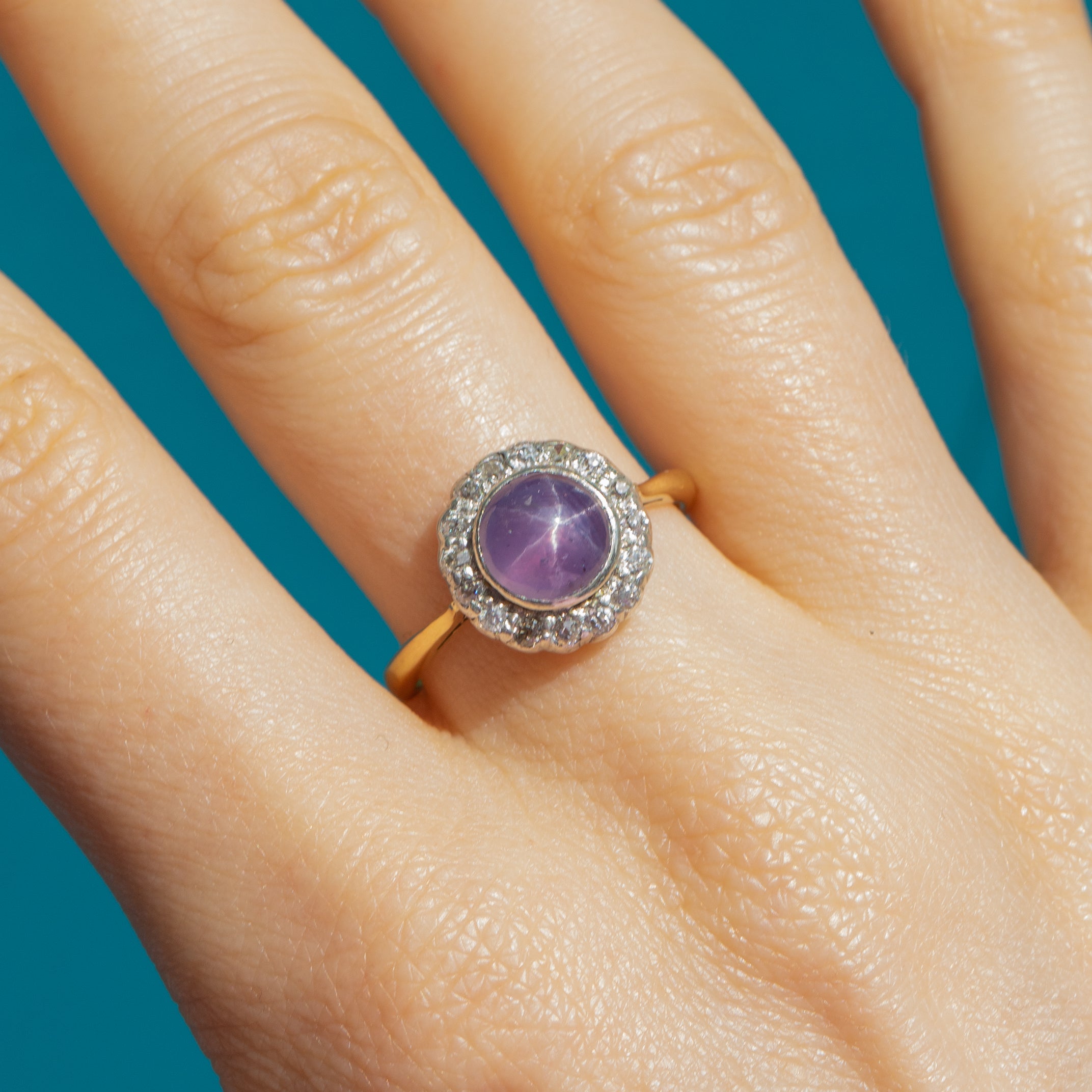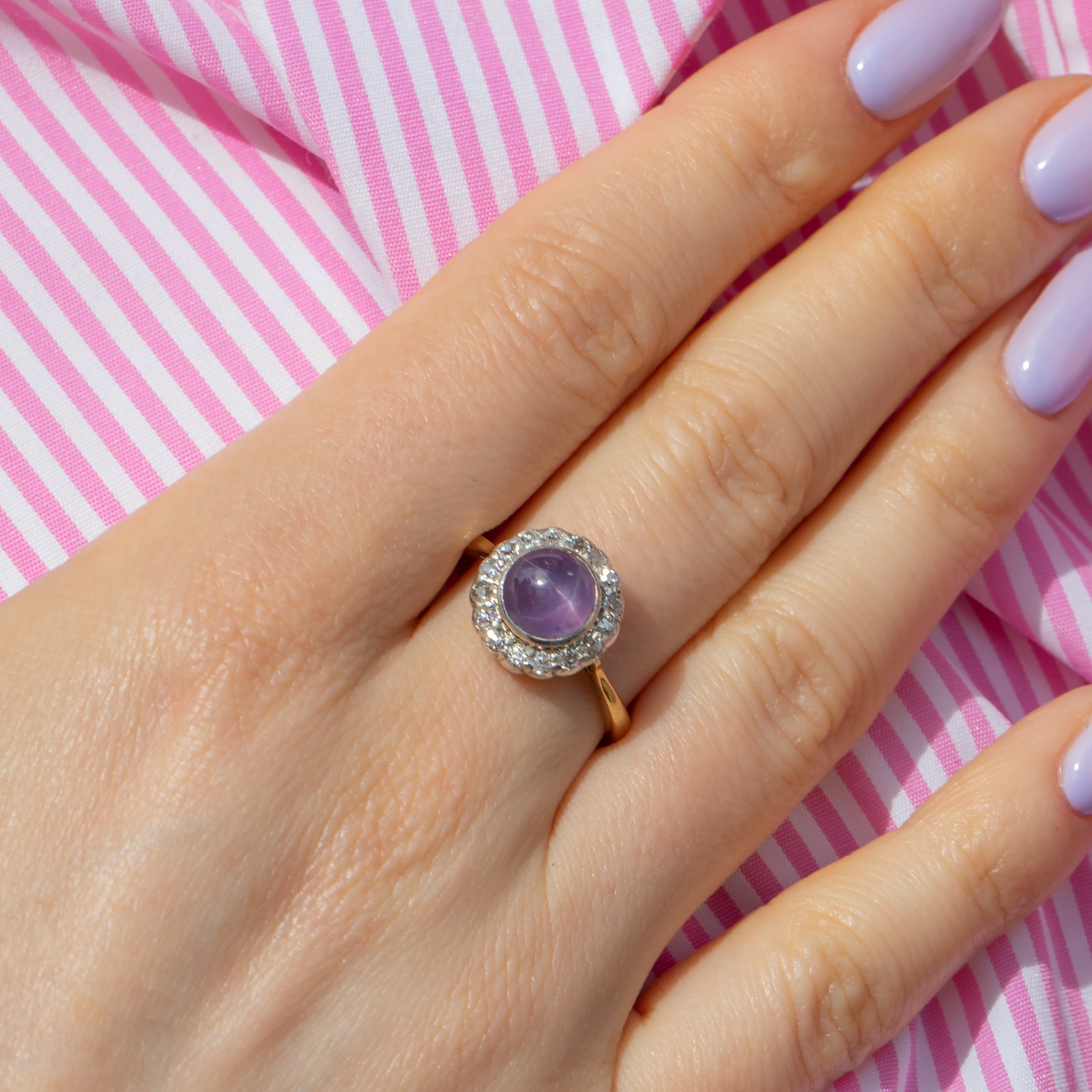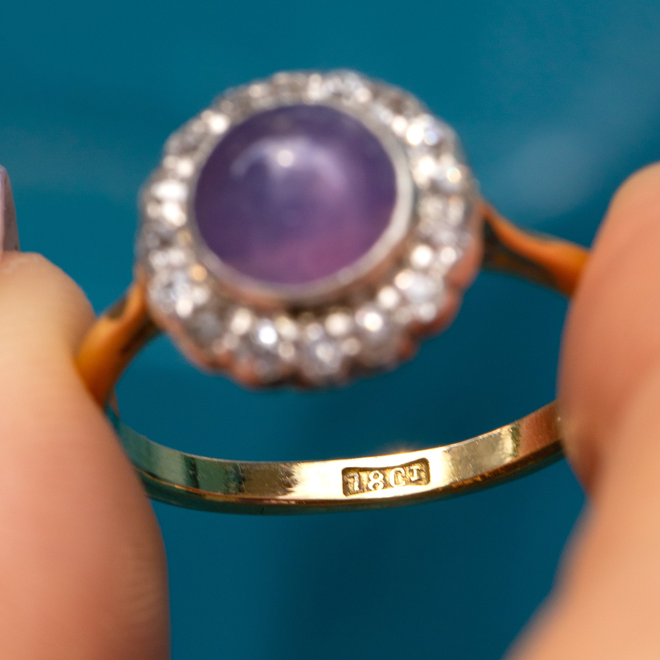 We are pleased to introduce this exquisite Victorian 18ct Gold star Ruby cabochon Diamond cluster ring, a timeless masterpiece crafted to captivate your attention! Nestled within a lustrous Golden embrace, the lavender-hued 3.00ct star Ruby cabochon is surrounded by a halo of scintillating Diamonds creating a truly spectacular piece.