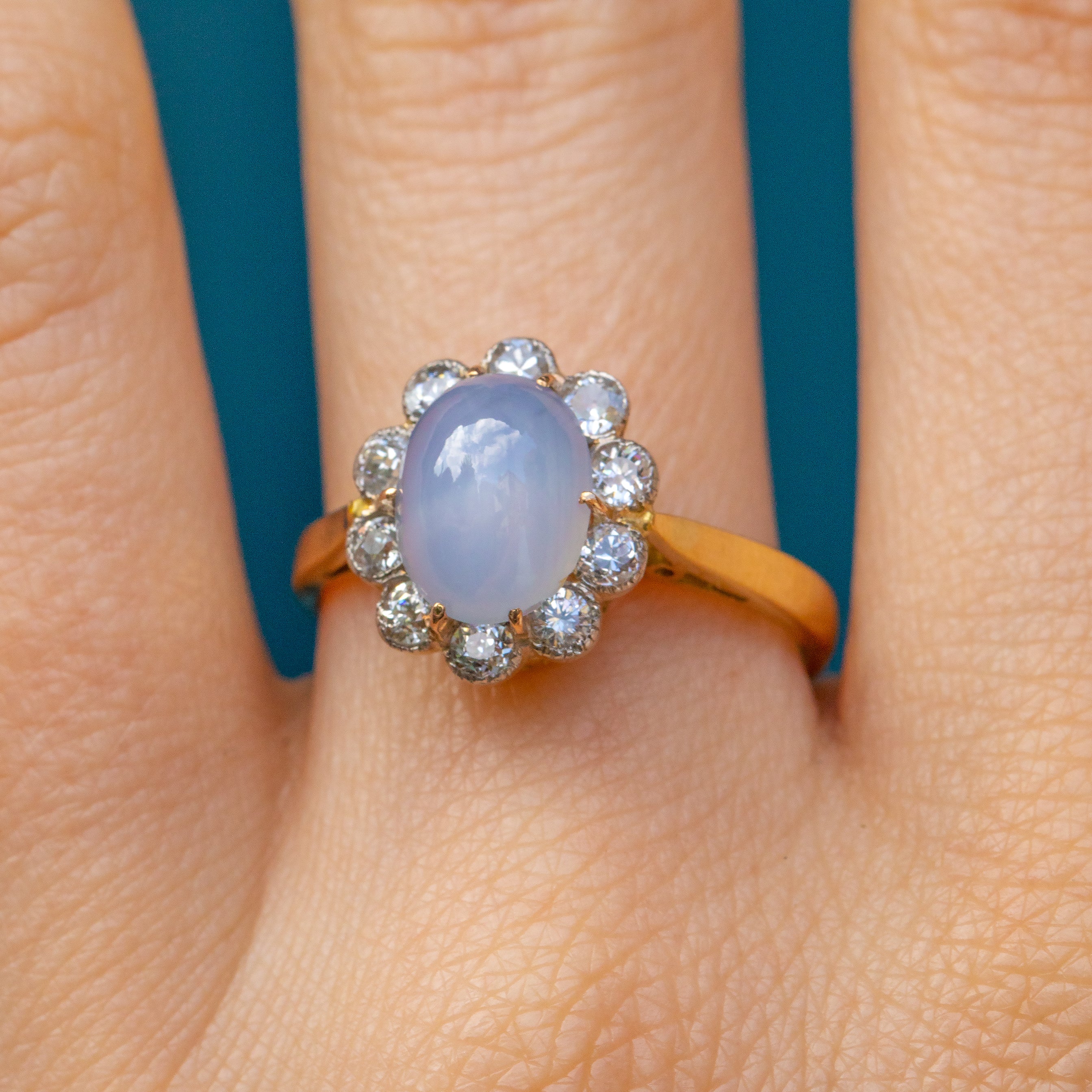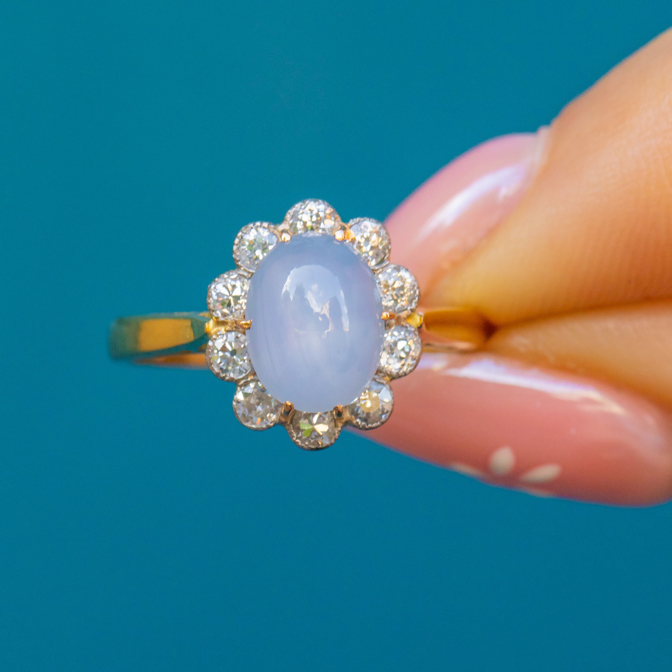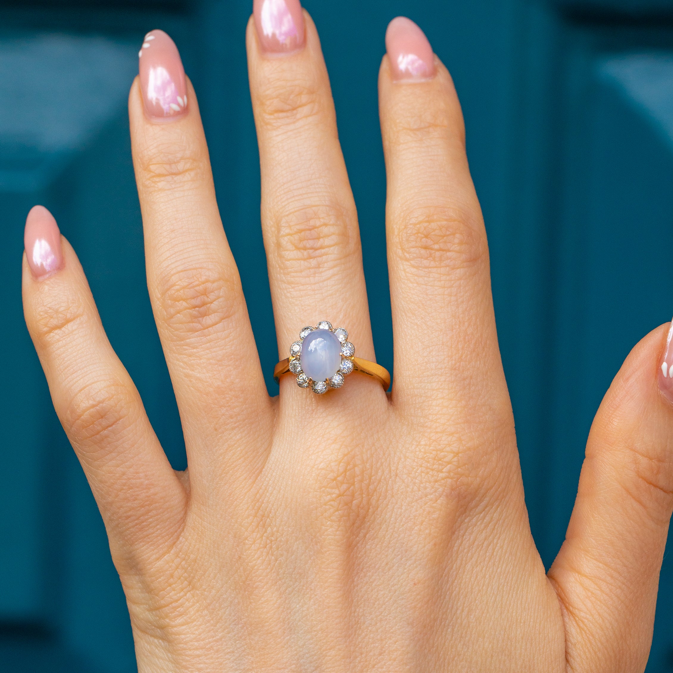 The 'star' effect visible in this gem, also known as asterism, is caused by light refracting off rutile silk inclusions, creating the star-like reflection that celestial lovers dream of. A sea of scintillating Diamonds halo the show-stopping Sapphire, creating a soft scallop edge that emanates floral femininity.